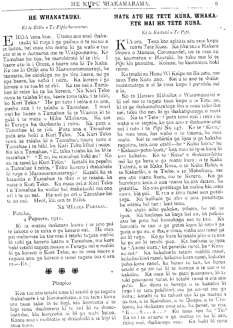 HE KUPU WHAKAMARAMA. 9 HE WHAKATAUKI. Ki te Etita o Te Pipiwharauroa. EHOA tena koe. U taina atu enei whaka- tauki ki runa i na paihau o te manu a te katoa hei mau atu mana ki na wahi e tau atu ai ia o Aotearoa me te Waipounamu. Ko Tamahae he toa, he marohirohi ki te riri. I haere atu ia i Orete, e haere ana ki Te Kaha. Ka tae ki Otiki ara ki Maramaramaterangi, he taumata, he okiokinga no nga tira haere, no na ope haere, ka noho i reira. Ka korero i na korero o te toa ki te riri. Ka tae nei a Tama- hae ki reira ka tu ka korero, " Na Kuri Teko rawa te taiaha ki au, haere tonu taku i te hiki, ko Kuri Teko." He pu tutu i reira e tu ana, puehu ana i te taiaha a Tamahae. I muri mai ka haere a Tamahae ki te Wairoa ki te naki i te mate o Hika Whakama. Ka tae ki Turanga ka whawhaitia i reira. Ka puta a Tamahae ki te riri. Puta ana a Tamahae puta ana hoki a Kuri Teko. Na Kuri Teko rawa te taiaha ki a Tamahae, haere tonu a Tamahae i te hiki, ko Kuri Teko kihai i mate. Ka ki a Tamahae, " E, taku taiaha ka he ki te marahea!" " E ta, he marahea hoki au! Ko au ra tenei ko Kuri Teko." Katahi ka pepeha a Tamahae i reira, " Taku korero i whakaheia ki runga o Maramaramaterangi . Katahi ka ta katautia e Tamahae te whiu o te taiaha, ka mate a Kuri Teko. Ka mate nei a Kuri Teko i a Tamahae ka waiho hei whakatauki ma ona uri i te ao nei. He nui nga uri o Tamahae kei te ao nei. Heoi, kia ora te Etita. Na WHAAKA PARAKAU. Potaka, 4 Pepuere, 1911 [Ki ta matou whakaaro kaore i te tino pai te takoto o te mita o na korero nei. He mea pai mehemea ka tae mai i tetahi tanata mohio ki tuhi nga korero katoa o Tamahae, me kore hoki tetahi tangata matau o Turanga nei e mohio ki na korero o Kuri Teko, no te mea kaore e rangona ana nga korero o tenei tanata toa o era ra.—ET. Pitopito Kua tae atu tetahi tono ki tetahi o na tanata whakahaere i te Koroneihana, a na tera i kawe atu taua take ki te kini, kia korerotia e te kini tona whaikorero ki te iwi ki ro whono- karawhe, kia korerotia ai ki nga wahi katoa. Kaore ano i mohiotia te whakahoki a te kini ki taua tono. MATE ATU HE TETE KURA, WHAKA- ETE MAI HE TETE KURA. Ki te Kaituhi o Te Pipi. KIA ora. Tena koa apititia atu enei kupu mo te Tete Kura. Ka tika tau e Hakere Brown o Manaia, Coromandel, no te mea na na kaumatua o Hauraki, he tuku tau ki te Pipi kia panuitia. Koiana, he kaumatua hoki rato u. Ko tetahi na Hone Wi Kaipo no Rahotu, mo taua Tete Kura ano. Kei a ia ano te whaka- maramatanga e ai ki tana kupu i panuitia nei e ia. Ko ta Henare Mahuika o Waiomatatini e ki nei mo te tanata taua kupu a te Tete, ae, ki ta na whakamaharatanga iho o mua tuku iho nei, tuku iho nei, ki na whakatipuranga o muri nei. Ko te "Tete" i puta tonu mai i roto i te waha o te tangata, ko tau ano e whakamarama nei i roto i te Pipi No 147 Ko te " Kura," he mea tena, kei waho o te tinana, he mea mahi. Kei te mohiotia na ingoa o na kakahu rangatira, tera ano etahi—he " Kahu kura," he " Kakanu-poho-kura," kua mau te ingoa kura ki ena kakahu. Ko te " Kura" e whakataukitia nei ko nga kura o na manu kura: o te Kaka Tuauru, o te Kaka Kura, o te Kaka Reko, o te Kakariki, o te Tieke, o te Mohokura, me era atu manu kura, me te Kereru. Ko na huruhuru kura o aua manu ka ata whatua, ka putoitia Ko aua putoitanga ka mahia kia mau rawa, kia pai. E rua e toru ranei aua putoi- tanga. Ka huihuia na aho o aua putoitanga ka miroia hei tau: kati tena. Ko etahi niho pakake, tohora, he rei te ingoa. Ka haehaea ka hana hei au, ka pokaia ano he puta hei komokanga mo te tau. Ka komotia te tau o nga putoi kura ki roto i nga puta o na au, e wha, e rima, maha atu ranei na au ki runga. Ko na kura ki tetahi pito u te tau ko na au ki tetahi pito. Ka huihuia te ingoa be " Au-rei-kura," ka peneitia ranei, he " Kura- au-rei." Ka kakahuria tetahi mahiti ranei, kakahu-kiwi ranei, kakahu-kura ranei, kakahu poho-kura ranei, ka herea te tau, ka herea tetahi o na au rei ki te haerenga o te tau o te kakahu. Ka mau ki te patu pounamu, ki te toki pounamu ranei, ki tetahi ranei o era atu patu. Ka whiua te herenga u te kakahu ki rana i te tara pakihiwi, me na au-rei me nga kura; katahi ia ka tahuri atu ki na matua a nga tua, a te Kairakau, a te Ngaupa, a te Uru- tomo, ka whakatau oma atu, ka penei, te reo, " E ... u ... a ..." Ko taua reo he "Te." Ka tu i te aroaro o na matua ra ka ki atu, titiro mai, whakarongo mai. Ka huki ki tona