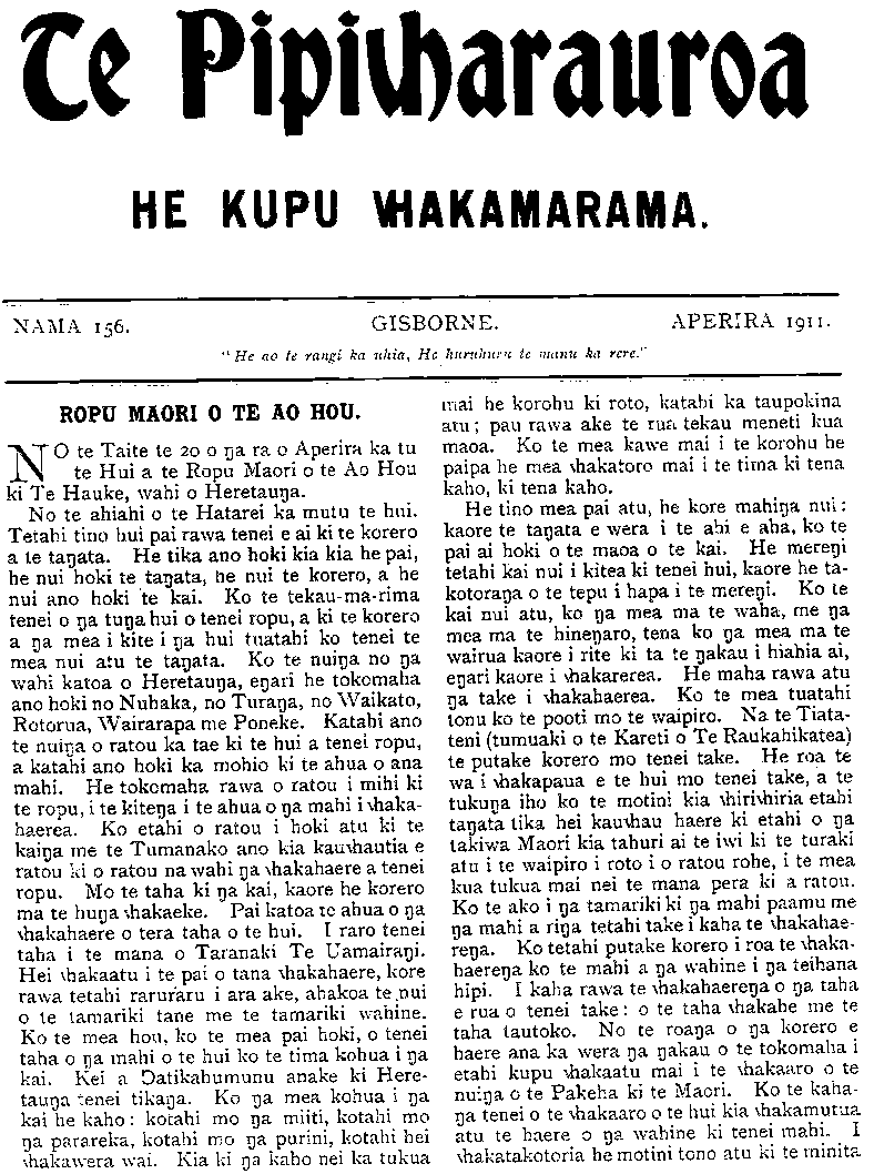 Te Pipiwharauroa HE KUPU WHAKAMARAMA. NAMA 156. GISBORNE. " He ao te rangi ka uhia, He huruhuru te manu ka we." APERIRA 1911. ROPU MAORI O TE AO HOU. NO te Taite te 20 o nga ra o Aperira ka tu te Hui a te Ropu Maori o te Ao Hou ki Te Hauke, wahi o Heretaunga. No te ahiahi o te Hatarei ka mutu te hui. Tetahi tino hui pai rawa tenei e ai ki te korero a te tangata. He tika ano hoki kia kia he pai, he nui hoki te tangata, he nui te korero, a he nui ano hoki te kai. Ko te tekau-ma-rima tenei o nga tunga hui o tenei ropu, a ki te korero a nga mea i kite i nga hui tuatahi ko tenei te mea nui atu te tangata. Ko te nuinga no nga wahi katoa o Heretaunga, engari he tokomaha ano hoki no Nuhaka, no Turanga, no Waikato, Rotorua, Wairarapa me Poneke. Katahi ano te nuinga o ratou ka tae ki te hui a tenei ropu, a katahi ano hoki ka mohio ki te ahua o ana mahi. He tokomaha rawa o ratou i mihi ki te ropu, i te kitenga i te ahua o nga mahi i whaka- haerea. Ko etahi o ratou i hoki atu ki te kainga me te Tumanako ano kia kauwhautia e ratou ki o ratou na wahi nga whakahaere a tenei ropu. Mo te taha ki nga kai, kaore he korero ma te hunga whakaeke. Pai katoa te ahua o nga whakahaere o tera taha o te hui. I raro tenei taha i te mana o Taranaki Te Uamairangi. Hei whakaatu i te pai o tana whakahaere, kore rawa tetahi raruraru i ara ake, ahakoa te nui o te tamariki tane me te tamariki wahine. Ko te mea hou, ko te mea pai hoki, o tenei taha o nga mahi o te hui ko te tima kohua i nga kai. Kei a Ngatikahungunu anake ki Here- taunga tenei tikanga. Ko nga mea kohua i nga kai he kaho: kotahi mo nga miki, kotahi mo nga parareka, kotahi mo nga purini, kotahi hei whakawera wai. Kia ki nga kaho nei ka tukua mai he korohu ki roto, katahi ka taupokina atu; pau rawa ake te rua tekau meneti kua maoa. Ko te mea kawe mai i te korohu he paipa he mea whakatoro mai i te tima ki tena kaho, ki tena kaho. He tino mea pai atu, he kore mahinga nui: kaore te tangata e wera i te ahi e aha, ko te pai ai hoki o te maoa o te kai. He merengi tetahi kai nui i kitea ki tenei hui, kaore he ta- kotoranga o te tepu i hapa i te merengi. Ko te kai nui atu, ko nga mea ma te waha, me nga mea ma te hinengaro, tena ko nga mea ma te wairua kaore i rite ki ta te ngakau i hiahia ai, engari kaore i whakarerea. He maha rawa atu nga take i whakahaerea. Ko te mea tuatahi tonu ko te pooti mo te waipiro. Na te Tiata- teni (tumuaki o te Kareti o Te Raukahikatea) te putake korero mo tenei take. He roa te wa i whakapaua e te hui mo tenei take, a te tukunga iho ko te motini kia whiriwhiria etahi tangata tika hei kauwhau haere ki etahi o nga takiwa Maori kia tahuri ai te iwi ki te turaki atu i te waipiro i roto i o ratou rohe, i te mea kua tukua mai nei te mana pera ki a ratou. Ko te ako i nga tamariki ki nga mahi paamu me nga mahi a ringa tetahi take i kaha te whakahae- renga. Ko tetahi putake korero i roa te whaka- haerenga ko te mahi a nga wahine i nga teihana hipi. I kaha rawa te whakahaerenga o nga taha e rua o tenei take: o te taha whakahe me te taha tautoko. No te roanga o nga korero e haere ana ka wera nga ngakau o te tokomaha i etahi kupu whakaatu mai i te whakaaro o te nuinga o te Pakeha ki te Maori. Ko te kaha- nga tenei o te whakaaro o te hui kia whakamutua atu te haere o nga wahine ki tenei mahi. I whakatakotoria he motini tono atu ki te minita