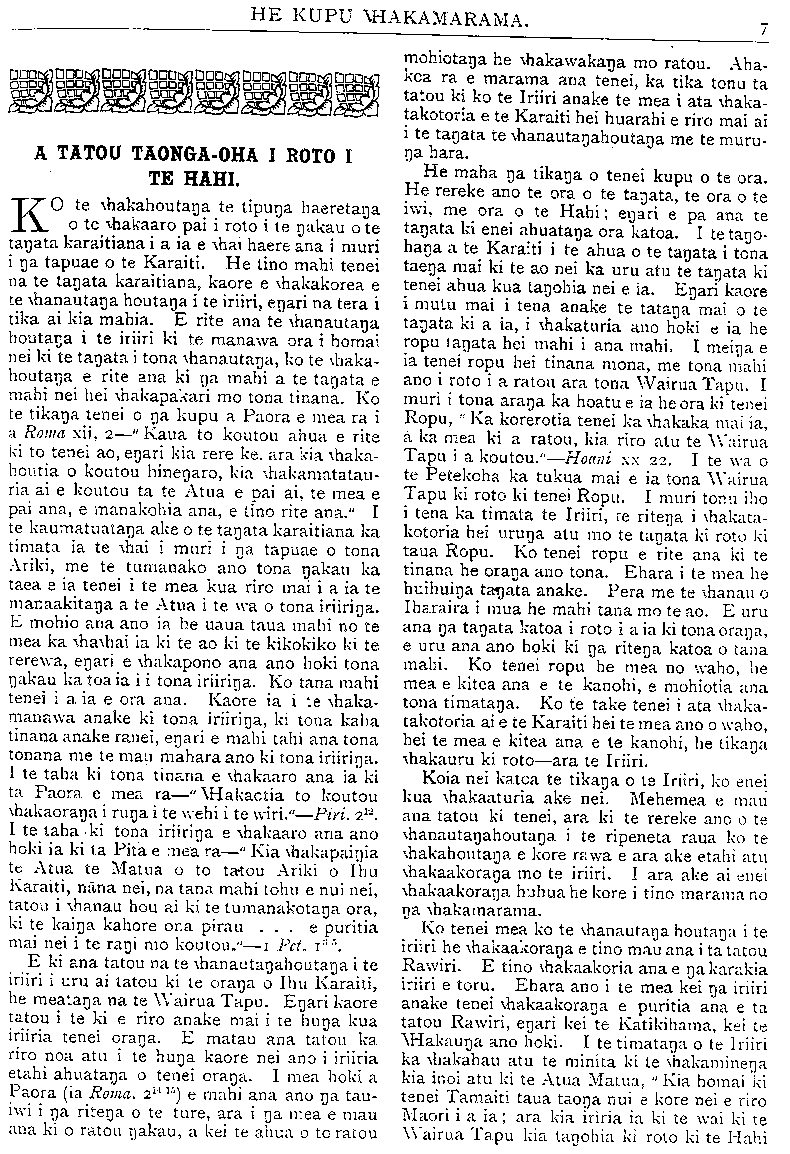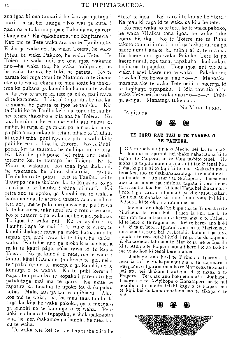 IO TE PIPIWHARAUROA. ana ingoa ki ona tamariki he karangarangatanga i muri i a ia, hei uiuinga, "No wai nga kura, i ngaua na e to korua papa e Tahania me nga roro i kainga na? Ka whakahuatia, " no Rangitarewa." Kati mo te Tete waka ara mo te Tauihutete. E wha nga waka nei, he waka Toiera, he waka Pitau, he waka Pakoko, he waka Tete. Te Toiera he waka nui, me ona ingoa wakanui ano—he waka tau, he waka puhipotae, he he waka taroro, he tuki, he parata. Ko te parata kei runga tonu i te Matatara o te tinana ake o te waka, ehara i te mea hoatu ka whaka- iroa ka pukana nga kanohi ka hamana te waha ka tarewa te arero ka tete nga niho, pani rawa ki te karamea. I kiia ai te parata, he ika kai te moana he parata te ingoa he taniwha. Kia te Puki ko te Tauihu kei runga tonu i te tauihu nei tetara whakairo e kiia ana he Toiera. Ko ona huruhuru kereru me etahi atu manu ka mahia ki runga ki nga rakau pai e rua, ka herea nga pito o aua rakau ki tetahi taha o te Tauihu.. ki tetahi taha, puhi rawa na pito o waho ki te puhi kereru ka kiia he Taroro. Ko te Puhi- potae, kei te taurapa, he mahinga nui to tera. Ka kiia ne puhipotae hei reira ano tetahi whakairo kei te taurapa he Toiera. Ko te Pitau he wakanui. Ko tona ingoa whakanui, he wakataua, he pitau, whakareia, rangiwhiu. . He whakairo te pitau. Kei te Tauihu, kei te Taurapa me te whakarei ko te Ringawhiu ko nga ringaringa o te Tauihu i whiua ki muri. Kei reira ano te upoko, na kanohi me te waha e hamama ana, te arero e whatero ana na niho e tete ana, me te puku me nga waewvae pani rawa ki te karamea, ruku tonu atu ki roto o te ngaru. Ko te tuatoru o nga waka nei he vvaka pakoko. Te ingoa he waka nui. Ko te upoko o te Tauihu i anga ke mai ki te ri u o te waka, tu kanohi whakairo rawa na moko katoa ano he tangata ora, pani rawa ki te hinu, hei whaka- wahi. Ka tuhia ano na moko kua haehaetia ra ki te kauri pango, poha rawa ki te kapia Toera. Ko nga kanohi e moe, me te waha i kumu, kihai i hamama (no konei te ingoa nei a te " pakoko," no te moenga o nga kanohi, no te kumunga o te waha). Ko te puhi kereru i runga i te upoko ko te kopako i parea atu hei patukitanga mai ma te ngaru. Ka mate te rangatira ka tapahia te upoko ka whakapako- kotia. Maha atu nga tau e tangihia ai. Aha- koa nui te waka, roa, ka mau taua tauihu ki runga ka kiia he waka pakoko, nga te moenga u nga kanohi na te kumunga o te waha. Pera hoki te ahua o te tupapaku, e whakapakokotia ana, he mea whakamoe nga kanohi, he mea ku- ku te waha. Te waka tete kei te rae tetahi whakairo he " tete" te ingoa. Kei raro i te kauae he " tete." Ka mau ki runga ki te waka ka kiia he tete. Ko enei waka ko te tete, ko te waka pakoko, he waka Whaikai tona ingoa he waka tuku koura hii ika. Ko te Toiere me te Pitau takoto tonu ai i uta i roto i nga tawharau, ma na haere nunui anake ka manu ai ki te moana. Ka haere ano nga waka Pakoko, Tete ki na haere nunui, ope taua, tapakuha—kaihaukai, tangihanga tupapaku. Tona ingoa nui mo aua waka i enei haere mo te waka. Pakoko mo te waka Tete he waka mau " o—." Me whaka- marama ake te waka Tete nei i te haerenga ki te tangihanga tupapaku. I kiia rawatia ai te waka Tete nei, he waka mau " o—o—." Tuhi- nga a-ringa. Manatanga tukemata. Na MOHI TUREI. Rangitukia. TE TORU RAU TAU O TE TAANGA O TE PAIPERA. I nga whakamutunga o Maehe nei ka tu tetahi hui ma ki Ingarani, hei whakamaharatanga ki te tanga o te Paipera. ko te tanga tawhito tenei. Ke maha nga tangata nunui o Ingarani i tae ki tenei hui. I whai kupu mai te kingi ki te hui, i whakaatu mai i tona koa mo te whakamaharatanga i te mahi nui a nga tangata na ratou nei i tate Paipera. I mea mai ano ia he maha na miriona tangata i roto i ene; torn rau tau kua huri ki tenei Tanga hei whakamarie i roto i nga raruraru huhua i pa ki o ratou ngakau. Ko tona tumanako kia mau tonu tona iwi ki ta Paipera ki te oha a o ratou matua. I tae mai ano hoki he kupu ma te Tumuaki o te Marikena ki tenei hui. I mea ia kua tae ki te torn rau tau a Ingarani e herea ana e te Paipera ki te here o te rangimarie. Kei te herea ano hoki e ia ki tana here; a Ingarani raua ko te Marikena e mea; ma i a raua hei iwi kotahi: kotahi i na toto, kotahi i te reo. kotahi hoki i runga i te whakapono. E whakawhetai tahi ana te Marikena me te Ingarihi ki te Atua o te Paipera mona i here i te ao tawhito me te ao hou ki tenei here atahua. I whaikupu ano hoki te Pirimia o Ingarani. I mea ia ko te whakapumautanga o te rangimarie i waenganui o Ingarani raua ko te Marikena te kohatu pat atu hei whakamaharatanga ki te mana o te Paipera Tera atu ano hoki etahi atu i whaikupu. I kawea e te Akipihopa o Kanataperi me te nui noa iho o te minita tetahi kape a te Paipera ma te kingi, hei whakamaramatanga mo te tikanga o te hui.