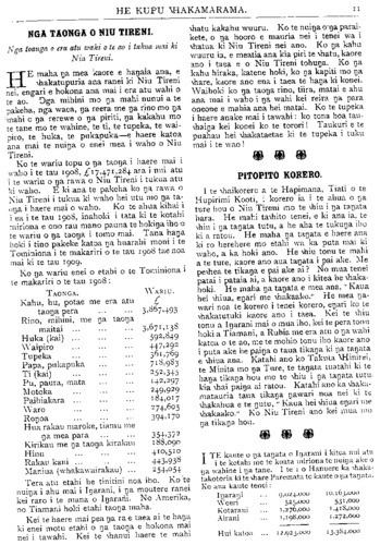 HE KUPU WHAKAMARAMA. 11 NGA TAONGA O NIU TIRENI. Nga toanga o era atu wahi o te ao i tukua mai ki Niu Tireni . HE maha nga mea kaore e hangaia ana, e whakatupuria ana ranei ki Niu Tireni nei; engari e hokona ana mai i era atu wahi o te ao. Nga mihini mo nga mahi nunui a te pakeha, nga waea, nga reera me nga rino mo nga mahi o nga rerewe o nga piriti, nga kakahu mo te tane mo te wahine, te ti, te tupeka, te wai- piro, te huka, te pukapuka—e haere katoa ana mai te nuinga o enei mea i waho o Niu Tireni. Ko te wariu topu o nga taonga i haere mai i waho i te tau 1908, £17,471,284 ara i nui atu i te wariu o nga rawa o Niu Tireni i tukua atu ki waho. E ki ana te pakeha ko nga rawa o Niu Tireni i tukua ki waho hei utu mo nga ta- onga i haere mai o waho. Ko te ahua kihai i i ea i te tau 1908, inahoki i tata ki te kotahi miriona e ono rau mano pauna te hokinga iho o te wariu o nga taonga i tomo mai. Tana hanga hoki i tino pakeke katoa nga huarahi moni i te Tominiona i te makariri o te tau 1908 tae noa mai ki te tau 1909 Ko nga wariu enei o etahi o te Tominiona i te makariri o te tau 1908: TAONGA. WARIU. Kahu, hu, potae me era atu £ taonga pera ... ... 3,867, 493 Rino, mihini, me nga taonga maitai ... ... ... 3,671,138 Huka (kai) ... ... ... 592,849 Waipiro ... ... ... 447, 292 Tupeka ... ... ... 361,769 Papa, pukapuka ... ... 718,983 Ti (kai) ... ... ... 252, 345 Pu, paura, mata ... ... 142, 297 Motoka ... ... ... 249,929, Paihiakara ... ... ... 184, 017 Waro ... ... ... 274, 605 Rongoa ... ... ... 394,170 Hua rakau maroke, tiamu me nga mea para ... ... 354.372 Kirikau me nga taonga kirakau 188, 090 Hinu ... ... ... 410,510 Rakau kaui ... ... ... 443,938 Maniua (whakawairakau) ... 254,054 Tera atu etahi he tinitini noa iho. Ko te nuinga i ahu mai i Ingarani, i nga moutere ranei kei raro i te mana o Ingarani. No Amerika, no Tiamani hoki etahi taonga maha. Kei te haere mai pea nga ra e taea ai te hanga ki enei motu etahi o nga taonga e hokona mai nei i tawahi. Kei te whanui haere te mahi whatu kakahu wuuru. Ko te nuinga o nga parai- kete, o nga hooro e mauria nei i tenei wa i whatua ki Niu Tireni nei ano. Ko nga kahu wuuru ia, e meatia ana kia piri te whatu, kaore ano i taea e o Niu Tireni tohunga. Ko nga kahu hiraka, katene hoki, ko nga kapiti mo nga whare, kaore ano ena i taea te hanga ki konei. Waihoki ko nga taonga rino, tiira, matai e ahu ana mai i waho i nga wahi kei reira nga para oneone e mahia ana hei matai, Ko te tupeka i haere anake mai i tawahi: ko tona hoa tau- whainga kei konei ko te torori! Taukuri e te puahau hei whakataetae ki te tupeka i tuku mai i te wao! ( PITOPITO KORERO. I te whaikorero a te Hapimana, Tiati o te Hupirimi Kooti, i korero ia i te ahua o na ture hou o Niu Tireni mo te whiu i nga tangata hara. He mahi tawhito tenei, e ki ana ia, te whiu i nga tangata tutu, a he aha te tukunga iho ki a ratou. He maha nga tangata e haere ana ki ro herehere mo etahi wa ka puta mai ki waho, a ka hoki ano. He whiu tonu te mahi a te ture, kaore ano aua tangata i pai ake. Me pewhea te tikanga e pai ake ai? No mua tenei patai i pataia ai, a kaore ano i kitea he whaka- hoki. He maha nga tangata e mea ana," Kaua hei whiua, engari me whakaako." He mea nga- wari noa te korero i tenei korero, engari ko te whakatutuki kaore ano i taea. Kei te whiu tonu a Ingarani mai o mua iho, kei te pera tonu hoki a Tiamani, a Ruhia me era atu o nga wahi katoa o te ao, me te mohio tonu iho kaore ano i puta ake he painga o taua tikanga ki na tangata e whiua ana. Katahi ano ko Takuta Whinirei, te Minita mo nga Ture, te tangata tuatahi ki te hanga tikanga hou mo te whiu i nga tanata tutu. kia whai painga ai ratou. Katahi ano ka whaka- matauria taua tikanga ngawari noa nei ki te whakahua e te ngutu, " Kaua hei whiua engari me whakaako." Ko Niu Tireni ano kei mua mo nga tikanga hou. ITE kaute o na tanata o Ingarani i kitea nui utu i te kotahi me te koata miriona te nuinga ake o na wahine i na tane. I te 1 o Hanuere ka whaka- takotoria ki te whare Paremata te kaute o nga tangata. Ko aua kaute tenei: Ingarani ... 9, 024.000 10.163 000, Weeri ... 525, 000 531, 000 Kotarani ... 1, 276, 000 1, 418, 000 Airani ... 1, 198, 000 1.272, 000 Hui katoa