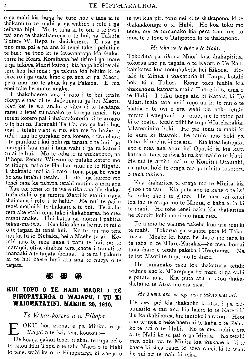TE PIPIWHARAUROA. o nga mahi kia hanga he ture hou e taea ai te whakamutu te mahi a nga wahine i roto i nga teihana hipi. Mo te taha ki te ora o te iwi i pai ano te whakahaerenga a te hui, na Takuta Tutere Wi Repa te whai-korero. E rua nga tino mea pai e pa ana ki tenei take i pahitia e te hui: he tono ki te kawanatanga kia whaka- turia he Roera Komihana hei titiro i nga mate o nga takiwa Maori katoa; kia hanga hoki tetahi ture hou hei mea i nga takuta kia hihiko ki te tirotiro i nga mate kino e pa ana ki nga Maori, pera ano me te ahua ki nga Pakeha. E rua enei take he nunui anake. I whakahaerea ano i roto i te hui tetahi tikanga e taea ai te whakamama nga hui Maori. Kati kei te wa anake e kitea ai te taeatanga ranei o tenei tumanako te korenga ranei. Ko tetahi korero pai i whakatakotoria ki te aroaro o te hui na Taranaki Te Ua, mo nga kai i hua mai i tetahi wahi e rua eka me te hawhe te rahi; ano he purakau ona korero, otira ehara i te purakau i kai hoki nga tangata o te hui i nga merengi i hua mai i taua wahi i nga ra katoa i tu ai te hui. Mo te taha ki te whakapono, na Pihopa Renata Wiremu te putake korero mo te tipunga maio te Hauhau raua ko te Ringatu. I whakaatu mai ia i roto i tona pepa he wehe ke ano tetahi i tetahi. I roto i nga korero mo tenei taha ka pahitia tetahi motini, e mea ana " Kua tae tenei ki te wa e tika ana kia whaka- turia etahi o nga minita Maori ki etahi turanga whaimana i roto i te hahi." He nui te pai o tenei motini ki te whakaaro a te hui. Tera ake tera ake etahi o nga take i whakahaerea, he mea nunui anake. Hui katoa nga motini i pahitia tekau-ma-iwa. Kua kiia ake ra he nui te mihi o te tangata ki tenei hui. Ko te hui mo tera tau ka tu ki Nuhaka, hei a Maehe tu ai. Ko- tahi ano te mea nana i patu te hui, na te marangai, otira ahakoa tera kaore i tamati te manaaki a te tangata whenua. I te ra i pakaru ai te hui haere hari atu ana te nuinga o te tangata. HUI TOPU O TE HAHI MAORI I TE PIHOPATANGA O WAIAPU, I TU KI WAIOMATATINI, MAEHE 20, 1910. Te Whai-korero a te Pihopa. E OKU hoa aroha, e nga Minita, e nga Mangai o te iwi, tena koutou:— He koanga ngakau tenei ki ahau te tunga nei o to tatou Hui Topu o te taha Maori o te Hahi ki tenei wahi ke o te Pihopatanga, ki waenga o te iwi kua piri tonu nei ki te whakapono, ki te whakaakoranga o te Hahi. He koa toku mo tenei, me te tumanako kia pera tonu me to mua te u tonu o Ngatiporou ki te whakapono. He tohu no te tupu o te Hahi. Tokorima nga rikona Maori kua whakapiritia, tokorua ano nga tangata o te Kareti o Te Rau- kahikatea kua motuhaketia hei Rikona. Ko- tahi te Minita i whakaturia ki Taupo, kotahi hoki ki a Tuhoe. Kanui toku hiahia kia whakahokia katoatia mai a Tuhoe ki te uma o te Hahi. I toku taenga atu ki Karaia, ki Te Whaiti inaia tata nei i rongo au ki te nui o te hiahia o te iwi o era wahi kia noho tetahi minita i waenganui i a ratou, me to ratou pai ki te hoatu i tetahi puhi he tunga Wharekarakia, Whareminita hoki. He pai tonu te mahi ki te kura ki Ruatoki, he tauira ano hoki nga tamariki o reira ki era atu. Kia kitea hetangata ano e mea ana ahau hei Opotiki ia kia kapi katoa ai taua takiwa ki nga kai mahi o te Hahi. He nui te aroha mai o te Komiti i Otautahi, na ratou hoki te oranga mo nga minita tokotoru o taua takiwa. Kua whakaritea te oranga mo te Minita kia £100 i te tau. Kia puta ano te kaha o te iwi ka nuku ake i te £1oo. He mea nui tenei kia tau te oranga mo te Minita, e kaha ai ia ki te mahi. He tohe tenei naku kia whakaritea he Komiti kohi moni mo taua mea. Tera ano he wahine pakeha kua uru mai ki te mahi. Tokorua nga wahine pera ki Toko maru. Meake ka hanga he whare mo raua ki te taha o te Whare-Karakia—he mea homai taua whare e tetahi pakeha i Heretaunga. Na te iwi Maori te tunga mo te whare. He tumanako taku kia whakaturia tetahi wahine ano ki Whareponga hei mahi ki nga wahi e patata ana. Kia puta atu a tatou whaka- whetai ki te Atua mo era mea. He Tumanako mo nga tau e takoto mai nei. He mea pai kia whakaoho koutou i nga tai- tamariki e tau ana kia haere ki te Kareti ki Te Raukahikatea, kia tautoko i a ratou. Heoi ano te mea e heke haere ai te kaha o te Reinga ko te ora o te Hahi. Ko te mea hoki e ora ai te Hahi ko te pai o nga Minita. Ko tetahi mea hoki ma te Minita kia whakaae ia ki te haere ki whea ranei ki whea ranei, ki te wahi he nui nei te mahi ki reira.