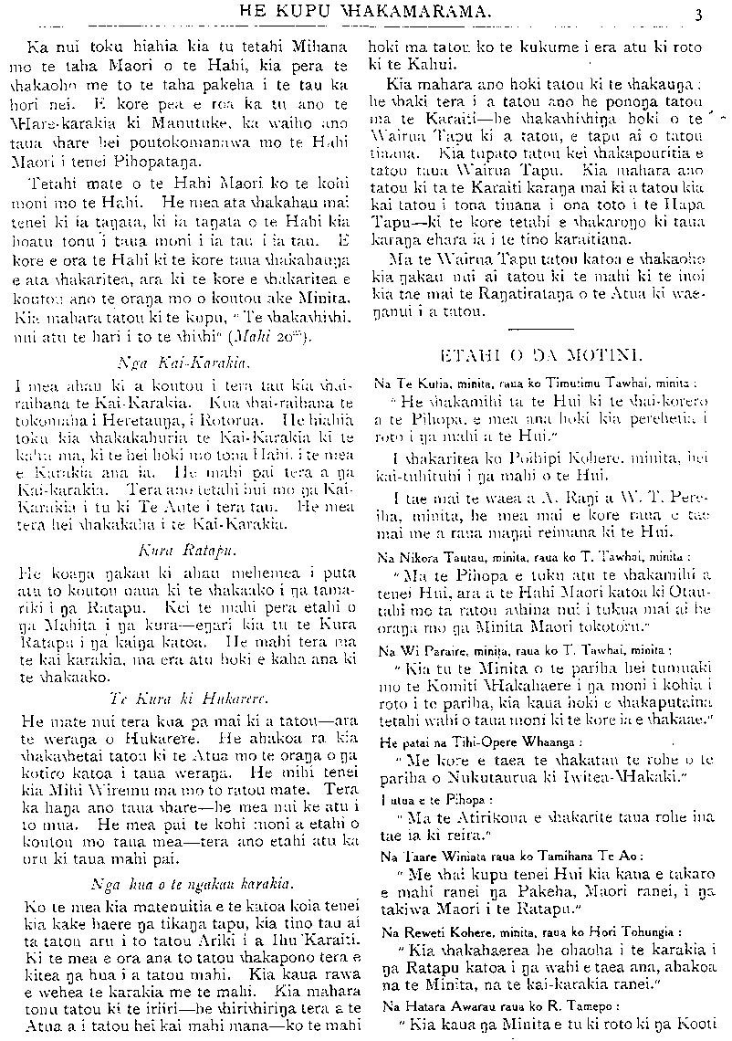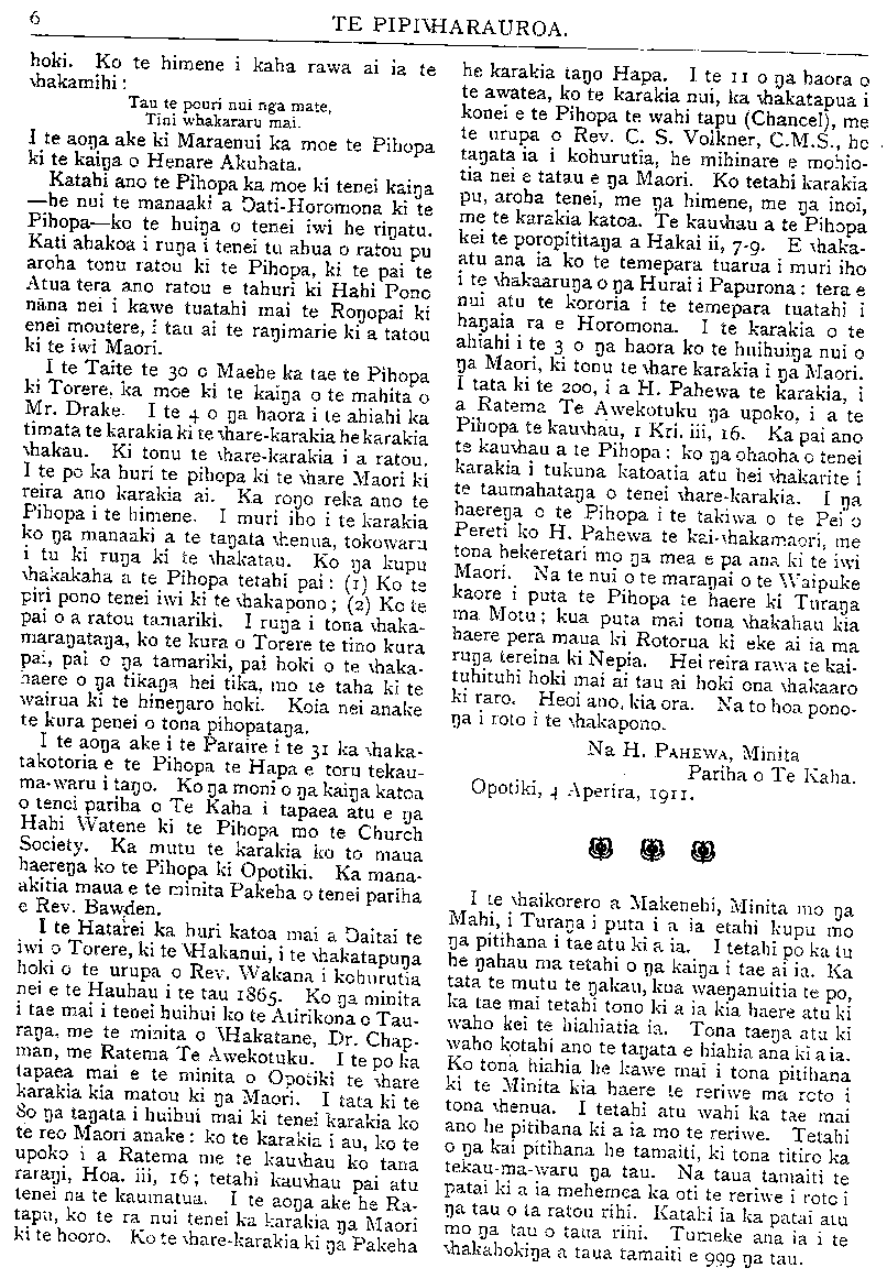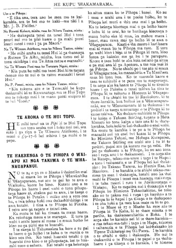HE KUPU WHAKAMARAMA. Utu a te Pihopa: " E tika ana, tera ano he mea mo te kai- karakia, ara te hei mo te kaki—me tiki i a Mr. J. B. Fielder." Na Reweti Kohere, minita, raua ko Nikora Tautau, minita: "He whakaputa tenei na tenei Hui i tona pouri nui mo te piki haere o nga mahi purei kaari moni i roto i nga pa Maori." Na Te Wirernu Atirikona, raua ko Nikora Tautau, minita: " He mihi aroha ta tenei Hui ki nga whanaunga o Rutene Te Aihu, minita, kua tomo nei ki tona okiokinga i ma Te Atua ratou e manaaki." Na Te Wheoro Pom raua ko Turuturu Ngaki, minita: " Kia puta he mihi ma tenei Hui ki te tangata whenua mo te nui o ta ratou manaaki i tenei Hui." Na P. Peneti, minita, raua ko Nikora Tautau minita: " Kia tukunga atu e te Tumuaki he kupu whakamihi ki te Kawanatanga ma te Hui Topu mo te tukunga mai i te mana pooti waipiro ki te iwi Maori." TE AROHA O TE HUI TOPU. HE mihi tenei na te Pipi ki te Hui Topu mo tona aroha nui i tuku mai nei, ma roto i na ringa o Te Wiremu Atirikona, i te moni e £9-17-6 hei awhina i nga mahi o te pepa. TE HAERENGA O TE PIHOPA O WAI- APU KI NGA TAKIWA O TE WHA- NAUAPANUI. NO te 24 o nga ra o Maehe i whakatika mai ai maua ko te Pihopa i Wharekahika ki Whangaparaoa, nui atu te pai ko te awa o Waikohu, kaore he kino. Katahi ano a te Pihopa ka haere i enei wahi o tona pihopa- tanga haere ai, ahakoa pai te awa, i te taenga o te Pihopa ki Potaka i maku ano a roto ona hu, e iwa tekau hoki ona whakawhitiwhitinga i te awa kotahi. 1 tina a te Pihopa ki Potaka. I reira ano nga tangata e tatari ana. Ka mutu te kai ka timata ta maua haere. Ka rokohanga maua e te marangai. E toru nga wahi i arahi haere ai maua i o maua hoiho he kino no nga piriti me te huarahi. I te ekenga ki Tahunaakea ka kore e tu pai te haere o nga hoiho i te kaha o te mania o te kino noa iho. Ko tenei huarahi tetahi o nga huarahi tino kino o te pihopatanga, kei te hua- rahi tonu o nehera. Kei tetahi o nga heketanga ka aitua maua ko te Pihopa i konei. Ko au i mua e arahi ana i te peeke hoiho, ko te Pihopa kei muri e whiu ana mai i nga hoiho. Ko te hekenga kinotanga mai o nga hoiho kaore e kaha ki te arai, ko te hurihanga kinotanga o maua hoiho eke ki mua, ka mahue maua i konei, mau rawa mai nga hoiho ki te awa o Whangaparaoa. Kaati e wha maero i kari haere mai ai maua ko te Pihopa ma raro. E toru nga wahi kino i hinga ai te Pihopa ki raro, kino katoa nga kakahu me nga hu i te paruparu. Kaore e taea hoki te aha koia nei ano nga aitua e pa mai ana ki nga Apotoro, a tae noa mai ki nga Pihopa. No te ahiahi po i tae atu ai maua ki Whangaparaoa, ka manaakitia e Te Manihera raua ko tona hoa. Ko te manaaki kaore e taea te tuhituhi e te pene me te mangumangu. I te aonga ake ka haere te Pihopa ki te tirotiro haere i nga Pakeha o tenei takiwa ka tina te Pihopa ki te teihana a Horouta ki Whangapa- raoa. I te ahiahi ka tae ki Raukokore, ki te whare-karakia, kua huihui ke a Whanauapara- naki, me te Whanauamaru ki te whakanui i te powhiri i te taenga tuaruatanga o te Pihopa ki to ratou takiwa. Ka whakamanuhiritia te Pihopa i te kainga o Takana Stirling, tungane o Hera Manaro ko tona kainga e tata ana ki tu whare- karakia, kora hoki te kai-whakaako o enei wahi. Ka mutu te karakia i te po a te Pihopa he manaaki nui na enei iwi katoa ki te Pihopa ko Himiona Tekani, me Hohepa Karapaina, me Takana Stirling me etahi atu i tu ki te powhiri, papai atu nga korero me nga mihi. He pai nga whakautu a te Pihopa, ko au ano tona reo i runga ano i te whakamaori. I te aonga ake he Ratapu, tekau-ma-waru i tango i te Hapa; e toru i raihanatia e te Pihopa hei kai whaka- ako: ko Takana Tarena, ko Humia Rae, ko Hamiora. I te karakia o te ahiahi tekau-ma- rima nga mea i whakaungia, katahi ano ka whai mahi te Pihopa i tenei ona haerenga mai i runga i te taha maori i roto i te Atirikonatanga o Waiapu. Ko te rangatira nui i whakaungia e te Pihopa ko Himiona Tekanitakirau, he toko ake no te ngakau nui i runga i nga kauwhau a te Pihopa ki te hapai i nga tikanga o te whakapono i te oha hoki a nga mea kua mate ra ki te po. I te Mane te 27 o Maehe ka moe atu te Pihopa ki Te Kaha, ki te whare minita o te pariha, ka whakamanuhiritia e Roka. I te aonga ake he karakia nei ki te whare-karakia— e rua tekau-ma-tahi i tango i te Hapa, tokorua i raihanatia e te Pihopa hei kaiwhakaako ko Tipene Tukiterangi me Wi Paora. I te karakia o te ahiahi e whitu i whakaungia. He nui te whakamihi o te Pihopa i te papai o nga whaka- haere i nga tikanga o te karakia, i te himene