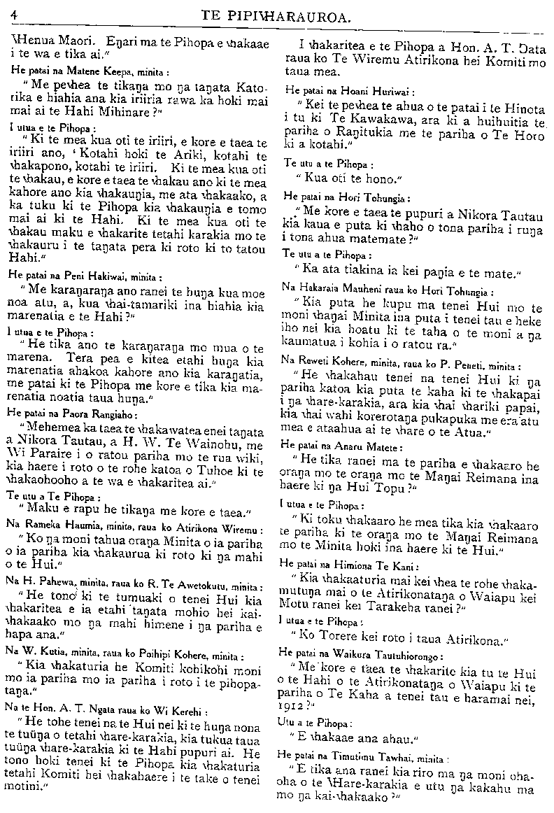 4 TE PIPIWHARAUROA. Whenua Maori. Engari ma te Pihopa e whakaae i te wa e tika ai." He patai na Matene Keepa, minita: " Me pewhea te tikanga mo nga tangata Kato- rika e hiahia ana kia iriiria rawa ka hoki mai mai ai te Hahi Mihinare?" I utua e te Pihopa: " Ki te mea kua oti te iriiri, e kore e taea te iriiri ano, ' Kotahi hoki te Ariki, kotahi te whakapono, kotahi te iriiri. Ki te mea kua oti te whakau, e kore e taea te whakau ano ki te mea kahore ano kia whakaungia, me ata whakaako, a ka tuku ki te Pihopa kia whakaungia e tomo mai ai ki te Hahi. Ki te mea kua oti te whakau maku e whakarite tetahi karakia mo te whakauru i te tangata pera ki roto ki to tatou Hahi." He patai na Peni Hakiwai, minita: " Me karangaranga ano ranei te hunga kua moe noa atu, a, kua whai-tamariki ina hiahia kia marenatia e te Hahi?" I utua e te Pihopa: " He tika ano te karangaranga mo mua o te marena. Tera pea e kitea etahi hunga kia marenatia ahakoa kahore ano kia karangatia, me patai ki te Pihopa me kore e tika kia ma- renatia noatia taua hunga." He patai na Paora Rangiaho: " Mehemea ka taea te whakawatea enei tangata a Nikora Tautau, a H. W. Te Wainohu, me Wi Paraire i o ratou pariha mo te rua wiki, kia haere i roto o te rohe katoa o Tuhoe ki te whakaohooho a te wa e whakaritea ai." Te utu a Te Pihopa: " Maku e rapu he tikanga me kore e taea." Na Rameka Haumia, minita, raua ko Atirikona Wiremu: " Ko nga moni tahua oranga Minita o ia pariha o ia pariha kia whakaurua ki roto ki nga mahi o te Hui." Na H. Pahewa minita, raua ko R. Te Awetokutu, minita: " He tono ki te tumuaki o tenei Hui kia whakaritea e ia etahi tangata mohio hei kai- whakaako mo nga mahi himene i nga pariha e hapa ana." Na W. Kutia, minita, raua ko Poihipi Kohere, minita: " Kia whakaturia he Komiti kohikohi moni mo ia pariha mo ia pariha i roto i te pihopa- tanga." Na te Hon. A. T. Ngata raua ko Wi Kerehi: " He tohe tenei na te Hui nei ki te hunga nona te tuunga o tetahi whare-karakia, kia tukua taua tuunga whare-karakia ki te Hahi pupuri ai. He tono hoki tenei ki te Pihopa kia whakaturia tetahi Komiti hei whakahaere i te take o tenei motini." I whakaritea e te Pihopa a Hon. A. T. Ngata raua ko Te Wiremu Atirikona hei Komiti mo taua mea. He patai na Hoani Huriwai: " Kei te pewhea te ahua o te patai i te Hinota i tu ki Te Kawakawa, ara ki a huihuitia te pariha o Rangitukia me te pariha o Te Horo ki a kotahi." Te utu a te Pihopa: " Kua oti te hono." He patai na Hori Tohungia: " Me kore e taea te pupuri a Nikora Tautau kia kaua e puta ki whano o tona pariha i runga i tona ahua matemate?" Te utu a te Pihopa: " Ka ata tiakina ia kei pangia e te mate." Na Hakaraia Mauheni raua ko Hori Tohungia: " Kia puta he kupu ma tenei Hui mo te moni whangai Minita ina puta i tenei tau e heke iho nei kia hoatu ki te taha o te moni a nga kaumatua i kohia i o ratou ra." Na Reweti Kohere, minita, raua ko P. Peneti, minita: "He whakahau tenei na tenei Hui ki nga pariha katoa kia puta te kaha ki te whakapai i nga whare-karakia, ara kia whai whariki papai, kia whai wahi korerotanga pukapuka me era atu mea e ataahua ai te whare o te Atua." He patai na Anaru Matete: " He tika ranei ma te pariha e whakaaro he oranga mo te oranga mo te Mangai Reimana ina haere ki nga Hui Topu?" I utua e te Pihopa: " Ki toku whakaaro he mea tika kia whakaaro te pariha ki te oranga mo te Mangai Reimana mo te Minita hoki ina haere ki te Hui." He patai na Himiona Te Kani: " Kia whakaaturia mai kei whea te rohe whaka- mutunga mai o te Atirikonatanga o Waiapu kei Motu ranei kei Tarakeha ranei?" I utua e te Pihopa: " Ko Torere kei roto i taua Atirikona." He patai na Waikura Tautuhiorongo: " Me kore e taea te whakarite kia tu te Hui o te Hahi o te Atirikonatanga o Waiapu ki te pariha o Te Kaha a tenei tau e haramai nei, 1912?" Utu a te Pihopa: " E whakaae ana ahau." He patai na Timutimu Tawhai, minita " E tika ana ranei kia riro ma nga moni oha- oha o te Whare-karakia e utu nga kakahu ma mo nga kai-whakaako?"
