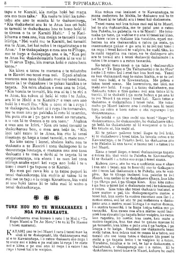 TE PIPIWHARAUROA. tapu a te Karaiti, kia meinga hoki hei manga ora mo taua take." Ka mutu te iriiri ka tohu- tohu atu ano te minita ki te whakaminenga, " Kia whakawhetai atu ki te Atua kua oti hoki te tamaiti te whakawhanau hou te hono hoki ki te tinana o ta te Karaiti Hahi." I te Kati- kihama e mea ana, kua meinga te tamaiti i tona iriiringa, " Hei wahi mo te Karaiti, hei tamaiti ma te Atua, hei kai noho i te rangatiratanga o te Atua." I te whakapakanga e mea ana te Pihopa, mo te hunga e whakapainga ana e ia, " Kua pai te Atua kia whakawhanautia houtia ki te wai ki te Wairua Tapu, kia murua hoki o ratou hara katoa." Ka kitea e tatou te marama o te tohutohu a te Rawiri mo tenei mea nui. Engari ahakoa marama noa tana whakaatu mai mo tenei take, kaore ia i te whakakore i te ngakau karakia o te tangata. Na reira ahakoa e mea ana te Iriiri, " Kia horoia te tamaiti, kia ora ai ia i te riri a te Atua, kia tukua ai hoki ki roto i te Aaka, ara ki te Hahi a te Karaiti;" e mea ana ano hoki ia i muri ihu, " Kia u tonu ai ia 1 runga i te whakapono, kia hari ai i runga i te tumanako, me te man ano nga pakiaka ki roto ki te aroha, kia puta atu ai i nga ngaru o tenei ao raruraru, a u roa ki te whenua o te ora tonu." Ahakoa e mea ana te Iriiri,"Kua oti tenei tamaiti te whakawhanau hou, e mea ana hoki ia, "Kia inoi tahi tatou ki te Atua, kia rite ki tenei timatanga nga hanga a tenei tamaiti, a mate noa." Ka kite tatou i konei, ahakoa kaha noa te whakaatu a te Rawiri i tona whakapono ki te whanautanga houtanga, e marama ana ano tana whakaatu i te mea e whiwhi ai te tangata ki te orangatonutanga, ara ehara i te mea kei tona iriiringa anake engari kei runga ano hoki i te u tonu i muri i nga tapuae o te Karaiti. He mea pai rawa kia u ta tatou pupuri ki tenei whakaakoranga kia mohio ai tatou ki te nui me te tapu o te oranga Karaitiana, kia wehi ai ano hoki tatou ki te taka mai ki waho o tenei whakaakoranga. TURE HOU MO TE WHAKAHAERE I NGA PAPARAKAUTA. (I whakahaerea enei korero i roto i te Hui a "Te Ropu Maori o Te Ao Hou," i te tu ki Te Hauke i tenei marama). KATAHI ano te iwi Maori i raro i tenei ture ka ahei ki te whakapuaki, kia whakarangona mai ai e te Kawanatanga, i o ratou whakaaro mo runa i te mate nui e kitea e pa mai ana ki runa i te mate nui e kitea e pa mai ana ki runga i a ratou i na runga i tenei kai i te waipiro. Kua tukua mai inaianei e te Kawanatanga, te mana mehemea he hiahia, he whakaaro nui to te iwi Maori ki te takahi atu i tenei kai whakamate. Tenei mana nui kua tukua mai nei ki te Maori. kei te ata whakaarohia, me te patai ano o ratou hoa Pakeha, ka peheatia ra e te Maori! He toko- maha na tane, na wahine e u ana ki tenei kai kino, a e kore ratou e whakaae kia turakina. engari me- hemea ka ata whakaarohia e ratou na mate, na maemaetanga ngakau e pa ana ki te iwi nui tonu i na runga i tenei kai—i te waipiro, he mahi tika, ko te mahi rangatira ma ratou ko te whakangaro atu ara te turaki atu i tenei whakawai whakamate i a ratou i te aroaro o a ratou tamariki. Ko tetahi tonu tenei o na take i whakaarohia nuitia e "Te Ropu o Nga Taitamariki o te Ao Hou" i roto i a ratou hui i enei tau kua huri nei. Tenei ra kua whakamana, mai to ratou hiahia, o to te iwi nui tonu hoki, e te Kawanatanga. Me pehea e tatou tenei mana. Me korerorero, me uiui. me mahi ano hoki. I runga i a tatou whakahaere, me whakaatu tatou e tino ngakau nui ana tatou ki te turaki, ki te whakaiti i na mate huhua e pa ana ki te iwi Maori i na runga i tenei kai. Kaua tatou e whakaroa, e whakataihoa i tenei take. He toko- maha nga Maori kahore ano i mohio noa ki tenei ture. no reira e kore ratou e ata rapurapu i nga whakamarama. Ko tetahi o nga tino mahi ma tenei " Ropu" he whakamarama. he whakamohio, he whakahaere tika- nga hoki ka whakatakoto ai ki waenganui o te iwi. kia takatu ai. kia mahi ai. Ki te ngakau ngoikore tenei Ropu te iwi hoki, ki te whakahaere i tenei take, ka tawaia ratou e te Kawanatanga e te Pakeha hoki, ka whakaurua atu e te Pakeha ki ana tawai e taunu nei i a tatou i te Iwi Maori. Kana e tenei Ropu. e tenei whakaminenga tangata e tukua kia whai wahi te Pakeha, te Kawanatanga ki te whakaiti i a tatou mo runga i tenei mana. Kahore rawa atu he wa e mohiotia ana e ahau i tua atu i tenei, ara te huarahi mo te whakangaro atu i tenei kai whakamate a te Pakeha ara te wai- piro. Ko te tikanga inaianei kua pakeke te iwi Maori, kua mohio ki te whakahaere tikanga, kua kite i nga tikanga pai. i na tikanga kino. Kua kite ratou i nga hua o tenei kai e whakamate nei i te tokomaha o ratou. Kua toko ake tenei whakaaro inaianei e kore matou e pai kia whakaponongatia matou e tenei kai, kua mutu ta matou maumau noa iho i a matou moni, nui ke atu te pai mehemea e whaka- paua ana a matou moni ki runa i o matou whenua. i a matou tamariki, i te hana kainga totika mo nga tamariki. Kua ranea noa atu a matou moni inai- anei kua riro atu i na tanata hoko waipiro, ko ratou kua rangatira, ko matou kua mate, kua mate o matou rangatira, kua tae mai te ngakau mamae ki na tamariki, kua kitea e patu ana i na haringa, i nga koanga o te kainga. Inaianei me whakamutu tenei mahi tutua, kua tukua mai te mana ki a tatou, me turaki atu me kaua tatou e whakaae kia penei te mahi a nga tanata hoko i te waipiro ki a tatou. Turakina, takahia e te iwi, te kai e whakamate, e whakatutua, e whakaporangi nei i a tatou. Ki te whakahaerea tenei take e te Maori, kahore he mahi