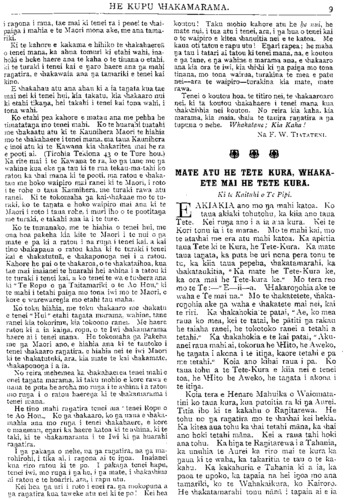 HE KUPU WHAKAMARAMA. 9 i rangona i mua, tae mai ki tenei ra i penei te whai- painga i mahia e te Maori mona ake, me ana tama- riki. Ki te kahore e kakama e hihiko te whakahaerea o tenei mana, ka ahua tomuri ki etahi wahi, ina- hoki e heke haere ana te kaha o te tinana o etahi, ki te turaki i tenei kai e ngaro haere ana na mahi rangatira, e whakawaia ana na tamariki e tenei kai kino. E whakahau atu ana ahau ki a ia tangata kua tae mai nei ki tenei hui, kia takatu, kia whakaaro nui ki etahi tikanga, hei takahi i tenei kai tona wahi, i tona wahi. Ko etahi pea kahore e matau ana me pehha he timatatanga mo tenei mahi. Ko te huarahi tuatahi me whakaatu atu ki te Kaunihera Maori te hiahia mo te whakahaere i tenei mana. ma taua Kaunihera e inoi atu ki te Kawana kia whakaritea mai he ra e pooti ai. (Tirohia Tekiona 43 o te Ture hou.) Ka rite mai i te Kawana te ra, ko na tane me na wahine kua eke na tau ki te rua tekau-ma-tahi ko ratou ka whai mana ki te pooti, ma ratou e whaka- tau me hoko waipiro mai ranei ki te Maori, i roto i te rohe o taua Kaunihera, me turaki rawa atu ranei. Ki te tokomaha na kaiwhakaae mo te tu- raki. ko te tanata e hoko waipiro mai ana ki te Maori i roto i taua rohe, i muri iho o te pootitanga me turaki, e takahi ana ia i te ture. Ko te tumanako me te hiahia o tenei hui, me ona hoa pakeha kia kite te Maori i te nui o na mate e pa ki a ratou i na runga i tenei kai, a kai tino whakapaua o ratou kaha ki te turaki i tenei kai e whakatutua , e whakapononga nei i a ratou. Kahore he pai o te whakaroa, o te whakataihoa, kua tae mai inaianei te huarahi hei awhina i a tatou ki te turaki i tenei kai. a ko tenei te wa e tuwhera ana ki "Te Ropu o nga Taitamariki o te Ao Hou," ki te mahi i tetahi paina mo tona iwi mo te Maori, e kore e warewarengia mo etahi tau maha. Ko toku hiahia, me toku whakaaro me whakatu e tenei " Hui" etahi tanata marama wahine tane ranei kia tokorima kia tokoono ranei. Me haere ratou ki a ia kainga, ropu, o te Iwi whakamarama haere ai i tenei mana. He tokomaha nga Pakeha me na Maori ano, e hiahia ana ki te tautoko i tenei whakaaro rangatira, e hiahia nei te iwi Maori ki te whakatutuki , ara, kia mate te kai whakamate, whakapononga i a ia. No reira mehemea ka whakahaerea. tenei mahi e enei tangata marama, ki taku mohio e kore rawa e maua te puta he aroha mo runga a i te awhina i a ratou mo runa i o ratou haerenga ki te whakamarama i tenei mana. He tino mahi rangatira tenei ma "tenei Ropu o te Ao Hou Ko nga whakaaro ko na uaua e whaka- mahia ana mo runa i tenei whakahaere, e kore e maumau, engari ka haere katoa ki te awhina, ki te taki, ki te whakamarama i te Iwi ki na huarahi rangatira. I na pakanga o nehe, na na rangatira, na na ma- rohirohi, i tika ai, i rangona ai te ingoa. Inaianei kua riro ratou ki te po. I pakanga tenei hapu, tenei iwi, mo runa i nahe, i na mate, i whakawhiua ai ratou e te hoariri, ara, i rapu utu. Kei hea na uri i roto i enei ra, na mokopuna a na rangatira kua taweke atu nei ki te po! Kei hea koutou! Taku mohio kahore atu he he nui, he mate nui, i tua atu i tenei, ara, i na hua o tenei kai o te waipiro e kitea whanuitia nei e te katoa. Me kaua oti tatou e rapu utu! En ari rapea; he maha na tau i tatari ai tatou ki tenei mana, na, e koutou e na tane, e na wahine e marama ana, e whakaaro ana kia ora te iwi, kia whiwhi ki na paina mo tona tinana, mo tona wairua, turakina te mea e patu nei—ara te waipiro—turakina kia mate, mate rawa. Tenei o koutou hoa, te titiro nei, te whakaaroaro nei, ki ta koutou whakahaere i tenei mana kua whakawhiwhia nei koutou. No reira kia kaha, kia marama, kia maia, whaia te tauira rangatira a na tupuna o nehe. Whakatane; Kia Kaha! Na F. W. TIATATENI. MATE ATU HE TETE KURA, WHAKA- ETE MAI HE TETE KURA. Ki te Kaituhi o Te Pipi. E AKIAKIA ano mo nga mahi katoa. Ko taua akiaki tohutohu, ka kiia ano taua Tete. Kei runga ano i a ia aua kura. Kei te Kori tonu ia i te marae. Mo te mahi kai, mo te atawhai me era atu mahi katoa. Ka apititia taua Tete ki te Kura, he Tete-Kura. Ka mate taua tangata, ka puta he uri nona pera tonu te tu, ka kiia taua pepeha, whakatamarahi, ka whakataukitia, "Ka mate he Tete-Kura ke, ka ora mai he Tete-kura ke." Mo tera reo mo te Te:—" E—ii—a. Whakarongohia ake te waha e Te mai na." Mo te whakatetete, whaka- rongohia ake nga waha e whakatete mai nei, kai te riri. Ka whakahokia te patai, " Ae, ko mea raua ko mea, kei te tatai, he patiti nga rakau he taiaha ranei, he tokotoko ranei a tetahi a tetahi." Ka whakahokia e te kai patai, " Aku- anei raua mahi ai, tokorua he Whito he Aweko, he tangata i akona i te itinga, kaore tetahi e pa me tetahi." Koia ano kihai raua i pa. Ko taua tohu a te Tete-Kura e kiia nei e tenei toa, he Whito he Aweko, he tangata i akona i te itinga. Koia tera e Henare Mahuika o Waiomata- tini ko taua kura, kua putoitia ra ki nga Aurei. Titia iho ki te kakahu o Rangitarewa. He tohu no nga rangatira mo te whawhai kei hekia. Ka kitea aua tohu ka whai tetahi mana, ka whai ano hoki tetahi mana. Kei a raua tahi hoki ana tohu. Ka hinga te Rangitarewa i a Tahania, ka unuhia te Aurei ka riro mai te kura ka ngaua ki te waha, ka takaritia te tau o te ka- kahu. Ka kakahuria e Tahania ki a ia, ka paoa te upoko, ka tapaia na hei ingoa mo ana tamariki, ko te Wahakaikura, ko Kairoro. He whakatamarahi tonu nana i tapaia ai e ia
