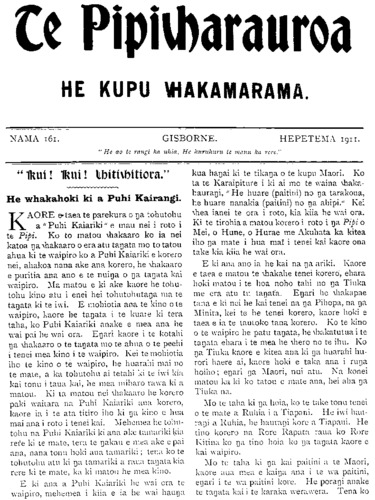 Te Pipiwharauroa HE KUPU WHAKAMARAMA. NAMA 161. GISBORNE. HEPETEMA 1911. "He ao te rangi ka uhia, He huruhuru te manu ka rere." "Kui! Kui! Whitiwhitiora." He whakahoki ki a Puhi Kairangi. KAORE e taea te parekura o nga tohutohu a "Puhi Kaiariki" e mau nei i roto i te Pipi. Ko to matou whakaaro ko ia nei katoa nga whakaaro o era atu tangata mo to tatou ahua ki te waipiro ko a Puhi Kaiariki e korero nei, ahakoa nana ake ana korero, he whakaaro e puritia ana ano e te nuinga o nga tangata kai Ma matou e ki ake kaore he tohu- tohu kino atu i enei hei tohutohutanga ma te tangata ki te iwi. E mohiotia ana te kino o te waipiro, kaore he tangata i te kuare ki tera taha, ko Puhi Kaiariki anake e mea ana he wai pai he wai ora. Engari kaore i te kotahi nga whakaaro o te tangata mo te ahua o te peehi i tenei mea kino i te Kei te mohiotia iho te kino o te waipiro, he huarahi mai no te mate, a ka tohutohu ai tetahi ki te iwi kia kai tonu i taua kai, he mea miharo rawa ki a matou. Ki ta matou nei whakaaro he korero paki waitara na Puhi Kaiariki ana korero, kaore ia i te ata titiro iho ki na kino e hua mai ana i roto i tenei kai. Mehemea he tohu- tohu na Puhi Kaiariki ki ana ake tamariki kia rere ki te mate, tera te ngakau e mea ake e pai ana, nana tonu hoki ana tamariki; tena ko te tohutohu atu ki na tamariki a raua tangata kia rere ki te mate, ka ki matou he mea kino. E ki ana a Puhi Kaiariki he wai ora te waipiro, mehemea i kiia e ia he wai haunga kua hangai ki te tikanga o te kupu Maori. Ko ta te Karaipiture i ki ai mo te waina whaka- haurangi, " He huare (paitini) no nga tarakona, he huare nanakia (paitini) no nga ahipi." Kei whea ianei te ora i roto, kia kiia he wai ora. Ki te tirohia a matou korero i roto i nga Pipi o Mei, o Hune, o Hurae me Akuhata ka kitea iho nga mate i hua mai i tenei kai kaore ona take kia kiia he wai ora. E ki ana ano ia he kai na nga ariki. Kaore e taea e matou te whakahe tenei korero, ehara hoki matou i te hoa noho tahi no nga Tiuka me era atu tu tangata. Engari he whakapae tana e ki nei he kai tenei na na Pihopa, na nga Minita, kei te he tenei korero, kaore hoki e taea e ia te tautoko tana korero. Ko te kino o te waipiro he patu tangata, he whakatutua i te tanata ehara i te mea he whero no te ihu. Ko nga Tiuka kaore e kitea ana ki na huarahi hu- rori haere ai, kaore hoki e taka ana i runga hoiho; engari na Maori, nui atu. Na konei matou ka ki ko tatou e mate ana, hei aha na Tiuka na. Mo te taha ki na hoia, ko te take tonu tenei o te mate a Ruhia i a Tiapani. He iwi hau- rangi a Ruhia, he haurangi kore a Tiapani. He tino korero na Rore Rapata raua ko Rore Kitina ko na tino hoia ko nga tangata kaore e kai Mo te taha ki na kai paitini a te Maori, kaore aua mea e kainga ana i te wa paitini, engari i te wa paitini kore. He porangi anake te tanata kai i te karaka werawera. Tena ko