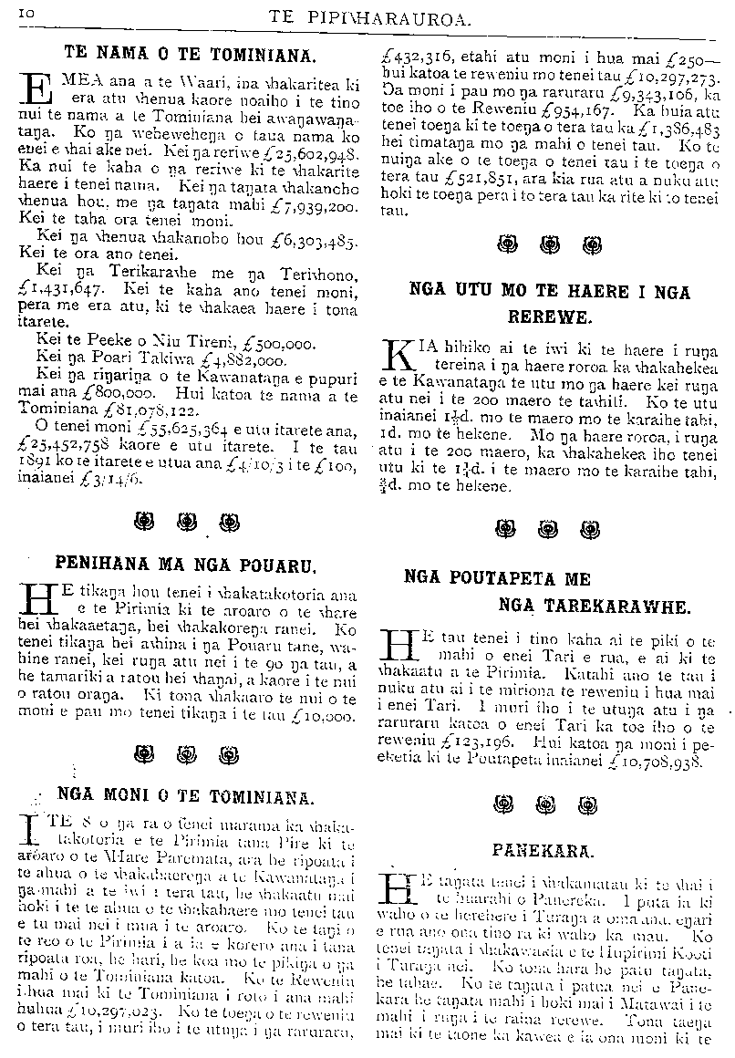 IO TE PIPIWHARAUROA. TE NAMA O TE TOMINIANA. E MEA ana a te Waari, ina whakaritea ki era atu whenua kaore noaiho i te tino nui te nama a te Tominiana hei awangawanga- tanga. Ko nga wehewehenga o taua nama ko enei e whai ake nei. Kei nga reriwe £25, 602, 948 Ka nui te kaha o na reriwe ki te whakarite haere i tenei nama. Kei nga tangata whakanoho whenua hou, me nga tangata mahi £7,939,200. Kei te taha ora tenei moni. Kei nga whenua whakanoho hou £6, 303, 485 Kei te ora ano tenei. Kei nga Terikarawhe me nga Teriwhono, £1,431,647. . Kei te kaha ano tenei moni, pera me era atu, ki te whakaea haere i tona itarete. Kei te Peeke o Niu Tireni, £500, 000. Kei nga Poari Takiwa £4, 882, 000. Kei nga ringaringa o te Kawanatanga e pupuri mai ana £800, 000. Hui katoa te nama a te Tominiana £81, 078, 122. O tenei moni £55, 625, 364 e utu itarete ana, £25,452,758 kaore e utu itarete. I te tau 1891 ko te itarete e utua ana £4/10/3 i te £100, inaianei £3/14/6 £432,316, etahi atu moni i hua mai £250— hui katoa te reweniu mo tenei tau £10, 297,273 Nga moni i pau mo nga raruraru £9, 343,106 ka toe iho o te Reweniu £954,167. Ka huia atu tenei toenga ki te toenga o tera tau ka £1, 386, 483 hei timatanga mo nga mahi o tenei tau. Ko te nuinga ake o te toenga o tenei tau i te toenga o tera tau £521, 851, ara kia rua atu a nuku atu: hoki te toenga pera i to tera tau ka rite ki to tenei tau. NGA UTU MO TE HAERE I NGA REREWE. KIA hihiko ai te iwi ki te haere i runga tereina i nga haere roroa ka whakahekea e te Kawanatanga te utu mo nga haere kei runga atu nei i te 200 maero te tawhiti. Ko te utu inaianei 1½d. mo te maero mo te karaihe tahi, 1d. mo te hekene. Mo nga haere roroa, i runga atu i te 200 maero, ka whakahekea iho tenei utu ki te 1¼d. i te maero mo te karaihe tahi, ¾d. mo te hekene. PENIHANA MA NGA POUARU. HE tikanga hou tenei i whakatakotoria ana e te Pirimia ki te aroaro o te whare hei whakaaetanga, hei whakakorenga; ranei. Ko tenei tikanga hei awhina i nga Pouaru tane, wa- hine ranei, kei runga atu nei i te 90 nga tau, a he tamariki a ratou hei whangai, a kaore i te nui o ratou oranga. Ki tona whakaaro te nui o te moni e pau mo tenei tikanga i te tau £10, 000. NGA POUTAPETA ME NGA TAREKARAWHE. HE tau tenei i tino kaha ai te piki o te mahi o enei Tari e rua, e ai ki te whakaatu a te Pirimia. Katahi ano te tau i nuku atu ai i te miriona te reweniu i hua mai i enei Tari. I muri iho i te utunga atu i nga raruraru katoa o enei Tari ka toe iho o te reweniu £123, 196 Hui katoa na moni i pe- eketia Id te Poutapeta inaianei £10: 708, 938- NGA MONI O TE TOMINIANA. ITE 8 o nga ra o tenei marama ka whaka- takotoria e te Pirimia tana Pire ki te aroaro o te Whare Paremata, ara he ripoata i te ahua o te whakahaerenga a te Kawanatanga i nga mahi a te iwi i tera tau, he whakaatu mai hoki i te. te ahua o te whakahaere mo tenei tau e tu mai nei i mua i te aroaro. Ko te tangi o te reo o te Pirimia i a ia e korero ana i tana ripoata roa, he hari, he koa mo te pikinga o nga mahi o te Tominiana katoa. Ko te Reweniu i hua mai ki te Tominiana i roto i ana mahi huhua £10, 297, 023. Ko te toenga o te reweniu o tera tau, i muri iho i te utunga i nga raruraru, PANEKARA. HE tangata tenei i whakamatau ki te whai i te huarahi o Pauereka. 1 puta ia ki waho o te herehere i Turanga a oma ana engari e rua ano ona tino ra ki waho ka mau. Ko tenei tangata i whakawakia o te Hupirimi Kooti i Turanga nei. Ko tona hara he patu tangata. he tahae. Ko te tanata i patua nei e Pane- kara he tangata mahi i hoki mai i Matawai i te mahi i runga i te raina rerewe. Tona taenga mai ki te taone ka kawea e ia una moni ki te