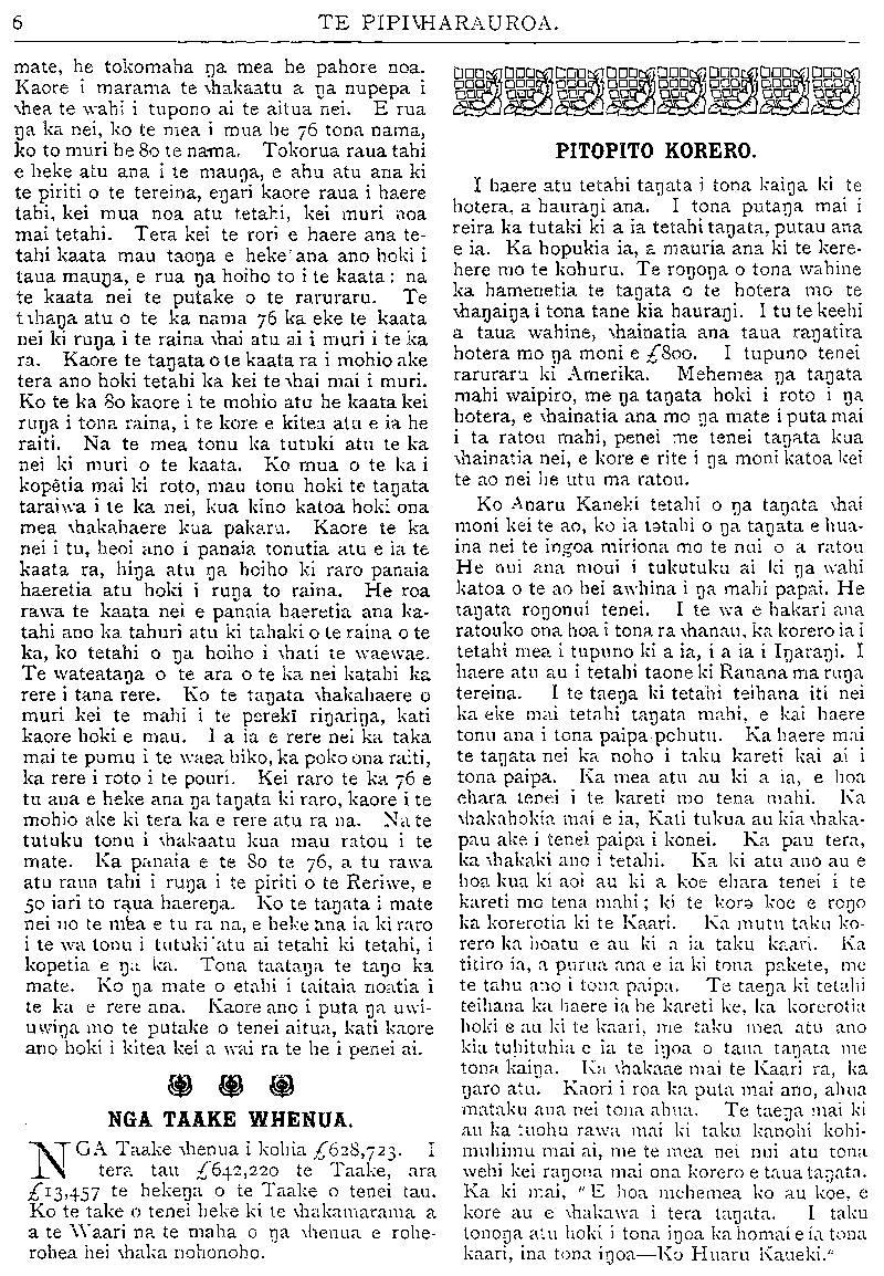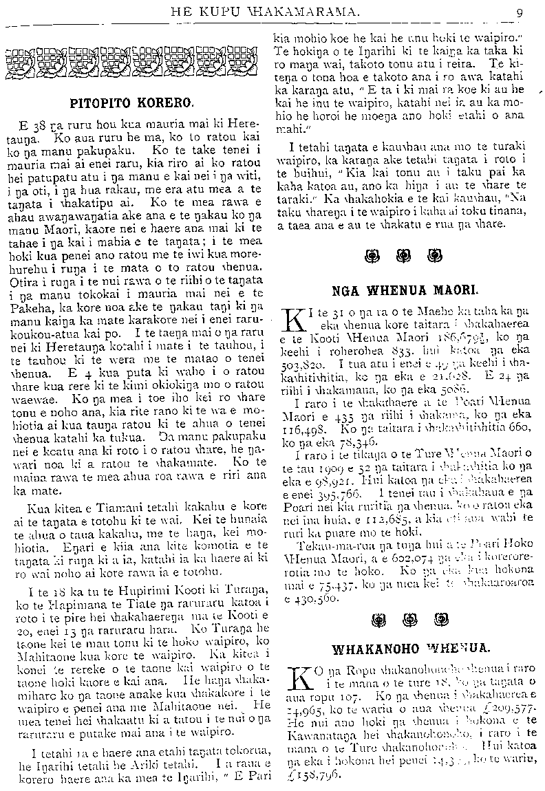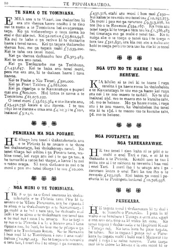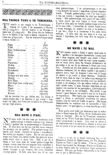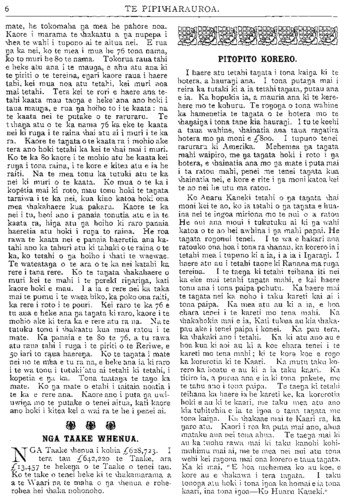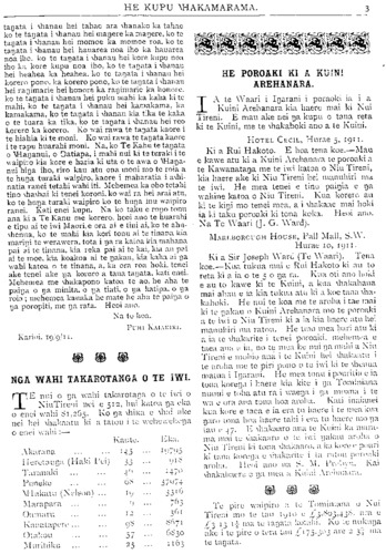 HE KUPU WHAKAMARAMA. tanata i whanau hei tahae ara whanako ka tahae ko te tanata i whanau hei mangere ka mangere, ko te tangata i whanau hei momoe ka momoe roa, ko te tangata i whanau hei hauarea noa iho ka hauarea noa iho. ko te tangata i whanau hei kore kupu noa iho ka kore kupu noa iho. ko te tanata i whanau hei heahea ka heahea ko te tanata i whanau hei korero pono. ka korero pono, ko te tanata i whanau hei rangimarie hei honore ka rangimarie ka honore. ko te tanata i whanau hei puku mahi ka kaha ki te mahi. ko te tanata i whanau hei kamakama, ka kamakama, ko te tanata i whanau kia tika te kaka o te tuara ka tika, ko te tanata i whanau hei reo korero ka korero. Ko wai rawa te tanata kaore i te hiahia ki te moni. Ko wai rawa te tangata kaore i te rapu huarahi moni. Na, ko Te Kahu te tangata o Whanganui, o Ngatiapa, i mahi nui ki te turaki i te vvaipiro kia kore e haria ki uta o te awa o Whanga- nui hina iho, riro kau atu ona moni mo te roia a te huna turaki waipiro, kaore i maharatia i awhi- natia ranei tetahi wahi iti. Mehemea ka oho tetahi tino whawhai ki tenei koroni. ko wai ra hei anu atu, ko te huna turaki waipiro ko te huna inu waipiro ranei. Kati enei kupu. Na ko taku e rongo tonu ana ki a Te Kanu me korero, heoi ano te huarahi e tipu ai te iwi Maori e ora ai e tini ai, ko te ahu- whenua, ko te mahi kia kori tonu ai te tinana kia maringi te werawera, tota i na ra katoa kia mahana pai ai te tinana, kia reka pai ai te kai, kia au pai ai te moe, kia koakoa ai te ngakau, kia kaha ai nga wahi katoa o te tinana, a, ka ora roa hoki, tenei ake tenei ake na korero a taua tangata, kati enei. Mehemea me whakapono katoa te ao. he aha te painga o na minita o na tiati, o nga katipa, o na roia; mehemea kauaka he mate he aha te painga o na poropiti, me na rata. Heoi ano. Na to hoa. PUHI KAIARIKI. Karioi. 19/9/11 NGA WAHI TAKAROTANGA O TE IWI. TE nui o nga wahi takarotanga o te iwi o Niu Tireni nei e 512, hui katoa na eka o enei wahi 81.265. Ko na whika e whai ake nei hei whakaatu ki a tatou i te wehewe ehenga o enei wahi :-— Akarana Heretaunga (Haki Pei ) Taranaki; Poneke Whakatu (Nelson) ... Marapara Oamaru Kanatapere ... Otakou Murihiku HE POROAKI KI A KUINI AREHANARA. I A te Waari i Ingarani i poraoki ia i a Kuini Arehanara kia haere mai ki Nui Tireni. E mau ake nei nga kupu o tana reta ki te Kuini, me te whakahoki ano a te Kuini. HOTEL CECIL, Hurae 5, 1911. Ki a Rui Hakoto. E hoa tena koe.—Mau e kawe atu ki a Kuini Arehanara te poroaki a te Kawanatanga me te iwi katoa o Niu Tireni, kia haere ake ki Niu Tireni hei manuhiri ma te iwi. He mea tenei e tino paingia e nga wahine katoa o Niu Tireni. Kua korero au ki te kingi mo tenei mea, a i whakaae mai hoki ia ki taku poroaki ki tona koka. Heoi ano. Na Te Waari (J. G. Ward). MARLBOROUGH HOUSE, Pall Mall, S.W. Hurae 10, 1911. Ki a Sir Joseph Waro (Te Waari). Tena koe.—Kua tukua mai e Rui Hakoto ki au to reta ki a ia o te 5 o na ra. Kua oti ano hoki e au to kawe ki te Kuini, a kua whakahaua mai ahau e ia kia tukua atu ki a koe tana wha- kahoki. He nui te koa me te aroha i tae mai ki te ngakau o Kuini Arehanara mo te poroaki a te iwi o Niu Tireni ki a ia kia haere atu hei manuhiri ma ratou. He tino mea hari atu ki a ia te whakarite i tenei poroaki, mehemea e taea ana e ia, no te mea he nui na mahi a Niu Tireni e mohio ana i te Kuini hei whakaatu i te aroha me te pin pono o te iwi ki te whenua matua i Ingarani. He mea tonu i pouritia e ia tona korenga i haere kia kite i na Tominiana nunui e toha atu ra i waenga i nga moana i te wa e ora ana tona hoa aroha Kati inaianei kua kore e taea e ia era tu haere i te mea kua ngaro tona hoa haere tahi i era tu haere mo nga tau e 47 E whakaaro ana te Kuini ka mara- ma mai te whakaaro o te iwi ngakau aroha o Niu Tireni ki tona whakaaro a ka kore e pouri ki tana korenga e whakarite i ta ratou poroaki aroha Heoi ano na S. M. Probyn. Kai whakahaere e nga mea a Kuini Arehanara. Te pire waipiro a te Tominiana u Nui Tireni mo te tau 1910 e Ł3,803,438. ara e Ł3 13 1Ľ ma te tangata kotahi. Ko te nukunga ake i te pire o tera tau Ł173-303 are 2 31 ma te tanata.