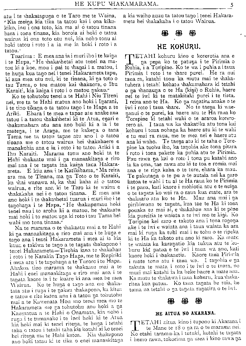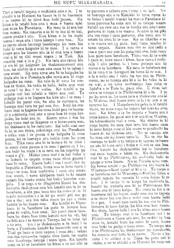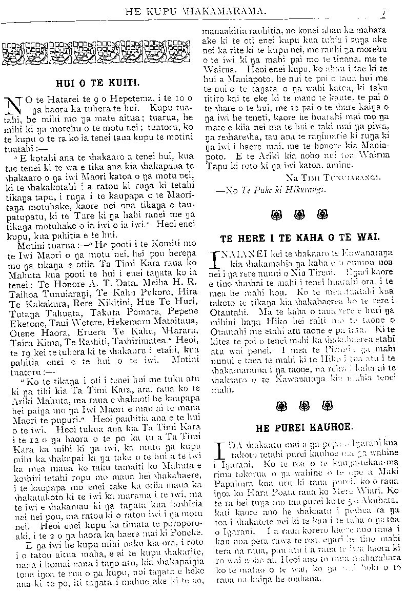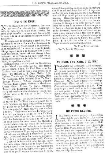 HE KUPU WHAKAMARAMA. HUI O TE KUITI. NO te Hatarei te 9 o Hepetema, i te 10 o nga haora ka tuhera te hui. Kupu tua- tahi, he mihi mo nga mate aitua; tuarua, he mihi ki nga morehu o te motu nei; tuatoru, ko te kupu o te ra ko ia tenei taua kupu te motini tuatahi:— " E kotahi ana te whakaaro a tenei hui, kua tae tenei ki te wa e tika ana kia whakapaua te whakaaro o nga iwi Maori katoa o nga motu nei, ki te whakakotahi i a ratou ki runga ki tetahi tikanga tapu, i runga i te kaupapa o te Maori- tanga motuhake, kaore nei ona tikanga e tau- patupatu, ki te Ture ki nga hahi ranei me nga tikanga motuhake o ia iwi o ia iwi." Heoi enei kupu, kua pahitia e te hui. Motini tuarua:—" He pooti i te Komiti mo te Iwi Maori o nga motu nei, hei pou herenga mo nga tikanga e otiia Ta Timi Kara raua ko Mahuta kua pooti te hui i enei tangata ko ia tenei: Te Honore A. T. Ngata. Meiha H. R. Taihoa Tunuiarangi, Te Kahu Pukoro, Hira Te Kakakura, Rere Nikitini, Hue Te Huri, Tutanga Tahuata, Takuta Pomare, Pepene Eketone, Taui Wetere, Hekemaru Mataitaua, Otene Haora, Eruera Te Kahu, Wharara, Taira Kima, Te Rawhiti, Tawhirimatea." Heoi, te 19 kei te tuhera ki te whakauru i etahi, kua pahitia enei e te hui o te iwi. Motini tuatoru:— " Ko te tikanga i oti i tenei hui me tuku atu ki nga tihi kia Ta Timi Kara, ara, raua ko te Ariki Mahuta, ma raua e whakaoti he kaupapa hei paina mo na Iwi Maori e mau ai te mana Maori te pupuri." Heoi paahitia ana e te hui o te iwi. Heoi tukua ana kia Ta Timi Kara i te 12 o nga haora o te po ka tu a Ta Timi Kara ka mihi ki na iwi, ka mutu na kupu mihi ka whakapai ki na take o te hui a te iwi ka mea maua ko taku tamaiti ko Mahuta e kowhiri tetahi ropu mo maua hei whakahaere, i te kaupapa mo enei take ka otiia maua ka whakatakoto ki te iwi ka marama i te iwi, ma te iwi e whakamau ki na tanata kua kowhiri nei hei pou, ma ratou ki o ratou iwi i nga motu nei. Heoi enei kupu ka timata te poroporo- aki, i te 2 o nga haora ka haere mai ki Poneke. E na iwi he kupu mihi naku kia ura, i roto i o tatou aitua maha, e ai te kupu whakarite, nana i homai nana i tango atu, kia whakapainga tona ingoa te rua o na kupu, nui tangata e heke ana ki te po, iti tanata i mahue ake ki te ao, manaakitia rauhitia, no konei ahau ka mahara ake ki te oti enei kupu kua tuhia i runa ake nei ka rite ki te kupu nei, me rauhi nga morehu o te iwi ki nga mahi pai mo te tinana, me te Wairua. Heoi enei kupu ko ahau i tae ki te hui a Maniapoto, he nui te pai o taua hui me te nui o te tangata o na wahi katoa, ki taku titiro kai te eke ki te mano te kaute te pai o te whare o te hui, me te pai o te whare kainga o nga iwi he teneti, kaore he huarahi mai mo nga mate e kiia nei ma te hui e taki mai na piwa, nga rewharewha, tau ana te rangimarie. ki runga ki nga iwi i haere mai, me te honore kia Mania- poto. E te Ariki kia noho nui tou Wairua Tapu ki roto ki nga iwi katoa amine. Na TIMI TUNUIARANGI. —No Te Puke ki Hikurangi. TE HERE I TE KAHA O TE WAI. INAIANEI kei te whakaaro te I' kia whakamahia na kaha e '.'• nei i na rere nunui o Niu Tireni. e tino \\ha\\hai te mahi i tenei hn;u' mea he n"!ahi hou. Ko te me:i. takoto te tikana kia \\hakahaei"t--..i Otautahi. "Ma te kaha o taua ra mihini hana Hiko hei raki me' Otautahi me etahi atu taone e p;i kitea te pai o tenei mahi ka \\h;i;<;. atu wai penei. 1 mea te Pinn1 nunui e taea te mahi ki te Hiko i whakamarama i na taone, na reir;; whakaare o te K;iwanatana ki-'. mahi. ^;;u'c!.natana •ou mou noa I'yai"i k;iore •ahi ora. i te li:cil;d'ii kua ko tf rere i •re e huri nga "i;- taone o t;.i a. Kite . h;irrea, etahi ;,- ;;;a .mahi ; ua :itu i te ; k;ih;i ai te r;.;i.hi ;"i. tenei HE PUREI KAUHOE. I OA whakaatu mai a na pep.i .' I^ar;ini kua takoto tetahi purei kaulio'J ii.;'.. ';;a \\vahine i lyarani. Ko te ro;i o Te kauiJ;i-te:kan-ma rimu tokonui o r);i wahine o tu ^;pe ;i Maki Papa'iini"a kua uru ki taua p;u"hi, ko o rana ino;i ko I-Iara Peata raua ko Mer;-- Wiari. Ko te ra lie! tuha ino tau purei ko te 5 u Akuhata, kati kaorc ano lie whakaatu i pewhea ra na toa i \\hcikatete nei ki te kau i te t;ilia o na toa o Igarani. I a mua korero ka«-'!'t; ;'.no mua i kau noa pera rawa te roa, ei^an \\':v Imu mahi ter;i na i",ina, p:iu ;itu i a mu;i tr :'.*•;•- kaora ki ro wai ng!io ai. Heoi ano to num;i n;;ihar:!:hara ko te matao o te \\\\-;li, ko ai ".".:'1 'i"ki o to raua na kaina lie mahana.