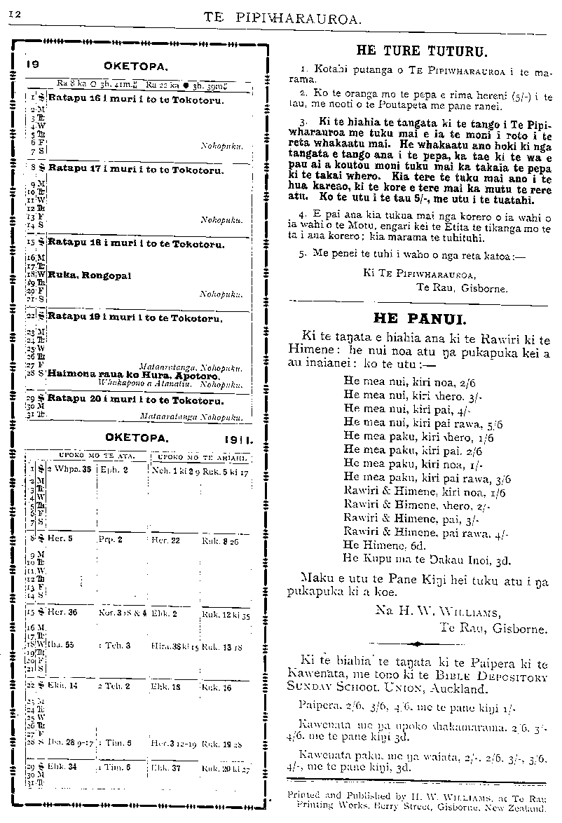TE PIPIWHARAUROA. HE TURE TUTURU. 1. Kotahi putanga o TE PIPIWHARAUROA i te ma- rama. 2. Ko te oranga mo te pepa e rima hereni (5/-) i te tau, me nooti o te Poutapeta me pane ranei, auaka i te tiaki he pane kingi hepene nga pane e tino hiahiatia ana. 3. Ki te pau nga hereni a tetahi tangata i tuku mai ai ka tukua atu he kaute. Ki te tae atu te kaute kia hohoro te tuku mai i te moni, na te moni hoki i puta atu ai te pepa ehara i te mea tupu noa. 4. E pai ana kia tukua mai nga korero o ia wahi o ia wahi o te Motu, engari kei te Etita te tikanga mo te ta i aua korero : kia marama te tuhituhi. 5. Me penei te tuhi i waho o nga reta katoa: — Ki TE PIPIWHARAUROA, Te Rau, Gisborne. HE PANUI Ki te tangata e hiahia ana ki te Rawiri ki te Himene : he nui noa atu nga pukapuka kei a au inaianei : ko te utu : — He mea nui, kin noa ... 2/6 He mea nui, kiri wher ... 3/- He mea nui, kiri pai ... 4/— He mea nui kiri pai rawa ... 5/6 H e mea paku, kiri whero ... 1/6 H e mea paku, kiri pai . . . 2/6 He mea paku, kiri noa ... 1/- He mea paku, kiri pai rawa 3/6 Rawiri & Himene, kiri noa 1/6 Rawiri & Himene, whero ... 2/- Rawiri & Himene, pai ... 3/- Rawiri & Himene, pai rawa 4/- He Himene ... ... -/6 Maku e utu te Pane Kingi hei tuku atu i nga pukapuka ki a koe. Na H. W. WILLIAMS, Te Rau, Gisborne. Ki te hiahia te tangata ki te Paipera ki te, Kawenata, me tono ki te BIBLE DEPOSITORY SUNDAY SCHOOL UNION, Auckland. Paipera, 2/6, 3/6, 4/6, me te pane kingi //- Kawenata me nga upoko whakamarama 2/6 3/- 4/6, me te pane kingi 3d. Kawenata paku, me nga waiata 2/-, 2/6, 3/-, 3/6, 4/-, me te pane kingi, 3d. Printed and Published by H. W. WILLIAMS, at Te Rau Printing Works, Berry Street, Gisborne, New Zealand.