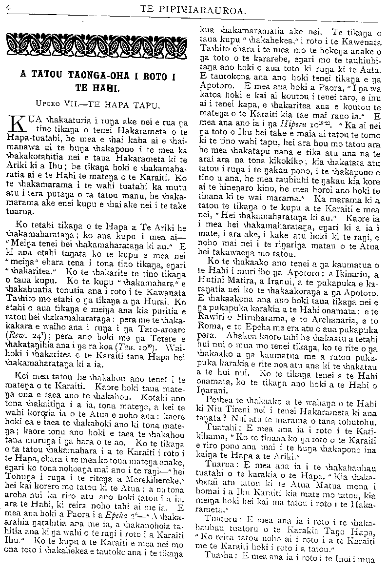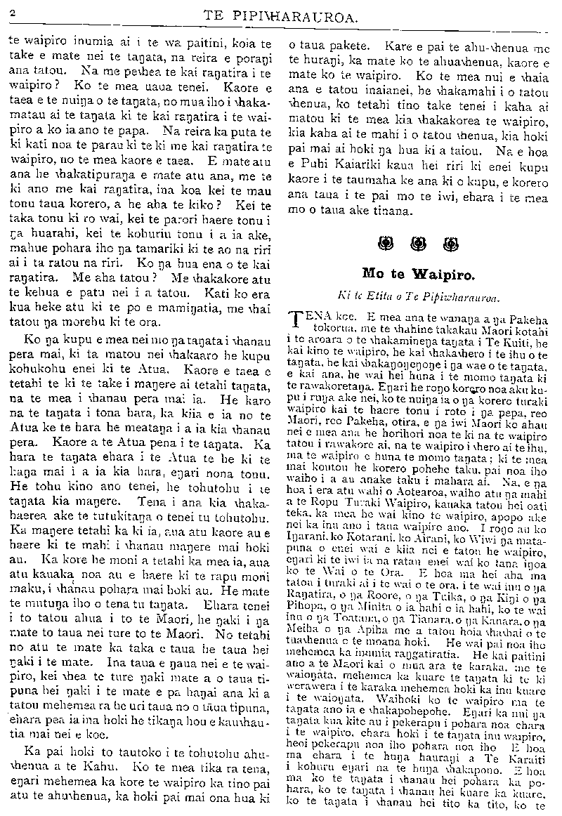 TE PIPIWHARAUROA. te waipiro inumia ai i te wa paitini, koia te take e mate nei te tangata, na reira e porangi ana tatou. Na me pewhea te kai rangatira i te waipiro? Ko te mea uaua tenei. Kaore e taea e te nuinga o te tangata, no mua iho i whaka- matau ai te tangata ki te kai rangatira i te wai- piro a ko ia ano te papa. Na reira ka puta te ki kati noa te parau ki te ki me kai rangatira te waipiro, no te mea kaore e taea. E mate atu ana he whakatipuranga e mate atu ana, me te ki ano me kai rangatira, ina koa kei te mau tonu taua korero, a he aha te kiko? Kei te taka tonu ki ro wai, kei te parori haere tonu i nga huarahi, kei te kohunu tonu i a ia ake, mahue pohara iho nga tamariki ki te ao na riri ai i ta ratou na riri. Ko nga hua ena o te kai rangatira. Me aha tatou? Me whakakore atu te kehua e patu nei i a tatou. Kati ko era kua heke atu ki te po e mamingatia, me whai tatou nga morehu ki te ora. Ko na kupu e mea nei mo nga tangata i whanau pera mai, ki ta matou nei whakaaro he kupu kohukohu enei ki te Atua. Kaore e taea e tetahi te ki te take i mangere ai tetahi tangata, na te mea i whanau pera mai ia. He karo na te tangata i tona hara, ka kiia e ia no te Atua ke te hara he meatanga i a ia kia whanau pera. Kaore a te Atua pena i te tangata. Ka hara te tangata ehara i te Atua te he ki te hanga mai i a ia kia hara, engari nona tonu. He tohu kino ano tenei, he tohutohu i te tangata kia mangere. Tena i ana kia whaka- haerea ake te tutukitanga o tenei tu tohutohu. Ka mangere tetahi ka ki ia, aua atu kaore au e haere ki te mahi i whanau mangere mai hoki au. Ka kore he moni a tetahi ka mea ia, aua atu kauaka noa au e haere ki te rapu moni maku, i whanau pohara mai hoki au. He mate te mutunga iho o tena tu tangata. Ehara tenei i to tatou ahua i to te Maori, he ngaki i nga mate to taua nei ture to te Maori. No tetahi no atu te mate ka taka e taua he taua hei ngaki i te mate. Ina taua e ngaua nei e te wai- piro, kei whea te ture naki mate a o taua ti- puna hei ngaki i te mate e pa hangai ana ki a tatou mehemea ra he uri taua no o taua tipuna, ehara pea ia ina hoki he tikanga hou e kauwhau- tia mai nei e koe. Ka pai hoki to tautoko i te tohutohu ahu- whenua a te Kahu. Ko te mea tika ra tena, engari mehemea ka kore te waipiro ka tino pai atu te ahuwhenua, ka hoki pai mai ona hua ki o taua pakete. Kare e pai te ahu-whenua me te hurangi, ka mate ko te ahu-whenua, kaore e mate ko te waipiro. Ko te mea nui e whaia ana e tatou inaianei, he whakamahi i o tatou whenua, ko tetahi tino take tenei i kaha ai matou ki te mea kia whakakorea te waipiro, kia kaha ai te mahi i o tatou whenua, kia hoki pai mai ai hoki nga hua ki a tatou. Na e hoa e Puhi Kaiariki kaua hei riri ki enei kupu kaore i te taumaha ke ana ki o kupu, e korero ana taua i te pai mo te iwi, ehara i te mea mo o taua ake tinana. Mo te Waipiro. Ki te Etita o Te Pipiwharauroa. TENA koe. E mea ana te wananga a na Pakeha tokorua, me te whahine takakau Maori kotahi i te aroara o te whakaminenga tangata i Te Kuiti, he kai kino te waipiro, he kai whakawhero i te ihu o te tanata, he kai whakangongengonge i nga wae o te tanata, e kai ana, he wai hei huna i te momo tangata ki te rawakoretanga. Engari he rongo korero noa aku ku- pu i runga ake nei, ko te nuinga ia o na korero turaki waipiro kai te haere tonu i roto i na pepa, reo Maori, reo Pakeha, otira, e na iwi Maori ko ahau nei e mea ana he horihori noa te ki na te waipiro tatou i rawakore ai. na te waipiro i whero ai te ihu, ma te waipiro e huna te momo tanata; ki te mea mai koutou he korero pohehe taku, pai noa iho waiho i a au anake taku i mahara ai. Na. e na hoa i era atu wahi o Aotearoa. waiho atu nga mahi a te Ropu Turaki Waipiro, kauaka tatou hei oati teka, ka mea he wai kino te waipiro, apopo ake nei ka inu ano i tana waipiro ano. I rongo an ko Ingarani ko Kotarani. ko Airani, ko Wiwi na mata- puna o enei wai e kiia nei e tatou he waipiro, engari ki te iwi ia na ratau enei wai ko tana ingoa ko te Wai o te Ora. E hoa ma hei aha ma tatou i turaki ai i te wai o te ora, i te wai inu o na Rangatira, o na Roore, o nga Tuika, o nga Kini o na Pihopa, o na Minita o ia hahi o ia hahi, ko te wai inu o na Toataua o nga Tianara, o nga Kanara, o nga Meiha o na Apiha me a tatou hoia whawhai o te tuawhenua o te moana hoki. He wai pai noa iho mehemea ka inumia rangatiratia. He kai paitini ano a te Maori kai o mua ara te karaka, me te waiongata, mehemea ka kuare te tangata ki te ki werawera i te karaka mehemea hoki ka inu kuare i te waiongata. Waihoki ko te waipiro ma te tanata ano ia e whakapohepohe. Engari ka nui nga tanata kua kite an i pekerapu i pohara noa ehara i te waipiro, ehara hoki i te tangata inn waipiro, heoi pekerapu noa iho pohara noa iho E hoa ma ehara i te huna haurangi a Te Karaiti i kohuru engari na te hunga whakapono. E hoa ma ko te tangata i whanau hei pohara ka po- hara, ko te tangata i whanau hei kuare ka kuare, ko te tanata i whanau hei tito ka tito, ko te