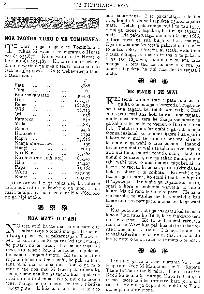 TE PIPIWHARAUROA NGA TAONGA TUKU O TE TOMINIANA. TE wariu o nga toanga o te Tominiana i tukua ki waho i te marama o Hurae nei £1.053; 877 Kote wariu o te Hurae o tera tau £1, 295, 487- Ka kitea iho te hekenga iho o te wariu o nga mea o tenei marama i to tera tau £240, 000. Ko te wehewehenga tenei o taua moni:— £ Pata ... ... ... 3806 Tiihi ... ... ... 4164 Kau whakamatao ... 30,453 Hipi „ ... ... 112, 571 Reme „ ... ... 162, 853 Witi .'.. ... ... 16, 719 Oti ... ... ... 958 Parareka ... ... 640 Muka ... ... ... 17-885 Rapeti ... ... ... 9436 Harakeke ... ... 1792 Kapia ... ... ... 34,616 Kaanga me era mea ... 599 Haapi ... ... ... 2014 Kiri Kau ... ... 17, 868 Kiri hipi (me etahi atu) 65, 347 Hinu ... ... ... 52,407 Papa ... ... ... 53,260 Wuru ... ... ... 257, 099 Koura ... ... ... 199,073 Ki te tirohia iho nga whika nei, ka kitea e tatou nuku atu i te hawhe o nga moni i hua mai i te hipi, ina hoki kei te tae ki te £600, 000 no nga hipi anake. NGA MATE O ITARI. NO tera wiki ka tae mai nga whakaatu o te pakarutanga o tetahi maunga i te whenua o Itari, i penei me te pakarutanga o Tarawera • nei. E kiia ana ka 85 nga rua kei taua maunga he putanga no te ngawha. He pakarutanga nui rawa atu tenei: kotahi te taone i tapukena, he maha nga tangata i mate. Ko te maunga tino rongo nui tenei mo tenei mahi, he pakaru tonu tana mahi mai o mua iho. Mai o na ra o mua a tae noa mai ki tenei pakarutanga ka mano, mano noa iho nga tangata kua tapukea e ia ki raro ki te whenua. Ko te nui o te take o tenei maunga e 90 maero, ko tona tiketike 10, 850 putu. E kiia ana kua tae ki te loo ona pakarutanga. I te pakarutanga o te tau 1169 kotahi te taone i tapukea 15, 000 tangata i mate. Tetahi pakarutanga nui i te tau 1537, e rua nga taone i tapukea, he tini nga tangata i mate. He pakarutanga nui ano i te tau 1666, e toru rawa nga rua hunga o taua maunga. Engari e kiia ana ko tetahi pakarutanga kino ko to te tau 1661, i titorehia ai tetahi wahi tonu u taua maunga, 12 maero te roa o te pakaru. I nga tau 1852 e 9 marama e hu ana taua maunga. I tera tau ka hu ano, a e rua nga taone i tapukea, he tini noa iho te tanata i mate. HE MATE I TE WAI. KEI tetahi wahi o Itari e patu mai ana te ngawha o te maunga e korerotia i runga ake nei i ana tangata, kei tetahi atu wahi o Itari ano e patu mai ana hoki te wai i ana tangata: me te mea tonu tera he tikanga whakamau ta nga kaha o te ao ki te whenua o Itari me tona iwi. Tetahi ua nui kei etahi o nga wahi o taua whenua inaianei, ko te ahua kaore i ua engari i tahoro tonu mai te kapua i ona wai ki runga ki etahi o nga wahi o taua whenua. Inahoki hei te rere mai te wai i te taha o nga maunga he awa nui tonu, mauria tonutia mai nga kowhatu nunui o te maunga, me nga rakau nunui, me te tahi wahi tonu o aua maunga tapukea ai nga taone i te raorao ki te paruparu, tukitukia atu hoki nga whare e te kowhatu. Ko etahi o nga taone i ngaro katoa, ko etahi i tae ki te 6 putu te tapukenga. He maha nga tangata kua mate, engari e kore e mohiotia wawetia to ratou kaute, kia oti rano te huke te paru. He hanga, whakaaroha te wahine me te tamariki e kau haere ano i ro paruparu, e oma ana ki nga wahi ora. Kua puta ano hoki nga whakaatu kei te noho kino a Itari raua ko Take, ki te whakaaro tera raua e whawhai. Ko ta te Tiamani raruraru raua ko te Wiwi kua pai, kua oti te whakarite- rite i waenganui i a raua. Ina noa te ahua o te whakariterite i te raruraru, ehara e tuku atu ma te ngutu o te pu raua ko te mata o te hoari. I te 11 o na ra o tenei marama ka tu te Hupirimi Kooti ki Mahitaone, ko Ta Rapata Taute te Tiati i tae ki reira. I te ra i tu ai te Kooti ka homai he Karapu Ma ki te Tiate, no te mea kaore tahi he raruraru hara (criminal cases). He nui nga kupu whakamihi a te Tiate mo ie pai o Mahitaone.