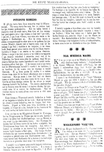 HE KUPU WHAKAMARAMA. 9 PITOPITO KORERO. E 38 nga ruru hou kua mauria mai ki Here- taunga. Ko aua ruru he ma, ko to ratou kai ko nga manu pakupaku. Ko te take tenei i mauria mai ai enei raru, kia riro ai ko ratou hei patupatu atu i nga manu e kai nei i nga witi, i nga oti, i nga hua rakau, me era atu mea a te tangata i whakatipu ai. Ko te mea rawa e ahau awangawangatia ake ana e te ngakau ko nga manu Maori, kaore nei e haere ana mai ki te tahae i nga kai i mahia e te tangata; i te mea hoki kua penei ano ratou me te iwi kua more- hurehu i runga i te mata o to ratou whenua. Otira i runga i te nui rawa o te nihi o te tangata i nga manu tokokai i mauria mai nei e te Pakeha, ka kore noa ake te ngakau tangi ki nga manu kainga ka mate karakore nei i enei raru- koukou-atua kai po. I te taenga mai o nga raru nei ki Heretaunga kotahi i mate i te tauhou, i te tauhou ki te wera me te matao o tenei whenua. E 4 kua puta ki waho i o ratou whare kua rere ki te kimi okiokinga mo o ratou waewae. Ko nga mea i toe iho kei ro whare tonu e noho ana, kia rite rano ki te wa e mo- hiotia ai kua taunga ratou ki te ahua o tenei whenua katahi ka tukua. Oa manu pakupaku nei e koatu ana ki roto i o ratou whare, he nga- wari noa ki a ratou te whakamate. Ko te maina rawa te mea ahua roa rawa e riri ana ka mate. Kua kitea e Tiamani tetahi kakahu e kore ai te tangata e totohu ki te wai. Kei te hunaia te ahua o taua kakahu, me te nana, kei mo- hiotia. Engari e kiia ana kite komotia e te tangata ki runga ki a ia, katahi ia ka haere ai ki ro wai noho ai kore rawa ia e totohu. I te 18 ka tu te Hupirimi Kooti ki Turanga, ko te Hapimana te Tiate nga raruraru katoa i roto i te pire hei whakahaerenga ma te Kooti e 20, enei 13 nga raruraru hara. Ko Turanga he taone kei te mau tonu ki te hoko waipiro, ko Mahitaone kua kore te waipiro. Ka kitea i konei te rereke o te taone kai waipiro o te taone hoki kaore e kai ana. lie hana whaka- miharo ko na taone anake kua whakakore i te waipiro e penei ana me Mahitaone nei. Ue mea tenei hei whakaatu ki a tatou i te nui ona raruraru e putake mai ana i te waipiro. I tetahi ra e haere ana etahi tanata tokorua, he Ingarihi tetahi he Ariki tetahi. I a raua e korero haere ana ka mea te Ingarihi, " E Pari kia mohio koe he kai he unu hoki te waipiro." Te hokinga o te Ingarihi ki te kainga ka taka ki ro maunga wai, takoto tonu atu i reira. Te ki- tenga o tona hoa e takoto ana i ro awa katahi ka karanga atu, " E ta i ki mai ra koe ki au he kai he inu te waipiro, katahi nei ia au ka mo- hio he horoi he moenga ano hoki etahi o ana mahi." I tetahi tanata e kauwhau ana mo te turaki waipiro, ka karanga ake tetahi tanata i roto i te huihui, " Kia kai tonu au i taku pai ka kaha katoa au, ano ka hina i au te whare te taraki." Ka whakahokia e te kai kauwhau, "Na taku wharenga i te waipiro i kaha ai toku tinana, a taea ana e au te whakatu e rua na whare. NGA WHENUA MAORI. Ki te 31 o nga ra o te Maehe ka taha ka nga eka whenua kore taitara i whakahaerea e te Kooti Whenua Maori 186,679½, ko nga keehi i roherohea 833. hui katoa na eka 503, 820. I tua atu i enei e 49 nga keehi i wha- kawhitiwhitia, ko na eka e 21,628. E 24 na riihi i whakamana, ko nga eka 5086. I raro i te whakahaere a te Poari Whenua Maori e 435 nga riihi i whakama, ko na eka 116, 498. Ko nga taitara i whakawhitiwhitia 660, ko nga eka 78, 346 I raro i te tikanga o te Ture Whenua Maori o te tau 1909 e 52 na taitara i whakwhitia ko nga eka e 98, 921. Hui katoa nga eka i whakahaerea e enei 395,766. I tenei tau i whakahaua e nga Poari nei kia ruritia na whenua, ko o ratou eka nei ina huia, e 112, 685, a kia oti ana wahi te ruri ka puare mo te hoki. Tekau-ma-rua na tuna hui a te Poari Hoko Whenua Maori, a e 602, 074 nga eka korerore- rotia mo te hoko. Ko na eka kua hokona mai e 75-437. ko na mea kei te whakaaroaroa e 430.560. WHAKANOHO WHENUA. KO na Ropu whakanohonoho whenua i raro i te mana o te ture 18, ko nga tangata o aua ropu 107 Ko na whenua i whakahaerea e 14, 9651 ko te wariu o aua whenua £209.577 He nui ano hoki na whenua i hokona e te Kawanatanga hei whakanohonnoho, i raro i te mana o te Ture whakanohonoho. Hui katoa na eka i hokona hei penei 14-39 3 ko te wariu, £15,796