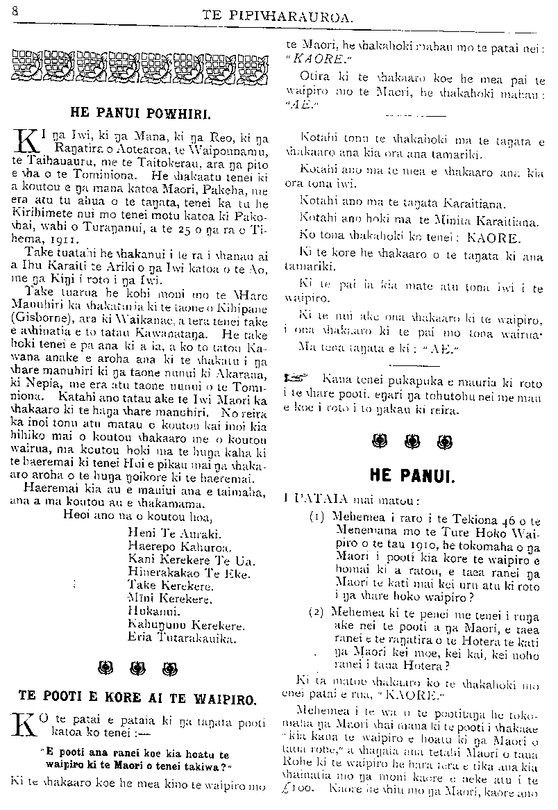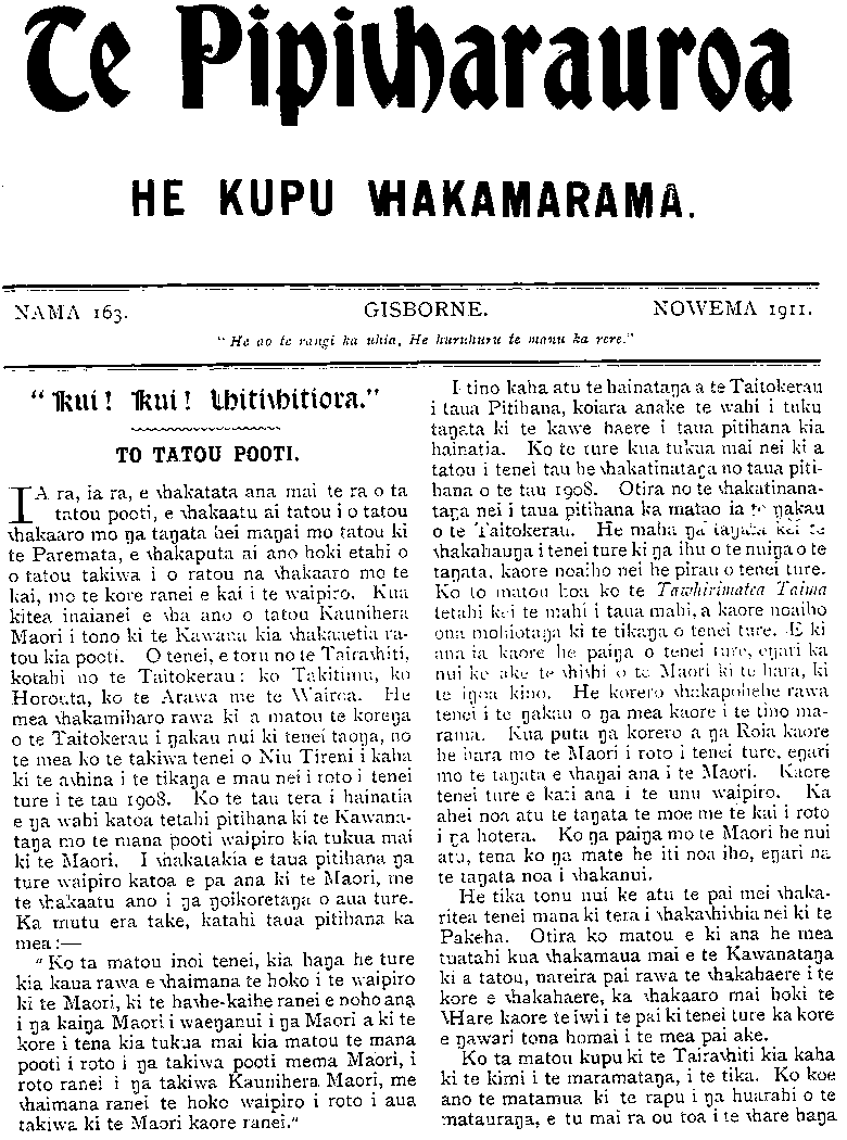 Te Pipiwharauroa HE KUPU WHAKAMARAMA. NAMA 163. GISBORNE. " He ao te rangi ka uhia, He huruhuru te manu ka rere." NOWEMA 1911. "Kui! Kui! Whitiwhitiora." TO TATOU POOTI. IA ra, ia ra, e whakatata ana mai te ra o ta tatou pooti, e whakaatu ai tatou i o tatou whakaaro mo nga tangata hei mangai mo tatou ki te Paremata, e whakaputa ai ano hoki etahi o o tatou takiwa i o ratou na whakaaro mo te kai, mo te kore ranei e kai i te waipiro. Kua kitea inaianei e wha ano o tatou Kaunihera Maori i tono ki te Kawana kia whakaaetia ra- tou kia pooti. O tenei, e toru no te Tairawhiti, kotahi no te Taitokerau: ko Takitimu, ko Horouta, ko te Arawa me te Wairoa. He mea whakamiharo rawa ki a matou te korenga o te Taitokerau i ngakau nui ki tenei taonga, no te mea ko te takiwa tenei o Niu Tireni i kaha ki te awhina i te tikanga e mau nei i roto i tenei ture i te tau 1908. Ko te tau tera i hainatia e nga wahi katoa tetahi pitihana ki te Kawana- tanga mo te mana pooti waipiro kia tukua mai ki te Maori. I whakatakia e taua pitihana nga ture waipiro katoa e pa ana ki te Maori, me te whakaatu ano i nga ngoikoretanga o aua ture. Ka mutu era take, katahi taua pitihana ka mea:— " Ko ta matou inoi tenei, kia hanga he ture kia kaua rawa e whaimana te hoko i te waipiro ki te Maori, ki te hawhe-kaihe ranei e noho ana i nga kainga Maori i waenganui i nga Maori a ki te kore i tena kia tukua mai kia matou te mana pooti i roto i nga takiwa pooti mema Maori, i roto ranei i nga takiwa Kaunihera Maori, me whaimana ranei te hoko waipiro i roto i aua takiwa ki te Maori kaore ranei." I tino kaha atu te hainatanga a te Taitokerau i taua Pitihana, koiara anake te wahi i tuku tangata ki te kawe haere i taua pitihana kia hainatia. Ko te ture kua tukua mai nei ki a tatou i tenei tau he whakatinatanga no taua piti- hana o te tau 1908. Otira no te whakatinana- tanga nei i taua pitihana ka matao ia te ngakau o te Taitokerau. He maha nga tangata kei te whakahaunga i tenei ture ki nga ihu o te nuinga o te tanata, kaore noaiho nei he pirau o tenei ture. Ko to matou hoa ko te Tawhirimatea Taima tetahi kei te mahi i taua mahi, a kaore noaiho ona mohiotanga ki te tikanga o tenei ture. E ki ana ia kaore he painga o tenei ture, engari ka nui ke ake te whiwhi o te Maori ki te hara, ki te ingoa kino. He korero whakapohehe rawa tenei i te ngakau o nga mea kaore i te tino ma- rama. Kua puta nga korero a na Roia kaore he hara mo te Maori i roto i tenei ture engari mo te tangata e whangai ana i te Maori. Kaore tenei ture e kati ana i te unu waipiro. Ka ahei noa atu te tangata te moe me te kai i roto i nga hotera. Ko nga painga mo te Maori he nui atu, tena ko nga mate he iti noa iho, engari na te tangata noa i whakanui. He tika tonu nui ke atu te pai mei whaka- ritea tenei mana ki tera i whakawhiwhia nei ki te Pakeha. Otira ko matou e ki ana he mea tuatahi kua whakamaua mai e te Kawanatanga ki a tatou, nareira pai rawa te whakahaere i te kore e whakahaere, ka whakaaro mai hoki te Whare kaore te iwi i te pai ki tenei ture ka kore e ngawari tona homai i te mea pai ake. Ko ta matou kupu ki te Tairawhiti kia kaha ki te kimi i te maramatanga, i te tika. Ko koe ano te matamua ki te rapu i nga huarahi o te matauranga, e tu mai ra ou toa i te whare hanga
