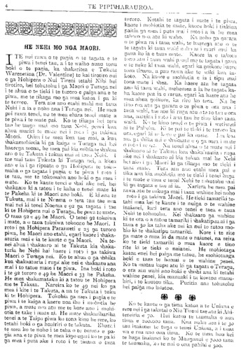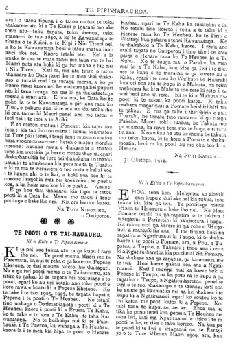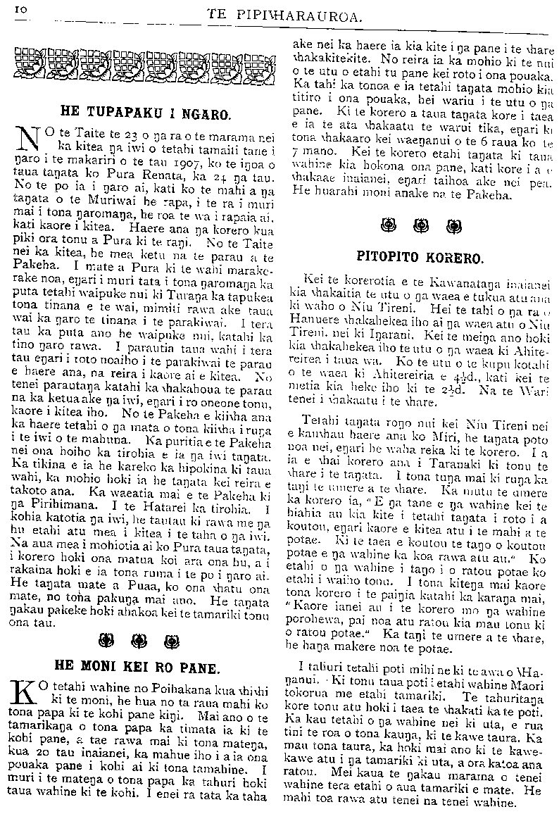 IO TE PIPIWHARAUROA. HE TUPAPAKU I NGARO. NO te Taite te 23 o nga ra o te marama nei ka kitea nga iwi o tetahi tamaiti tane i ngaro i te makariri o te tau 1907? ko te ingoa o taua tangata ko Pura Renata, ka 24 nga tau. No te po ia i ngaro ai, kati ko te mahi a nga tangata o te Muriwai he rapa, i te ra i muri mai i tona ngaromanga, he roa te wa i rapaia ai. kati kaore i kitea. Haere ana nga korero kua piki ora tonu a Pura ki te rangi. No te Taite nei ka kitea, he mea ketu na te parau a te Pakeha. I mate a Pura ki te wani marake- rake noa, engari i muri tata i tona ngaromanga ka puta tetahi waipuke nui ki Turanga ka tapukea tona tinana e te wai, mimiti rawa ake taua wai ka ngaro te tinana i te parakiwai. I tera tau ka puta ano he waipuke nui, katahi ka tino ngaro rawa. I parautia taua wahi i tera tau engari i roto noaiho i te parakiwai te parau e haere ana, na reira i kaore ai e kitea. No tenei parautanga katahi ka whakahoua te parau na ka ketua ake nga iwi, engari i ro oneone tonu, kaore i kitea iho. No te Pakeha e kiiwha ana ka haere tetahi o nga mata o tona kiiwha i runga i te iwi o te mahuna. Ka puritia e te Pakeha nei ona hoiho ka tirohia e ia nga iwi tangata. Ka tikina e ia he kareko ka hipokina ki taua wahi, ka mohio hoki ia he tangata kei reira e takoto ana. Ka waeatia mai e te Pakeha ki nga Pirihimana. I te Hatarei ka tirohia. I kohia katotia nga iwi, he tautau ki rawa me nga hu etahi atu mea i kitea i te taha o nga iwi. Na aua mea i mohiotia ai ko Pura taua tangata, i korero hoki ona matua koi ara ona hu, a i rakaina hoki e ia tona ruma i te po i ngaro ai. He tangata mate a Puaa, ko ona whatu ona mate, no toha pakunga mai ano. He tangata ngakau pakeke hoki ahakoa kei te tamariki tonu ona tau. HE MONI KEI RO PANE. KO tetahi wahine no Poihakena kua whiwhi ki te moni, he hua no ta raua mahi ko tona papa ki te kohi pane kingi, Mai ano o te tamarikanga o tona papa ka timata ia ki te kohi pane, a tae rawa mai ki tona matenga, kua 20 tau inaianei, ka mahue iho i a ia ona pouaka pane i kohi ai ki tona tamahine. I muri i te matenga o tona papa ka tahuri hoki taua wahine ki te kohi. I enei ra tata ka taha ake nei ka haere ia kia kite i nga pane i te whare whakakitekite. No reira ia ka mohio ki te nui o te utu o etahi tu pane kei roto i ona pouaka. Ka tahi ka tonoa e ia tetahi tangata mohio kia titi ro i ona pouaka, hei wariu i te utu o nga pane. Ki te korero a taua tangata kore i taea e ia te ata whakaatu te warui tika, engari ki tona whakaaro kei waenganui o te 6 raua ko te 7 mano. Kei te korero etahi tangata ki taua wahine kia hokona ona pane, kati kore i a e whakaae inaianei, engari taihoa ake nei pea. He huarahi moni anake na te Pakeha. PITOPITO KORERO. Kei te korerotia e te Kawanatanga inaianei kia whakaitia te utu o nga waea e tukua atu ana ki waho o Niu Tireni. Hei te tahi o nga ra o Hanuere whakahekea iho ai nga waea atu o Niu Tireni. nei ki Ingarani. Kei te meinga ano hoki kia whakahekea iho te utu o na waea ki Ahite- reirea i taua wa. Ko te utu o te kupu kotahi o te waea ki Ahitereiria e 4½d kati kei te metia kia heke iho ki te 2½d. Na te Wari tenei i whakaatu i te whare. Tetahi tanata rongo nui kei Niu Tireni nei e kauwhau haere ana ko Miri, he tangata poto noa nei, engari he waha reka ki te korero. I a ia e whai korero ana i Taranaki ki tonu te whare i te tangata. I tona tunga mai ki runga ka tangi te umere a te whare. Ka mutu te umere ka korero ia, " E nga tane e nga wahine kei te hiahia au kia kite i tetahi tanata i roto i a koutou, engari kaore e kitea atu i te mahi a te potae. Ki te taea e koutou te tango o koutou potae e nga wahine ka koa rawa atu au." Ko etahi o na wahine i tango i o ratou potae ko etahi i waiho tonu. I tona kitenga mai kaore tona korero i te paingia katahi ka karanga mai, " Kaore ianei au i te korero mo nga wahine porohewa, pai noa atu ratou kia mau tonu ki o ratou potae." Ka tangi te umere a te whare, he hanga makere noa te potae. I tahuri tetahi poti mihi ne ki te awa o Wha- nganui. Ki tonu taua poti i etahi wahine Maori tokorua me etahi tamariki. Te tahuritanga kore tonu atu hoki i taea te whakati ka te poti. Ka kau tetahi o nga wahine nei ki uta, e rua tini te roa o tona kaunga, ki te kawe taura. Ka mau tona taura, ka hoki mai ano ki te kawe- kawe atu i nga tamariki ki uta, a ora katoa ana ratou. Mei kaua te ngakau marama o tenei wahine tera etahi o aua tamariki e mate. He mahi toa rawa atu tenei na tenei wahine.
