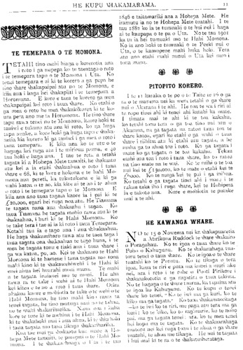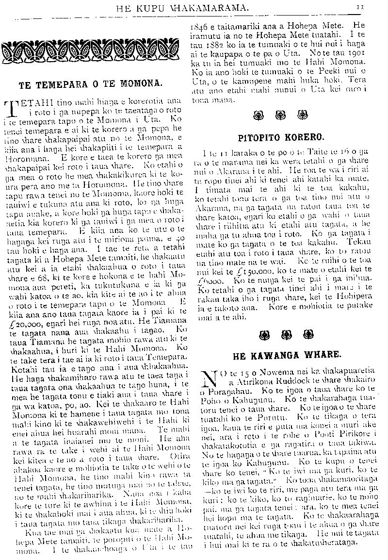 HE KUPU WHAKAMARAMA. 11 TE TEMEPARA O TE MOMONA. TETAHI tino mahi hianga e korerotia ana i roto i na nupepa ko te taeatanga o roto i te temepara tapu o te Momona i Uta. Ko tenei temepara e ai ki te korero a na pepa he tino whare whakapaipai atu no te Momona, e kiia ana i hanga hei whakapiiti i te temepara a Horomana. E kore e taea te korero na mea whakapaipai kei roto i taua whare. Ko etahi o na mea o roto he mea whakakikorea ki te ko- ura pera ano me la Horomona. He tino whare tapu rawa tenei no te Momona, kaore hoki te tauiwi e tukuna atu ana ki roto, ko na hunga tapu anake, a kore hoki na huna tapu e whaka- aetia kia korero ki na tauiwi i nga mea o roto i taua temepara. E kiia ana ko te utu o te hanganga kei runa atu i te miriona pauna, e 40 tau hoki e hanga ana. I tae te reta a tetahi tangata ki a Hohepa Mete tamaiti, he whakaatu atu kei a ia etahi whakaahua, o roto i taua whare e 68, ki te kore e hokona e te hahi Mo- mona aua pereti, ka tukutukuna e ia ki na wahi katoa o te ao. kia kite ai te ao i te ahua o roto i te temepara tapu o te Momona E kiia ana ano taua tangata kaore ia i pai ki te £20, 000, engari hei runa noa atu. He Tiamana te tangata nana aua whakaahu i tangao. Ko taua Tiamana he tangata mohio rawa atu ki te whakaahua, i huri ki te Hahi Momona. Ko te take tera i tae ai ia ki roto i taua Temepara. Kotahi tau ia e tango ana i aua whakaahua. He hanga whakamiharo rawa atu te taea tana i taua tangata ona whakaahua te tango huna, i te mea he tangata tonu e tiaki ana i taua whare i na wa katua, po, ao. Kei te whakaaro te Hahi Momona ki te hamene i taua tanata mo tona mahi kino ki te whakawehi wehi i te Hahi ki enei ahua hei huarahi muni mana. Te mahi a te tanata inaianei mo te moni. He aha rawa ra te take i wehi ai te Hani Momona kei kitea e te ao a roto i taua whare. Otira ahakoa kaore e mohiotia te take o te wehi o te Hahi Momona, he tino mahi kino rawa ta tenei tangata, he tino mutunga mai no te tahae, no te ma! u whakariharika. Nana noa i kaha kore te ture ki te awhina i te Hahi Momona, ki te whakahoki mai i aua ahua,, ki te whiu hoki i taua tangata mo tana tikanga whakarihariha. Kua tae mai na whakaatu kua mate a Ho- hepa Mete tamaiti, te poropiti o te Hahi Mo- mona I te whakanohoanga o Uta i te tau 1846 e taitamariki ana a Hohepa Mete. He iramutu ia no te Hohepa Mete tuatahi. I te tau 1882 ko ia te tumuaki o te hui nui i hana ai te kaupapa o te pa o Uta. Note tau 1901 ka tu ia hei tumuaki mo te Hahi Momona. Ko ia ano hoki te tumuaki o te Peeki nui o Uta, o te kamupene mahi huka hoki. Tera atu ano etahi mahi nunui o Uta kei raro i tona mana. PITOPITO KORERO. I te 11 karaka o te po o te Taite te 16 o na ra o te marama nei ka wera tetahi o nga whare nui o Akarana i te ahi. He roa te wa i riri ai te ropu tinei ahi ki tenei ahi katahi ka male. I timata mai te ahi ki te toa kakahu, ko tetahi tonu tera o na toa tino nui atu o Akarana, na nga tangata na ratou taua toa te whare katoa, engari ko etahi o na wahi o taua whare i riihitia atu ki etahi atu tangata a he maha nga tu ahua toa i roto. Ko nga tanata i ; nate ko na tanata o te tua kakahu. Tekau etahi atu toa i roto i taua whare, ko to ratou na tino mate na te wai. Ko te ruihi o te toa nui kei te £150, 000, ko te mate o etahi kei te £6000. Ko te nuinga kei te pai 1 na inihua. Ko tetahi o na tanata tinei ahi i mate i te rakau taka iho i runa whare, kei te Hohipera ia e takoto ana. Kore e mohiotia te putake mai a te ahi. HE KAWANGA WHARE. NO te 150 Nowema nei ka whakapuaretia a Atirikona Ruddock te whare whakairo o Porangahau. Ko te ingoa o taua whare ko te Pono o Kahungunu. Ko te whakarahanga tua- toru tenei o taua whare. Ko te ingoa o te whare tuatahi ko te Purutu. Ko te tikanga o tera ingoa, kaua te riri e puta ma konei a muri ake nei, ara i roto i te rohe o Pooti Pirikore i whakatakototia e nga rangatira o taua takiwa. No te hanganga o te whare tuarua, ka tapaina atu te ingoa ko Kahungunu. Ko te kupu o tenei whare ko tenei, " Ko te iwi ma nga kuri, ko te kiko ma na tangata." Ko tona whakamaoritanga ko te iwi ko te riri, mea panga atu tera ma nga kuri: ko te kiko, ko to rangimarie ko te noho pai ma nga tangata tenei: ara, ko te mea tenei hui hopu ma te tangata. Ko te whakaarahanga tuatoru nei kei runa tonu i te ahua o nga whare tuatahi, te ahua me tikanga. He nui te tangata i nui mai ki te ra o te whakatuwheratanga.