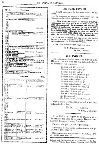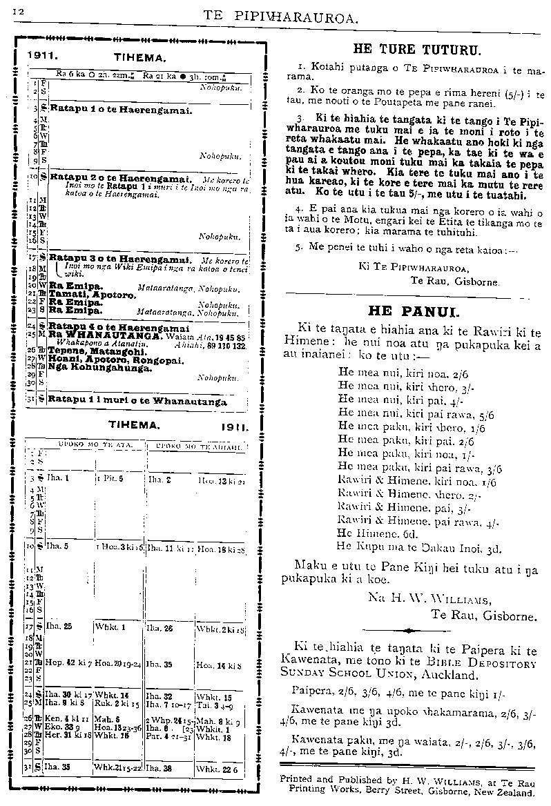 TE PIPIWHARAUROA. HE TURE TUTURU. 1. Kotahi putanga o TE PIPIWHARAUROA i te ma- rama. 2. Ko te oranga mo te pepa e rima hereni (5/-) i te tau, me nooti o te Poutapeta me pane ranei, auaka i te tiaki he pane kingi hepene nga pane e tino hiahiatia ana. 3. Ki te pau nga hereni a tetahi tangata i tuku mai ai ka tukua atu he kaute. Ki te tae atu te kaute kia hohoro te tuku mai i te moni, na te moni hoki i puta atu ai te pepa ehara i te mea tupu noa. 4. E pai ana kia tukua mai nga korero o ia wahi o ia wahi o te Motu, engari kei te Etita te tikanga mo te ta i aua korero : kia marama te tuhituhi. 5. Me penei te tuhi i waho o nga reta katoa: — Ki TE PIPIWHARAUROA, Te Rau, Gisborne. HE PANUI Ki te tangata e hiahia ana ki te Rawiri ki te Himene : he nui noa atu nga pukapuka kei a au inaianei : ko te utu : — He mea nui, kin noa ... 2/6 He mea nui, kiri wher ... 3/- He mea nui, kiri pai ... 4/— He mea nui kiri pai rawa ... 5/6 H e mea paku, kiri whero ... 1/6 H e mea paku, kiri pai . . . 2/6 He mea paku, kiri noa ... 1/- He mea paku, kiri pai rawa 3/6 Rawiri & Himene, kiri noa 1/6 Rawiri & Himene, whero ... 2/- Rawiri & Himene, pai ... 3/- Rawiri & Himene, pai rawa 4/- He Himene ... ... -/6 Maku e utu te Pane Kingi hei tuku atu i nga pukapuka ki a koe. Na H. W. WILLIAMS, Te Rau, Gisborne. Ki te hiahia te tangata ki te Paipera ki te, Kawenata, me tono ki te BIBLE DEPOSITORY SUNDAY SCHOOL UNION, Auckland. Paipera, 2/6, 3/6, 4/6, me te pane kingi //- Kawenata me nga upoko whakamarama 2/6 3/- 4/6, me te pane kingi 3d. Kawenata paku, me nga waiata 2/-, 2/6, 3/-, 3/6, 4/-, me te pane kingi, 3d. Printed and Published by H. W. WILLIAMS, at Te Rau Printing Works, Berry Street, Gisborne, New Zealand.