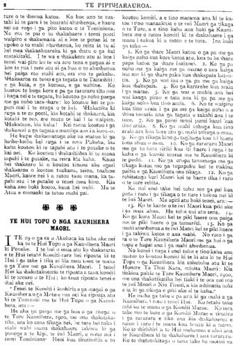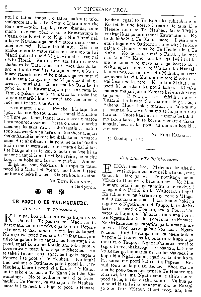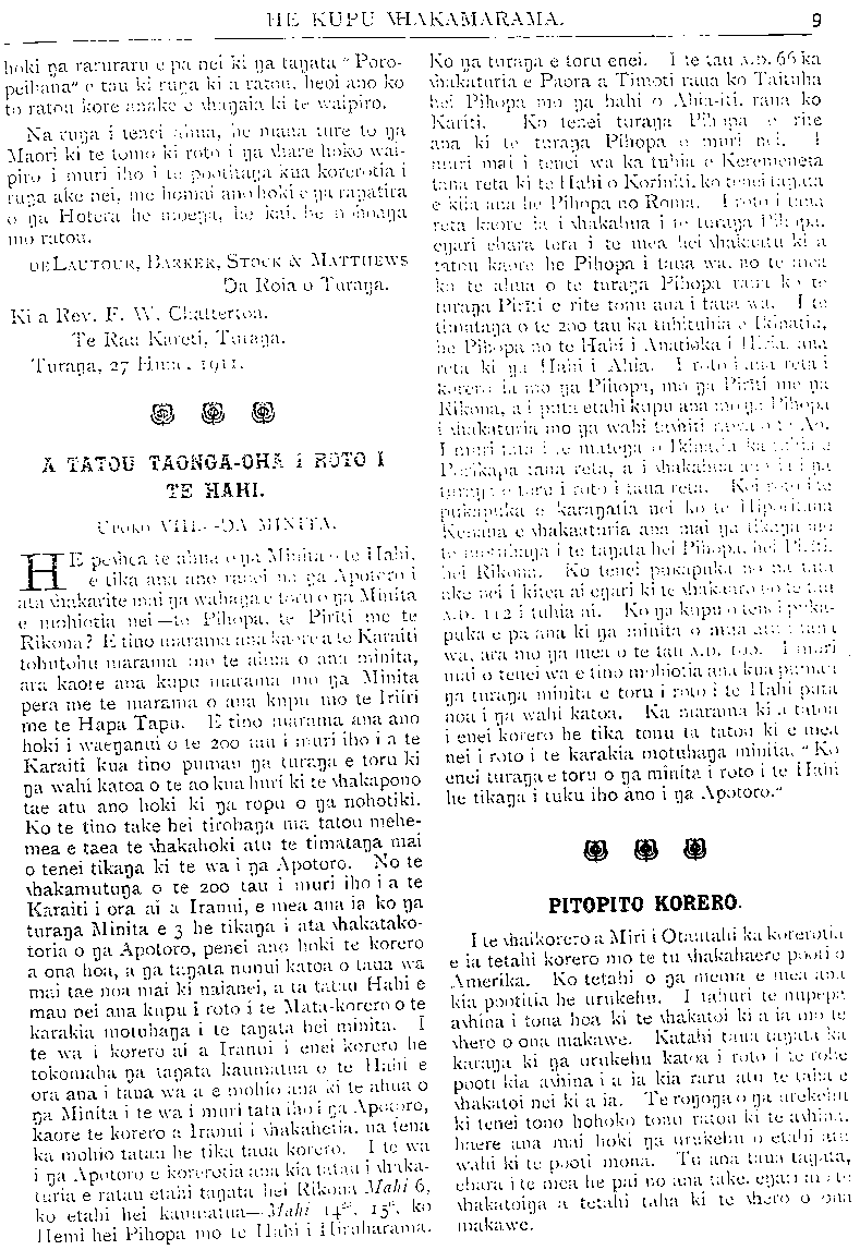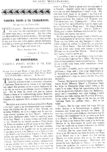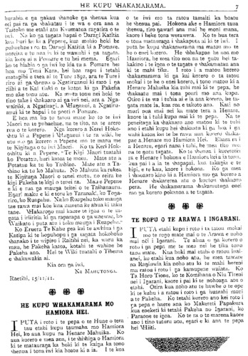 HE KUPU WHAKAMARAMA. hurahia e nga ngakau whanoke nga whenua kua oti pai ra nga whakatau i te wa e ora ana a Taitoko me etahi atu Kaumatua rangatira o te iwi. Na ko na tangata hapai o Ngarangi Katitia kua huri ke ki a Pepene, kua mohio hoki he puhaehae toa ta Ngarangi Katitia ki a Pomare, horeina e tu ana ia ki te wawahi i na tangata. kia kore ai a Pomare e tu hei mema. Engari ko te hiahia o na iwi ko kia tu a Pomare hei hoa mo Timi Kara, hei hoa rapu i tetahi matapihi e taea ai te Ture 1892, ara te Turei riro ai nga whenua o Ngatiruanui ki raro i na riihi a te Kai tiaki o te katoa ki nga Pakeha mo ake tonu atu. Ka mutu tonu nei hoki te tino take i whakaaro ai na iwi nei, ara a Nga- wairiki, a Ngatirangi. a Whanganui, a Ngatiru- anui ki te hapai i te pooti o Pomare. E hoa ma ko to tatou mate ko to te iwi Maori na te puhaehae, na te tito, na te arero rua o te korero. Nga korero a Kerei Hoko- whtu ki a Pepene i Whanganui i te ra wiki, he utu mo na korero a Pepene mo te mana me te Kingitanga o te iwi Maori. Ko ta Keri Hok- owhitu ki a Pepene, "Te Kini Maori tuatahi ko Potatau, huri katoa te motu. Mate atu a Potatau ka tu ko Tawhiao. Mate atu a Ta- whiao ka tu ko Mahuta. No Mahuta ka rukea te Kingitanga Maori o tenei motu, no reira he kingi Pakeha te kingi o tenei ra. Mau e Pepene e ki e rua nga maunga teitei o te Taihauauru. Engari maku e ki e toru ko Taranaki, ko Tonga- riro, ko Ruapehu. Nako Ruapehu toku maunga tae rawa mai koe kua marena ke ahua ki taku tane. Whakarongo mai kaore te ingoa o te ta- ngata i iriiritia ki nga raparapa o nga waewae, ko Waikato i puta atu i toku maunga i Ruapehu." Ko Eruera Te Kahu pea kai te awhina i nga Katipa ki te hopuhopu i nga tangata hokohoko whanako i te wipiro i Raitihi nei, ka waru ka mau, he Pakeha katoa, kotahi te wahine he Pakeha ano. Hei te Wiki tuatahi o Tihema e whakawakia ai. Kia ora nga iwi, Na MAHUTONGA. Raetihi, 15/1 1/11. HE KUPU WHAKAMARAMA MO HAMIORA HEI. IPUTA i roto i te pepa o te Hune o tera tau etahi kupu taumaha mo Hamiora Hei, ko aua kupu na Henare Mahuika. Ko aua korero e mea ana, i te whiwhinga o Hamiora ki te matauranga ka hoki ki te kainga ka tono whenua i tona iwi kia hoatu ki a ia. I te koa o te iwi mo ta ratou tamaiti ka hoatu he whenua pai. Hokona ake e Hamiora taua whenua, riro ngawari ana mai he moni mana, kaore i heke tona werawera. Ko te hua tera o toua matauranga i whakaputa ai ki te iwi. I puta he kupu whakamarama ma matou mo te he o enei korero. He whakapae he noa mo Hamiora, he mea tito noa na te ngutu hei ta- kakino i te ingoa o te tangata e whakamatau ana ki te mahi tika. I roto i a matou korero whakamarama ki nga kai korero o ta tatou mokai i te he o enei korero, i tono matou ki a Henare Mahuika kia tuhi mai ki te pepa, he whakaatu mai i tona pouri mo ana kupu. O tiro i te wa i tuhia ai e ia ana korero, he ta- ngata mate ia, kua roa e takoto ana. Kati no muri noa mai nei ka mate tera a Henare, kaore ia i tuhi kupu mai ki te pepa. Na te peneitanga ka whakaaro ano matou ki te tuhi ano i etahi kupu hei whakaatu ki nga hoa i nga wahi katoa kei te he rawa aua korero whaka- pae a Henare mo Hamiora Hei. Ehara ra i a Henare, engari nana i tuhi, he mea tito noa na te ngutu tangata. Ko te whenua i korerotia ra e Henare i hokona e Hamiora kei a ia tona, kua pai i a ia te whapapai, kua takangia e te hipi, e te kau, kaore i hokona. Ko nga mea i whaoaaro kino ki a Hamiora mo na korero a Henare whakarerea atu o koutou whakaaro pera. He whakamarama whakamutunga enei mo na korero pokanoa a te tanata. TE ROPU O TE ARAWA I INGARANI. I PUTA etahi kapu i rotu i ta tatou mokai mo te rongo mate mai o te Arawa e noho mai nei i Ingarani. Te ahua o nga korero o roto i nga pepa me te mea nei he tikanga tonu taua mate. Kua hoki mai etahi o ratou inai- anei, ko etahi kua noho atu, he mea taware na Rangiuwia kia noho atu ki te mahi hereni ma ratou i roto i nga kamupene waiata. Ko Ta Horo Tione, ko te Komihana o Niu Tireni nei i Ingarani, kaore i pai ki te nohoanga atu o etahi. Otira kua noho atu te hawhe o te ope ki te kuhu i a ratou i roto i nga huarahi moni a te Pakeha. Ko tetahi korero ano kei roto i nga pepa e haere ana ko Makereti Papakura kua eneketi ki tetahi Pakeha no Ingarani, ko Paraone te ingoa. Ko te ra o te marena kaore ano i tino tuturu noa, engari e ki ana te pepa hei Whiiti.