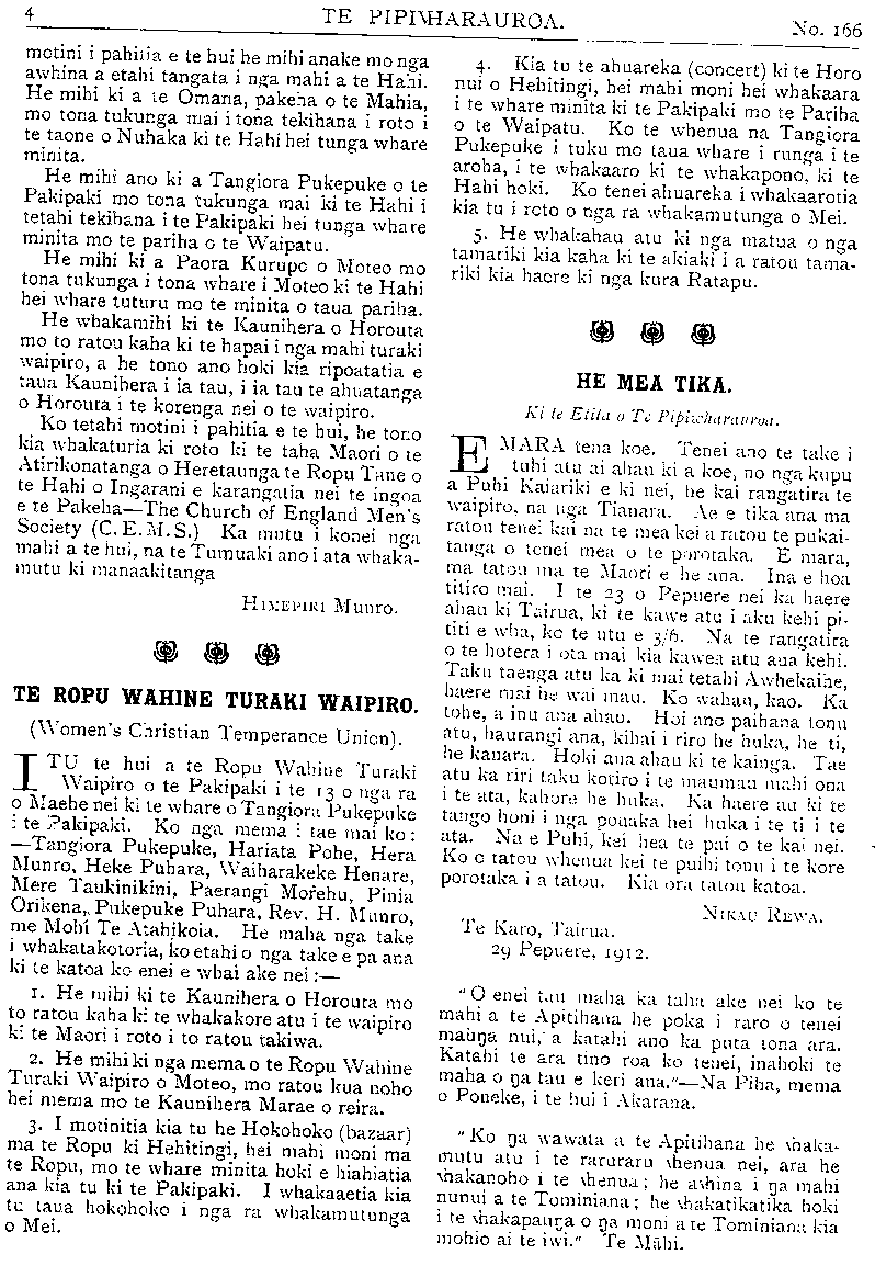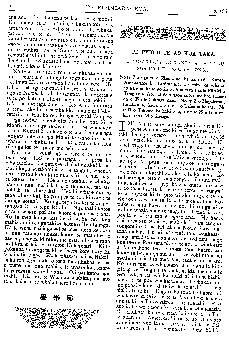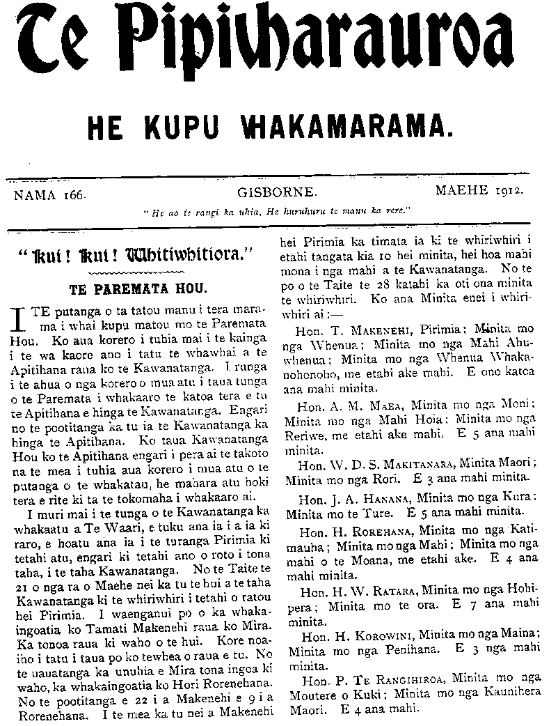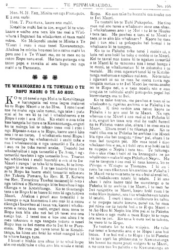 TE PIPIWHARAUROA. No. 166 Hon. H.H. ERE, Minita mo nga Poutapeta. E 2 ana mahi. Hon. T. PAKITANA, kaore ana mahi. Kotahi te mahi kei te toe, engari ki te wha- kaaro e waiho ana tera kia tae mai a Wiri- whata i Ingarani ka whakaritea ai taua mahi mana. Ko Makenehi anake te Minita a Te Waari i mau i roto tenei Kawanatanga. Ahakoa he minita hou enei ko a ratou mahi ka pera ano i a Te Waari ma, no te mea no to ratou Ropu tonu enei. Hei tera putanga o ta tatou pepa e rawaka ai ana kupu mo nga mahi o te Paremata. TE WHAIKORERO A TE TUMUAKI O TE ROPU MAORI O TE AO HOU. KO te 16 tenei o nga Hui a te Kotahitanga e karangatia nei tona ingoa inaianei ko te Ropu Maori o te Ao Hou. I roto i enei tau he maha nga take nunui, nga take i puta mai ai he ora ki te iwi i whakahaerea e te Ropu i roto i ana Hui. Ko etahi o aua take kua hangaia hei ture e te Kawanatanga, engari ko te nuinga kei te takoto tonu mai i roto i nga Ripoata-a-tau a te Ropu, kaore ano i kite noa i te ao turoa. I whakaturia tenei Ropu i te timatanga hei whakatutuki i etahi take e rua i whakaarohia e nga tamariki o Te Aute i aua ra he take nunui anake. Tuatahi hei whakahuihui i nga tamariki e Te Aute, i nga tamariki tavvhito i nga tamariki hou. Tuarua hei whiriwhiri i etahi huarahi e ora ai te lwi Maori i runga i te taha ki te tinana, ki te hine- ngaro ki te wairua. I te tau tuatahi tonu i tu ai te Ropu ka haere etahi tamariki tokotoru (ko Takuta Pomare, ko Rev. R. T. Kohere me Rev. Timutimu Tawhai inaianei) ki roto i nga takiwa o Heretaunga kite kauwhau i nga tikanga o te Kotahitanga. Ko te timatanga tera o te Ropu ki te haere ki roto ki nga takiwa Maori. Ahakoa i pouri aua tamariki i te korenga o nga kaumatua i aro mai ki a ratou tikanga i kauwhau ai i taua wa, kaore i whaka- rerea e ratou taua mahi, engari mau tonu te Ropu kua kiia ake nei hei 16 tenei mo ona tunga hui. I tenei tau e koa ana ahau i te mea tokotoru o nga tangata tuturu o tenei Ropu kua tu hei mema mo te Iwi ki te Pare- mata. He mea pai rawa tenei ki te Kotahi- tanga, ka kitea atu hoki ka whai mangai ia ki te whare hanga ture. 1 konei e hiahia ana ahau ki te whai kupu ake mo etahi take e tika ana kia whaia e tenei Ropu. Ko aua take! he huarahi ora anake mo te Iwi Maori. Te tuatahi ko te Tuhi Pukapuka. He tino mea nui atu tenei e whakaaro tona ana ahau. I whakahaerea ano i te Hui i tu ki te Hauke i tera tau. Me pewhea e taea ai te Maori e taea ai te ako kia whakaaro? Kaore he mea pai i tua atu i te pukapuka hei homai i te whakaaro ki te tangata. Ko to te Pakeha take tenei i mohio ai, a koia nei ano hoki he take e mohio ai te Maori. Kei te tawai noa tatou ki te ngakau tamariki o te Maori ki te moumou noa i tenei hanga i te moni, te whakamatau ki te tohutohu i te tuatahi. He mea ngawari tenei ki te Kotahi- tanga mehemea e ngakau nui ana. Ko te take i ngawari ai na te mea he maha rawa nga tangata matua o te Iwi Maori he mema anake no te Ropu nei, a e taea noatia atu e aua tangata te tuhituhi etahi pukapuka papai hei korerotanga ma te Iwi. Ko re take tuarua, me pewhea e taea ai te whakaoho te ngakau awhina o te Pakeha i te Maori. E tino mohio ana tatou kaore te Pakeha i te aro mai ki te Maori. Na nga whenua o te Maori i aro mai ai te Pakeha ki a ia, engari ko taua aro mai he mahi hereni na te Pakeha mana ake, ehara i te mea ma te Maori. Ehara tenei i te tikanga, pai. Ko te mahi tika ma te Pakeha he awhina i te Maori kia tipu; ake hei tangata " tino" pai, ehara i te mea hei tangata pai. He mea tenei i tino whakaarohia e au, a i tuhi reta ano hoki au ki te nupepa o Nepia i tera tau. Te tukunga iho o aku ritea i tuhi ai ka karangatia he po whaikorero maku ki nga Pakeha o Nepia. He nui te tangata i tae mai ki taua korero, ko te Pihopa o Waiapu te Tiamana. I ki au i reira he mea tika rawa kia awhina te Pakeha i te Maori no te mea tena te wa e hui ai enei iwi, kei whakahawea tetahi ki tetahi. I ki; ano ahau i reira kaore tahi he uauatanga o te Pakeha ki te awhina i te Maori, i te mea he Iwi rangatira te Maori, kaore hoki mua i te noho kino inaianei, ara i te whakahawea tetahi ki tetahi. I muri i taua whaikorero ka tuhia e te nupepa tetahi , penei na, he mea pai rawa me ta tetahi hui a te Ropu Maori o te Ao Hou ki Nepia kia kite pai ai te Pakeha i te ahua o nga mahi a tana Ropu; ki te rapu; ora mo te iwi. Ko tena korero kei te takoto, he wero ki te Ropu. Te tuatoru ko te take waipiro. He take nui tenei e korerotia ana e te Ropu i ana hui katoa. I te hui nui a te Ropu i tu ki Poneke i te taua 1908 ka pitihanatia te Kawanatanga kia homai he mana pooti waipiro ki te Maori, a no tera tau ka pahitia e te Kawanatanga ko