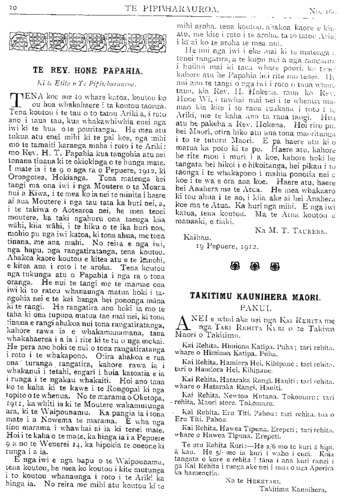 10 TE PIPIWHARAUROA. No. 160, TE REV. HONE PAPAHIA. Ki te Etita o Te Pipiwharauroa TENA koe me to whare katoa, koutou ko 1 ou hoa whakahaere i ta koutou taonga. Tena koutou i te tau o to tatou Ariki a, i roto ano i taua tau, kua whakawhiwhia enei nga iwi ki te hua o te pouritanga. He mea atu tukua atu enei mihi ki te pai koe, nga mihi mo te tamaiti karanga maha i roto i te Ariki: mo Rev. H. T. Papahia kua tangohia atu nei tonana tinana ki te okiokinga o te hunga mate. I mate ia i te 9 o nga ra o Pepuere, 1912, ki Orongotea, Hokianga. Tona matenga hei tangi ma ona iwi i nga Moutere o te Moana nui a Kiwa, i te mea ko ianei te minita i haere ai aua Moutere i nga tau tata ka huri nei, a, i te takiwa o Aotearoa nei, he mea tenei moutere, ka taki ngahuru ona taenga kiia wahi, kiia wahi, i te hiku o te ika huri noa, mohio pu nga iwi katoa, ki tona ahua, me tona tinana, me ana mahi. No reira e nga iwi, nga hapu, nga rangatiratanga, tena koutou. Ahakoa kaore koutou e kitea atu e te kanohi, e kitea ana i roto i te aroha. Tena koutou nga tukunga atu o Papahia i nga ra o tona oranga. He nui te tangi me te mamae ona iwi ki to ratou whanaunga matua hoki i ta- ngohia nei e te kai hanga hei pononga mana ki te rangi. He rangatira ano hoki ia mo te taha ki ona tupuna matua tae mai nei, ki tona t inana e rangi ahakoa nui tona rangatiratanga, kahore rawa ia e whakamanamana, tana whakahaerea i a ia i rite ki te tu o nga mokai. He pera ano hoki te nui o tona rangatiratanga i roto i te whakapono. Otira ahakoa e rua ona" turanga, rangatira, kahore rawa ia i whakanui i tetahi, engari i huia katoatia e ia i runga i te ngakau whakaiti. Hoi ano tana ko te kaha ki te kawe i te Rongopai ki nga topito o te whenua. No te marama o Oketopa, 1911, ka whiti ia ki te Moutere whakamutunga ara, ki te Waipounamu. Ka pangia ia i tona mate i a Nowema te marama. E wha nga tino marama i whawhai ai ia ki tenei mate. Hoi i te kaha o te mate, ka hinga ia i a Pepuere 9 a no te Wenerei 14, ka hipokia te oneone ki runga i a ia. E nga iwi e nga hapu o te Waipounamu, tena koutou, he mea ko koutou i kite mutunga i to koutou whanaunga i roto i te Ariki, ka hinga ia. No reira me mihi atu koutou ki te mihi aroha, tena koutou, ahakoa kaore e kite atu, me kite i roto i te aroha. ta to tatou Ariki i ki ai ko te aroha te mea nui. He nui nga iwi i eke mai ki te matenga;; tenei rangatira, a te kupu nui a nga rangatira; ; i huihui mai ki taua whare pouri, ko tenei kahore atu he Papahia nei rite mo tenei. He nui ano te tangi o nga iwi i roto o taua whare taua kia Rev. 1-1. Hokena raua ko Rev. Hone Wi. i tawhai mai ai nei i te whenua ma- mao kia kite i to raua tuakana i roto i te Ariki, me te kaha ano ta raua tangi. Hua atu he pakeha a Rev. Hokena. Hoi riro pu. hei Maori, otira hiko atu ana tona maoritanga i to te tuturu Maori. E pa haere atu ki o matua ka poto ki te po. Haere atu, kahore he rite mou i muri i a koe, kahore hoki he tangata hei hikoi i o hikoitanga, hei pikau i tu taonga i te whakapono i mahia ponotia nei e koe i te wa e ora ana koe. Haere atu, haere hei Anahera ma te Atua. He mea whakaaro ki tou ahua i te ao, i kiia ake ai hei Anahera koe ma te Atua. Ka huri nga mihi. E nga iwi katoa, tena koutou. Ma te Atua koutou e manaaki, e tiaki. Na M. T. TAURERE. Kaihau. 19 Pepuere, 1912. TAKITIMU KAUNIHERA MAORI. PANUI. ANEI e whai; ake nei nga KAI REHITA me nga TARI REHITA KURI o te Takiwa Maori o Takitimu. Kai Rehita, Himiona Katipa. Puha; tari rehita whare o Himiona Katipa, Puha. Kai Rehita, Hamiora Hei, Kihipane; tari rehita. tari o Hamiora Hei, Kihipane. Kai Rehita, Hataraka Rangi, Hauiti tari rehita. whare o Hataraka Rangi, Hauiti. Kai Rehita, Newton Hutana. Tokomaru; tari - rehita. Maori store. Tokomaru Kai Rehita, Eru Titi. Pahou; tari rehita. tua o Eru Titi. Pahou. Kai Rehita, Hawea Tipuna. Erepeti; tari rehita whare o Hawea Tipuna, Erepeti. Te utu Rehita Kuri:—He 2/6 mo te kuri a hipi. a kau. He 5/- "mo ia kuri i waho i enei. Koia tangata e kore e rehita i tana i ana kuri ranei i na Kai Rehita i runga ake nei i mua o nga Aperira. ka ha men etia. Na te HEKETARI, Takitimu Kanu ihera.