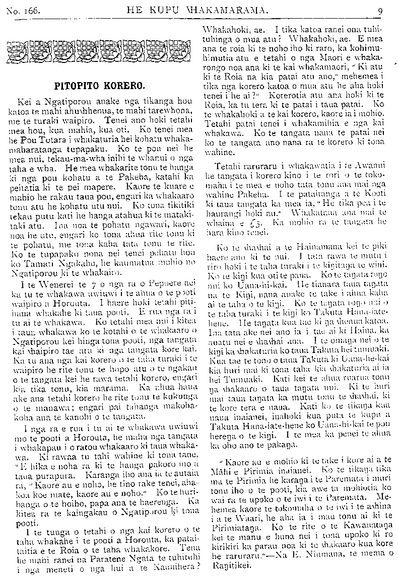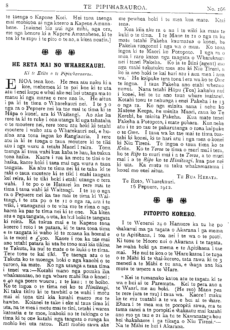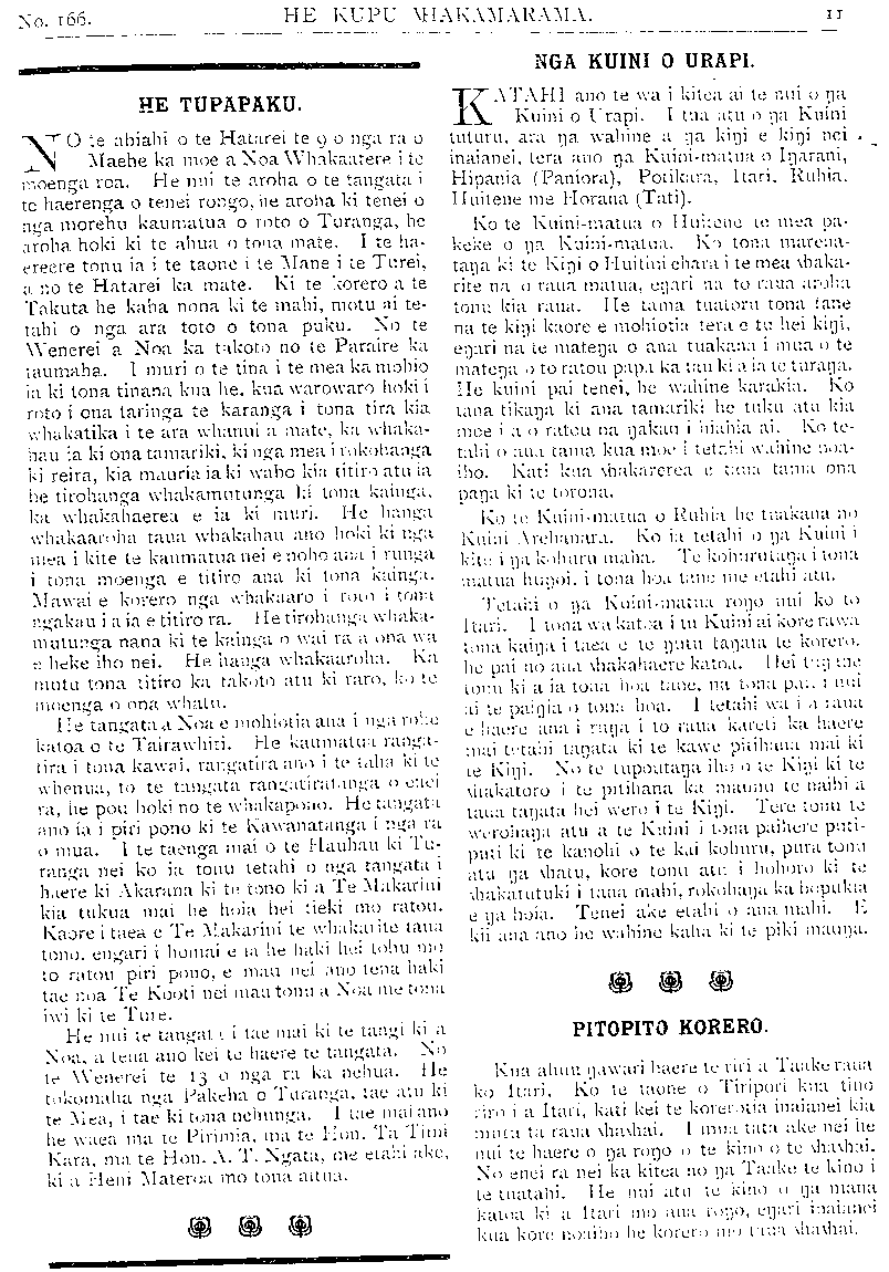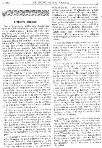 No. 166. HE KUPU WHAKAMARAMA. 9 PITOPITO KORERO. Kei a Ngatiporou anake nga tikanga hou katoa te mahi ahuwhenua, te mahi tarewhona, me te turaki waipiro. Tenei ano hoki tetahi mea hou, kua mahia, kua oti. Ko tenei mea he Pou Totara i whakaturia hei kohatu whaka- maharatanga tupapaku. Ko te pou nei he mea nui, tekau-ma-wha inihi te whanui o nga taha e wha. He mea whakarite tonu te hanga ki nga pou kohatu a te Pakeha, katahi ka peitatia ki te pei mapere. Kaore te kuare e mahio he rakau taua pou, engari ka whakaaro tonu atu he kohatu utu nui. Ko tona tikitiki tekau putu kati he hanga atahua ki te mataki- taki atu. Ina noa te pohatu ngawari, kaore noa he utu, engari ko tona ahua rite tonu ki te pohatu, me tona kaha tata tonu te rite. Ko te tupapaku nona nei tenei pohatu hou ko Tamati Ngakaho, he kaumatua mohio no Ngatiporou ki te whakairo. I te W'enerei te 7 o nga ra o Pepuere nei ka tu te whakawa uwiuwi i te ahua o te pooti waipiro a Horouta. I haere hoki tetahi piti- hana whakahe ki taua pooti. E rua nga ra i tu ai te whakawa. Ko tetahi mea nui i kitea i taua whakawa ko te kotahi o te whakaaro o Ngatiporou kei hinga tona pooti, nga tangata kai waipiro tae atu ki nga tangata kore kai. Ka tu ana nga kai korero o te taha turaki i te waipiro he rite tonu te hopo atu o te ngakau o te tangata kei he rawa tetahi korero,engari kia tika tonu, kia: marama. Ka ahua haua ake ana tetahi korero he rite tonu te kukunga o te manawa; engari pai tahanga makoha- koha ana te kanohi o te tangata. I nga ra e rua i tu ai te whakawa uwiuwi mo te pooti a Horouta, he maha nga tangata i whakapau i o ratou whakaaro ki taua whaka- wa. Ki rawaa tu tahi wahine ki tona tane, " E hika e noha ra ki te hanga pakoro mo a taua purapura. Karanga iho ana ia te autaia ra, " Kaore au e noho, he tino take tenei, aha- koa koe mate, kaore au e noho." Ko te huri- hanga o te hoiho, papa ana te haerenga. Ka kitea ra te kaingakau o Ngatiparoa ki tona pooti. I te tunga o tetahi o nga kai korero o te taha whakahe i te pooti a Horouta, ka patai- taitia e te Roia o te taha whakakore. Tena be mahi ranei na Paratene Ngata te tuhituhi i nga meneti o nga hui a te Kaunihera? Whakahoki, ae. I tika katoa ranei ona tuhi- tuhinga o mua atu? Whakahoki, ae. E mea ana te roia ki te noho iho ki raro, ka kohimu- himutia atu e tetahi o nga Maori e whaka- rongo noa ana ki te kai whakamaori, " Ki atu ki te Roia na kia patai atu ano," mehemea i tika nga korero katoa o mua atu he aha hoki tenei i he ai?" Korerotia atu ana hoki ki te Roia, ka tu tera ki te patai i taua patai. Ko te whakahoki a te kai korero, kaore ia i mohio. Tetahi patai tenei i whakamihia e nga kai whakawa. Ko te tangata nana te patai nei ko te tangata ano nana ra te korero ki tona wahine. Tetahi raruraru i whakawatia; i te Awanui he tangata i korero kino i te rori o te toko- maha i te mea e noho tata tonu ana mai nga wahine Pakeha. I te pataitanga a te Kooti ki taua tangata ka mea ia," He tika pea i te haurangi hoki au." Whakaataua ana mai te whaina e £5 Ka mohio ra te tangata he hara kino tenei. Ko te whawhai a te Hainamana kei te piki haere ano ki te nui. I tata rawa te mutu i riro hoki i te taha turaki i te kingitanga te wini Ko te kingi kua oti te pana. Ko te taua tangata nui ko Uana-hi-kai. he tianara tana tangata na te Kingi, nana anake te take i ahua kaha ai te taha o te kngi. Ko te tangata rongomai o te taha turaki i te kingi ko Takuta Hanaiate- hene. He tanata kua tae ki nga whenua katoa. Ina tata ake nei ano ia i tae ai ki Haina, ka auatu nei e whawhai ana. I te omanga nei o) te kini ka whakaturia ko taua Takuta hei tumuaki. Kua tae te tono o taua Takuta ki Uana-he-kai kia huri mai ki tona taha kia whakaturia ai ia hei Tumuaki. Kati kei te alma ruarua; tonu na whakaaro o taua tangata nui. Ki te huri mai taua tangata ka mutu tonu te whawhai, ki te kore tera e uaua. Kati ko te tikanga kua uaua inaianei, inahoki kua puta te kupu a Takuta Hana-iate-hene ko Uana -hi-kai te pou herenga o te kingi. I te mea ka penei te ahua ka oho ano te pakanga. " Kaore au e mohio ki te take i kure ai a te Mahi e Piriinia inaianei. Ko te tikanga tika ma te Pirimia he karanga i te Paremata i muri tonu iho o te pooti, kia awe ta mohiotia ko wai ra te upoko o te iwi i te Paremata. Me- hemea kaore re tokomaha o te iwi i te awhina i a te Waari, he aha ia i mau tonu ai ki te Pirimiatanga. Ko te rite o te Kawanatanga kei te manu e huna nei i tona upoko ki ro kirikiri ka parau noa ki te whakaaro kua kore he raruraru."—Na E. Niumana, te mema o Rangitikei.