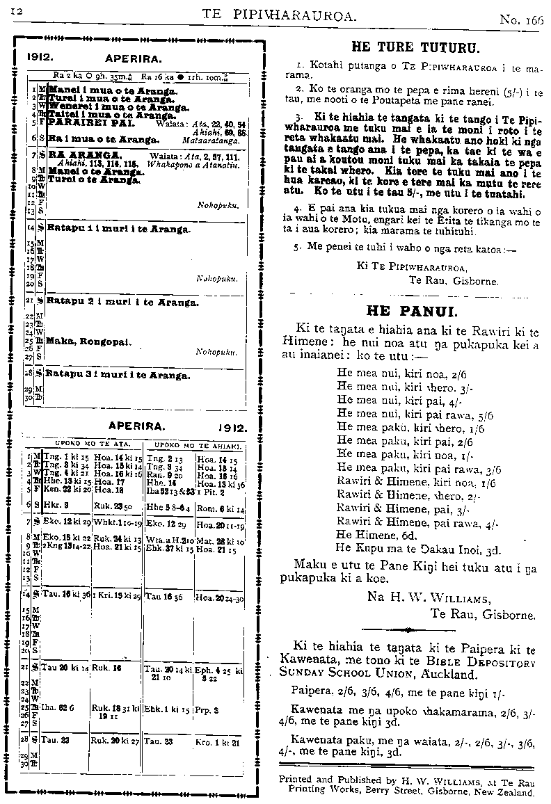 TE PIPIWHARAUROA. HE TURE TUTURU. 1. Kotahi putanga o TE PIPIWHARAUROA i te ma- rama. 2. Ko te oranga mo te pepa e rima hereni (5/-) i te tau, me nooti o te Poutapeta me pane ranei, auaka i te tiaki he pane kingi hepene nga pane e tino hiahiatia ana. 3. Ki te pau nga hereni a tetahi tangata i tuku mai ai ka tukua atu he kaute. Ki te tae atu te kaute kia hohoro te tuku mai i te moni, na te moni hoki i puta atu ai te pepa ehara i te mea tupu noa. 4. E pai ana kia tukua mai nga korero o ia wahi o ia wahi o te Motu, engari kei te Etita te tikanga mo te ta i aua korero : kia marama te tuhituhi. 5. Me penei te tuhi i waho o nga reta katoa: — Ki TE PIPIWHARAUROA, Te Rau, Gisborne. HE PANUI Ki te tangata e hiahia ana ki te Rawiri ki te Himene : he nui noa atu nga pukapuka kei a au inaianei : ko te utu : — He mea nui, kin noa ... 2/6 He mea nui, kiri wher ... 3/- He mea nui, kiri pai ... 4/— He mea nui kiri pai rawa ... 5/6 H e mea paku, kiri whero ... 1/6 H e mea paku, kiri pai . . . 2/6 He mea paku, kiri noa ... 1/- He mea paku, kiri pai rawa 3/6 Rawiri & Himene, kiri noa 1/6 Rawiri & Himene, whero ... 2/- Rawiri & Himene, pai ... 3/- Rawiri & Himene, pai rawa 4/- He Himene ... ... -/6 Maku e utu te Pane Kingi hei tuku atu i nga pukapuka ki a koe. Na H. W. WILLIAMS, Te Rau, Gisborne. Ki te hiahia te tangata ki te Paipera ki te, Kawenata, me tono ki te BIBLE DEPOSITORY SUNDAY SCHOOL UNION, Auckland. Paipera, 2/6, 3/6, 4/6, me te pane kingi //- Kawenata me nga upoko whakamarama 2/6 3/- 4/6, me te pane kingi 3d. Kawenata paku, me nga waiata 2/-, 2/6, 3/-, 3/6, 4/-, me te pane kingi, 3d. Printed and Published by H. W. WILLIAMS, at Te Rau Printing Works, Berry Street, Gisborne, New Zealand.