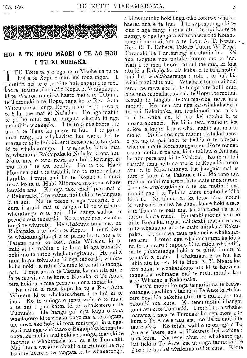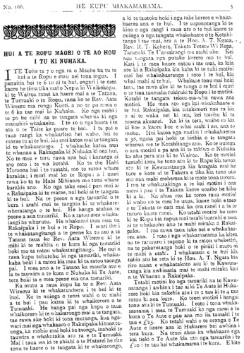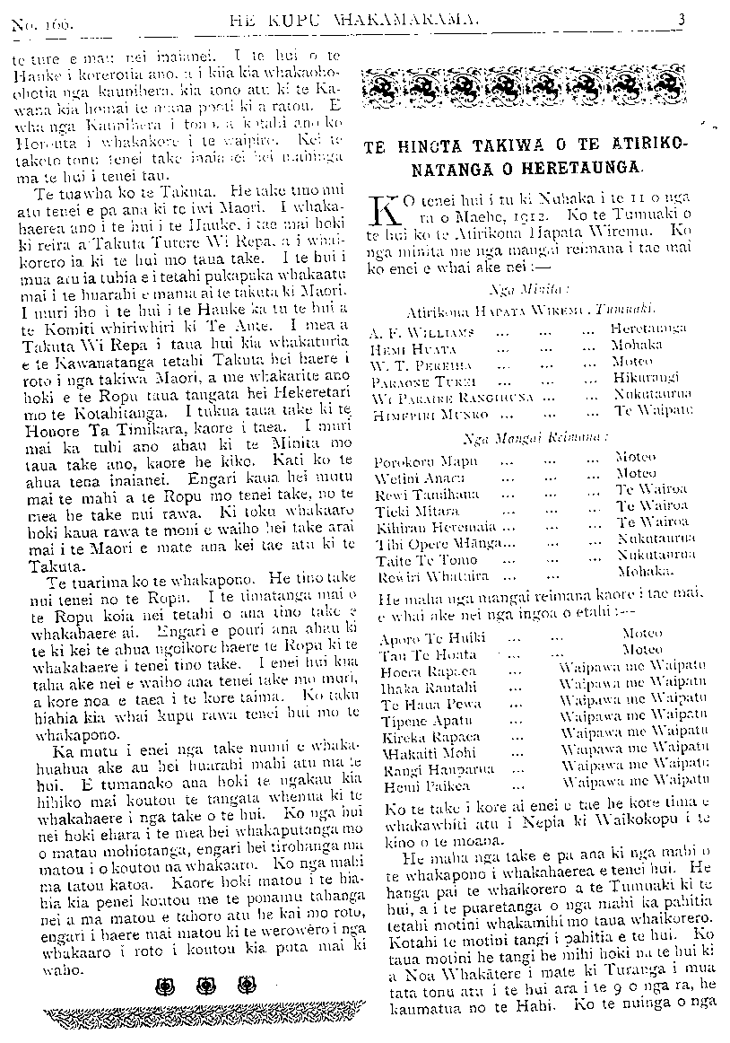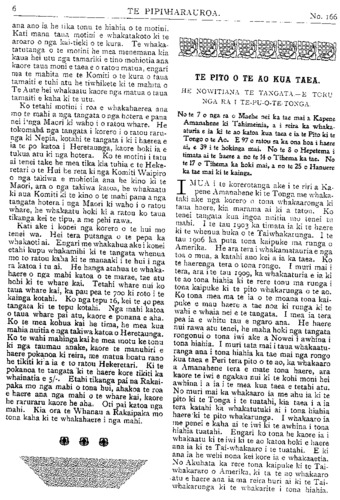 No. 166). HE KUPU WHAKAMARAMA. HUI A TE ROPU MAORI O TE AO HOU I TU KI NUHAKA. ITE Tohe te 7 o nga ra o Maehe ka tu te hui a te Ropu e mau nei tona ingoa. I panuitia hei te 6 tu ai te hui, engari i te mea kaore he tima tika mai o Nepia ki Waikokopu. ki te Wairoa ranei ka haere mai a te Tatana, te Tumuaki o te Ropu, raua ko te Rev. Aata Wiremu ma runga Kooti, a no te po rawa o te 6 ka tae mai ki Nuhaka. Ko nga mahi i te po he mihi na te tangata whenua ki nga manuhiri whakaeke. I te 10 o nga haora i te ata o te Taite ka puare te hui. I te pai o taua rangi ka whakaritea hei waho, hei te marae tu ai te hui, kia emi katoa mai te tangata ki te whakaarongo. I whakaeke katoa mai te whanau a Rakaipaka ki Nuhaka ki ona hui. No te mea e toru rawa ana hui i karanga ai mo roto i te wa kotahi. Ko ta the Hahi Momona hui i te tuatahi, mo to ratou whare karakia; i muri mai ko te Ropu; a i muri rawa ko ta te Hahi Mihinare mo tona whare karakia ano. Ko nga take enei i pau mai ai a Rakaipaka ki te marae, nui hoki ai te tangata ki te hui. Na te peene a nga tamariki o te kura i arahi mai te tangata ki te whakatu- wheratanga o te hui. He hanga atahua te peene a aua tamariki. Ko a ratou mea whaka- tangi he whurutu. He whakanui taua mea na Rakaipaka i te hui a te Ropu. I muri iho i te whakatangitangi a te peene ka tu atu a te Tatana raua ko Rev. Aata Wiremu ki te mihi ki te mahita o te kura ki nga tamariki hoki mo ta ratou whakatangitangi. He nui a raua kupu tohutohu ki nga tamariki, whaka- kaha hoki i a ratou kia mau ki ta ratou taonga pai. I mea ano a te Tatana ka mauria atu e ia te tauwira a te kura o Nuhaka ki Te Aute, tera hoki ia e mea peene ma ona tamariki. Ka mutu a raua kupu ka tu a Rev. Aata Wiremu ki te whakatuwhera i te hui ki te inoi. Ko te nuinga o tenei wahi o te mahi a te hui i pau katoa ki te whaikorero a te Tumuaki. He hanga pai nga kupu o taua whaikorero ki te whakarongo mai a te tangata, tae rawa ake hoki ki tona mutunga, kua nga- wari mai nga whakaaro o Rakaipaka ki tona ta- onga, ka mohio mai hoki he taonga, inahoki te tauwira e whakatakia atu ra e te Tumuaki. Mai i taua wa ki te ahiahi o te Hatarei he rite tonu te haere o te tangata ki te whakarongo, a ki te tautoko hoki i nga take korero e whaka- haerea ana e te hui. I te tuponotanga ki te kino o nga rangi i mua atu o te hui kaore te nuinga o nga tangata whakahaere o te Kotahi- tanga i tae mai, ara a te Hon. A. T. Ngata, - Rev. R. T. Kohere, Takuta Tutere Wi Repa, Taranaki Te Uamairangi me etahi ake. Kei aua tangata nga putake korero mo te hui. Kati i te mea kaore ratou i tae mai, ka kiia atu ki a Rakaipaka kia kaha ki te tuhi motini mai hei whakahaerenga i roto i te hui, kia whai mahi ai te hui. Whakaae tonu mai hoki tera, tae rawa ake ki te tunga o te hui i muri o te tina taumaha rukiruki te Ropu i te motini. Kotahi te tangata tekau-ma-wha rawa ana motini. He mea atu nga kai-w'nakahaere o te hui Rakaipaka, kia tatakimori noa ra kia u ai te waka nei ki uta, kei totohu ki te moana akuanei. Ka ki ia tera, waiho ra kia ki koe a kaore koe e whai mahi i au, ana to mohu. Hui katoa nga motini i whakahaerea e 38, ngata pai hoki te hiahia o te tangata whenua me te Kotahitanga ano. Ko te nuinga o aua motini e pa ana ki te takiwa o Nuhaka ka ahu pera atu ki te Wairoa. Ko te motini tuatahi tonu he tono atu ki te Ropu kia tonoa atu ki te Kawanatanga kia hangaia mai he ture e kore ai te Takuta e tika kia tono utu mo ana mahi mehemea ki te mate tona turoro. I roa te whakatakinga a te kai motini i ona moni i pau i te Takuta kaore noaiho he kiko ki a ia. Ka ahua roa ka toroa taua motini ki waho no te mea he uaua, kaore hoki e taea e te Takuta te oati mai ka ora ranei i a ia te turoro kaore ranei. Ko tetahi motini he tono ki te Ropu kia rapua mai tetahi huarahi e taea ai te whakaoho ano te mahi miraka a Rakai- paka. I roa rawa taua take nei e whakahae- rea ana. I roto i nga whakamarama ka kitea na te raruraru i tupono ki ta ratou wheketiri, na te pakarutanga hoki o te piriiti i mutu ai te mahi a etahi. I whakataua e te hui kia tuhia atu he reta ki te Hon. A. T. Ngata kia riro mana e whakatakoto atu ki te Kawana- tanga kia awhinatia mai te mahi miraka kau a te Whanau a Rakaipaka. Tetahi motini ko nga tamariki na te Kawa- natanga i awhina i tae ai ki Te Aute ki Huka- rere hoki kia nekehia atu i te 2 tau ki te 4 tau ratou ki aua kura. Ko tenei motini i hangai tonu atu ki te Tumuaki. I roto i tona whaka- marama i mea te Tumuaki ko nga moni a te kura o Te Aute e pau ana mo iia tamaiti i te tau e £25. Ko tetahi wahi o te oranga o Te Aute e haere ana ki Hukarere hei awhina i tera kura. Na tenei ahua ka whakaaro nga kai tieki o Te Aute kia utu nga tamariki i te £10 i te tau hei whakamama i te kura. E kite
