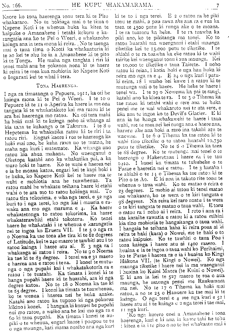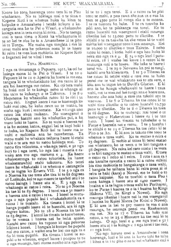 No. 166. HE KUPU WHAKAMARAMA. Kaore ko tona haerenga tonu tera ki te Pito whakararo. No te hokinga mai o te tima o Kapene Koti i te whenua huka ka kitea te kaipuke o Amanahene i tetahi kokoru e ka- rangatia ana ko te Pei o Weeri, e whakanoho kainga ana ia tera mona ki reira. No te taenga mai o taua tima o Kooti ka whakaaturia ki te ao kei te ahu ke ia a Amanahene ki te pito ki te Tonga. He maha nga tangata i riri ki tenei mahi ana he pokanoa nona ki te haere ki reira i te mea kua mohiotia ko Kapene Koti o Ingarani kei te whai i tera. TONA HAERENGA. I nga ra timatanga o Pepuere, 1911, ka oti he kainga mona ki te Pei o Weeri. I te 10 o Pepuere ki te 11 o Aperira ka haere ia me ona tangata ki te whakatakoto kai ma ratou ki te ara hei haerenga mo ratou. Ka oti tera mahi ka hoki mai ki te kainga noho ai whanga ai kia taha te kahanga o te Takurra. I te 8 o Hepetema ka whakatika ratou ki te riri i ta ratou riri. Engari kaore i roa te ka hoki mai ano, he kaha rawa no te matao, he maha nga kuri i matemate. Ka whanga ano ratou kia ahua mahana. No waenganui o Oketopa katahi ano ka whakatika pai, a ka maro hoki te haere. Ko te wahi e haerea nei e ia he moana katoa, engari kei te kapi hoki i te huka, ko Kapene Koti kei te haere ma te wahi e mohiotia ana he tuawhenua. Ta ratou mahi he whakatu teihana haere ki etahi wahi o te ara mo to ratou hokinga mai. To ratou tira tokorima, e wha nga terei, e 52 nga kuri to i nga terei, ko nga kai i mauria e ra- waka ana mo nga marama e 4 Ka haere whakatetonga to ratou tokorima, ka haere whakaterawhiti etahi tokotoru. Ko tenei haere he whakataki i te whenua e karangatia nei te ingoa ko Eruera VII. I te 5 o nga ra o Noema ka tae tona ake tira ki te 82 degrees of Latitude, kei te 240 maero te tawhiti atu i to ratou kainga i haere atu ai. E 3 nga ra i whakanga ai ratou i reira. No te 9 o Noema ka tae ki te 83 degree. I tenei wa e 31 maero e haerea ana e ratou i te ra. I konei te mutu- nga o nga pupahi kai i whakatakotoria ra e ratou i te tuatahi. Ka timata i konei ki te hanga pupahi haere ki te huarahi, ara ki nga degree katoa. No te 18 o Noema ka tae ki te 85 degree. I konei ka timata te tuawhenua, ko te wenua i haerea nei he huka anake. Katahi ano ratou ka tupono ki nga pokorua kikino i konei. I hangaia ki konei he pupahi nui mo ratou, a waiho ana he kai mo nga ra e 60 ki taua pupahi. Ka timata i konei te au- piki u te whenua, engari kaore i poupou te tu o nga maunga, kati mama noaiho ana nga kuri ki te to i nga terei. E 2 o ratou ra he piki tonu te mahi, a pau rawa ake aua ra e rua ka taea te 4500 putu ki runga ake o te moana. I te ra tuatoru ka heke. I te ra tuawha ka piki ano, ko te pikitanga roa tonei. Ko to ratou huarahi ma waenganui i etahi maunga tiketike kei te 15, 000 putu te tiketike. I te ahiahi o te ra tuawha ka eke ratou ki te wahi tairite kei waenganui tonu i aua maunga. Kei te 10, ooo te tiketike o taua Tairete. I noho ratou ki reiaa, i katia hoki e nga hau huka ki reira mo nga ra e 4 E 24 o nga kuri i patu- ki reira, 18 i waiho hei kawe i a ratou ki te mutunga mai o te haere. He neke te haere i tenei wa. I te 29 o Nowema ka pai te rangi, katahi ano ka kitea te ra. I te 3 o Tihema ka tae ratou ki tetahi wahi e rere ana te huka penei me te wai whakaroto nei te ata rere, e kiia ana te ingoa ko te Devil's Glacier. E ki ana ia he hanga whakawehi te haere i taua wahi, me te mea nei kei runga ana e haere ana, haruru ake ana hoki a raro ina takahi atu te waewae. 1 te 6 o Tihema ka tae ratou ki te wahi tino tiketike o to ratou huarahi 10, 750 putu te tiketike. No te 8 o Tihema ka taea te 88 degree. Ko te mutunga mai tenei o te haerenga o Hakeretana i haere ra i te tau 1910. I konei ka timata te tukuheke o te Parae e haeretia nei e ratou. I te 3 karaka i te ahiahi o te 14 ° Tihema ka tae ratou ki te Pito o te Ao. E ki ana ia takoto rite tonu te whenua o taua wahi. Ko te matao o reira e 23 degrees. E mohio ai tatou ki tenei matao me whakaaro, ko te wera o te kiri tangata e 98 degrees. Na reira kei raro noatu i te wera o te kiri tangata te matao o taua wahi. E toru o ratou ra i noho ai i reira. I roto i aua ra i ata karaihe rawatia e ratou ki a ratou mihini kia tino mohiotia te hangaitanga o taua wahi. I hangaia he teihana kaha ki reira poua ai ki reira te haki (kara) o Nowei, me te haki o to ratou kaipuke. Ko te tawhiti o taua Pou i tona kainga i haere atu ai 1400 maero. I huaina e ia te ingoa o taua wahi ko Porihaimi, ko te Parae i haerea ra e ia i huaina ko Kingi Hakona VII. (te Kingi o Nowei). Ko nga maunga tiketike i haere nei ia ma waenganui i huaina ko Kuini Maora (te Kuini o Nowei). E ki ana ia kei te 527 maero te roa o aua maunga, he maunga penei me Raukumara ma nei. No te 17 o Tihema ka hoki mai ratou, a no te 25 o Hanuere ka tae mai ki te kainga. O nga terei e 4 me nga kuri e 52 i haere atu ai i te kainga e 2 nga terei i tae mai, 11 nga kuri. [Ko nga korero enei a Amanahene i tona haerenga, kati e ki ana ia kaore tahi he tohu i kitea e ia i te pito o ao te hei whakaatu mai i