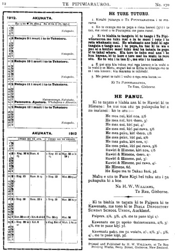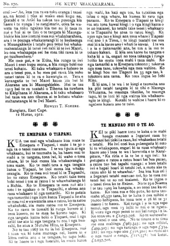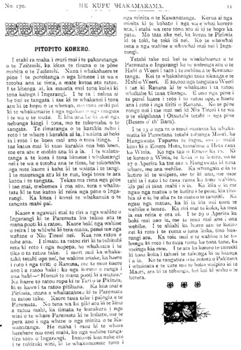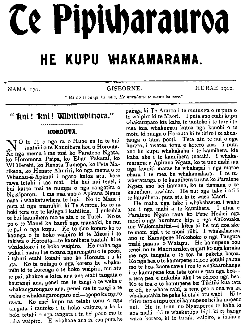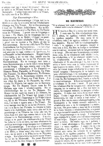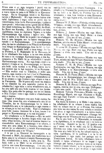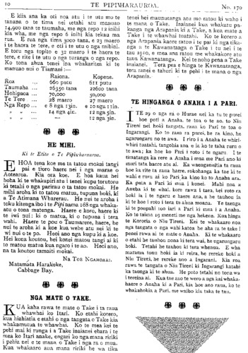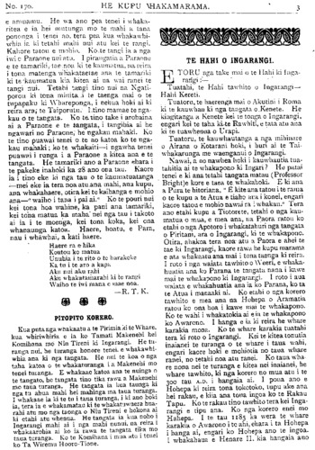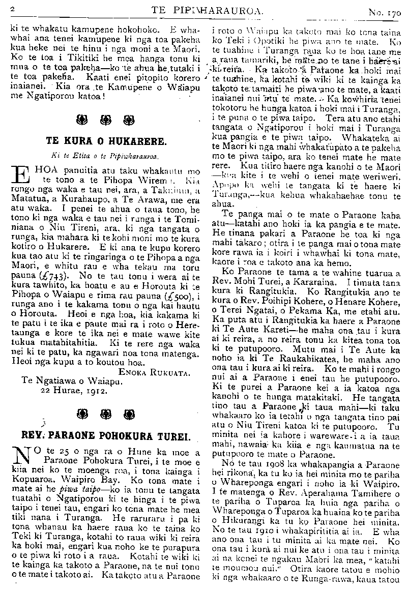 TE PIPIWHARAUROA. No.170 ki te whakatu kamupene hokohoko. E wha- whai ana tenei kamupene ki nga toa pakeha kua heke nei te hinu i nga moni a te Maori. Ko te toa i Tikitiki he mea hanga tonu ki mua o te toa pakeha—ko te ahua he tutaki i te toa pakeha. Kaati enei pitopito korero / inaianei. Kia ora te Kamupene o Waiapu me Ngatiporou katoa! TE KURA O HUKARERE. Ki te Etita o te Pipwharauroa EHOA panuitia atu taku whakautu mo te tono a te Pihopa Wiremu KIA rongo nga waka e tau nei, ara, a Takitimu, a Matatua, a Kurahaupo, a Te Arawa, me era atu waka. I penei te ahua o taua tono, he tono ki nga waka e tau nei i runga i te Tomi- niana o Niu Tireni, ara, ki nga tangata o runga, kia mahara ki te kohi moni mo te kura kotiro o Hukarere. E ki ana te kupu korero kua tao atu ki te ringaringa o te Pihopa a nga Maori, e whitu rau e wha tekau ma toru pauna (£743)' No te tau tonu i wera ai te kura tawhito, ka hoatu e au e Horouta ki te Pihopa o Waiapu e rima rau pauna (£500), i runga ano i te kakama tonu o nga kai hautu o Horouta. Heoi e nga hoa, kia kakama ki te patu i te ika e paute mai ra i roto o Here- taunga e kore te ika nei e mate wawe kite tukua matahitahitia. Ki te rere nga waka nei ki te patu, ka ngawari noa tona matenga. Heoi nga kupu a to koutou hoa. ENOKA RUKUATA. Te Ngatiawa o Waiapu. 22 Hurae, 1912. REV. PARAONE POHOKURA TUREI. NO te 25 o nga ra o Hune ka moe a Paraone Pohokura Turei, i te moe e kiia nei ko te moenga roa, i tona kainga i Kopuaroa, Waipiro Bay. Ko tona mate i mate ai he piwa taipo—ko ia tonu te tangata tuatahi o Ngatiporou ki te hinga i te piwa taipo i tenei tau, engari ko tona mate he mea tiki nana i Turanga. He raruraru i pa ki tona whanau ka haere raua ko te taina ko Teki ki Turanga, kotahi to raua wiki ki reira ka hoki mai, engari kua noho ke te purapura o te piwa ki roto i a raua. Kotahi te wiki ki te kainga ka takoto a Paraone, na te nui tonu o te mate i takoto ai. Ka takoto atu a Paraone i roto o Waiapu ka takoto mai ko tona taina ko Teki i Opotiki he piwa ano te mate. Ko te tuahine Turanga raua ko te hoa tane me a, raua tamariki, he mate no te tane i haere ai ki reira. Ka takoto a Paraone ka hoki mai te tuahine, ka kotahi te wiki ki te kainga ka takoto te. tamaiti he piwa ano te mate, a kaati inaianei nui atu te mate. Ka kowhiria tenei tokotoru he hunga katoa i hoki mai i Turanga, i te puna o te piwa taipo. Tera atu ano etahi tangata o Ngatiporou i hoki mai i Turanga kua pangia e te piwa taipo. Whakateka ai te Maori ki nga mahi whakatupato a te pakeha mo te piwa taipo, ara ko tenei mate he mate rere. Kua titiro haere nga kanohi o te Maori —kua kite i te wehi o tenei mate weriweri. Apopo ka weni te tangata ki te haere ki Turanga,—kua kehua whakahaehae tonu te ahua. Te panga mai o te mate o Paraone kaha atu—katahi ano hoki ia ka pangia e te mate. He tinana pakari a Paraone he toa ki nga mahi takaro; otira i te panga mai o tona mate kore rawa ia i koiri i whawhai ki tona mate, kaore i roa e takoto ana ka hemo. Ko Paraone te tama a te wahine tuarua a Rev. Mohi Turei, a Kararaina. I timata tana kura ki Rangitukia. Ko Rangitukia ano te kura o Rev. Poihipi Kohere, o Henare Kohere, o Terei Ngatai, o Pekama Ka, me etahi atu. Ka puta atu i Rangitukia ka haere a Paraone ki Te Aute Kareti—he maha ona tau i kura ai ki reira, a no reira tonu ka kitea tona toa ki te putupooro. Mutu mai i Te Aute ka noho ia ki Te Raukahikatea, he maha ano ona tau i kura ai ki reira. Ko te mahi i rongo nui ai a Paraone i enei tau he putupooro. Ki te purei a Paraone kei a ia katoa nga kanohi o te hunga matakitaki. He tangata tino tau a Paraone, ki taua mahi—ki taku whakaaro ko ia tetahi o nga tangata tino pai atu o Niu Tireni katoa ki te putupooro. Tu minita nei ia kahore i wareware-i a ia taua mahi, nawaia ka kiia e nga kaumatua na te putupooro te mate o Paraone. No te tau 1908 ka whakapangia a Paraone hei ri kona; ka tu ko ia hei minita mo te pari ha o Whareponga engari i noho ia ki Waipiro. I te matenga o Rev. Aperahama Tamihere o te pariha o Tuparoa ka huia nga pariha o Whareponga o Tuparoa ka huaina ko te pariha o Hikurangi ka tu ko Paraone hei minita. No te tau 1910 i whakapirititia ai ia. E wha ano ona tau i tu minita ai ka mate nei. Ko ona tau i kura ai nui ke atu i ona tau i minita ai na konei te ngakau Maori ka mea, " katahi te moumou nui." Otira kaore tatou e mohio ki nga whakaaro o te Runga-rawa, kaua tatou