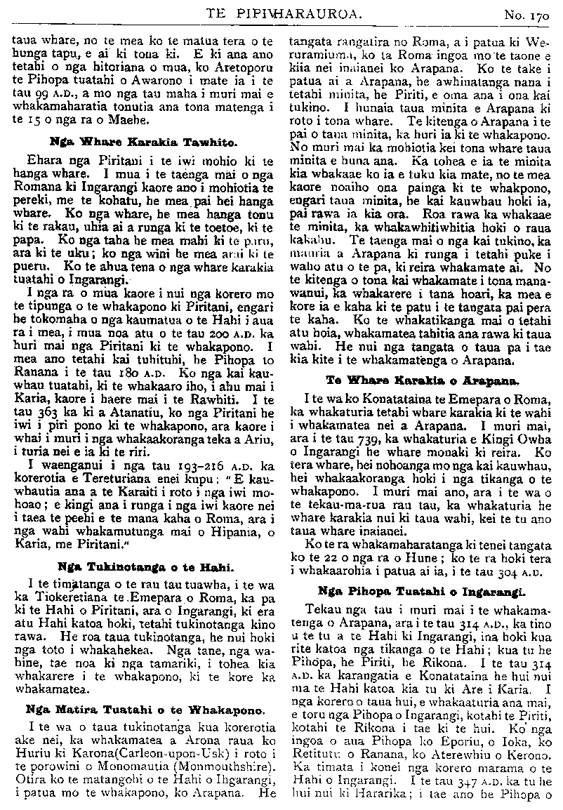 TE PIPIWHARAUROA. taua whare, no te mea ko te matua tera o te hunga tapu e ai ki tona ki. E ki ana ano tetahi o nga hitoriana o mua, ko Aretoporu te Pihopa tuatahi o Awarono i mate ia i te tau 99 A.D., a mo nga tau maha i muri mai e whakamaharatia tonutia ana tona matenga i te 15 o nga ra o Maehe. Nga Whare Karakia Tawhito. Ehara nga Piritani i te iwi mohio ki te hanga whare. I mua i te taenga mai o nga Romana ki Ingarangi kaore ano i mohiotia te pereki, me te kohatu, he mea. pai hei hanga whare. Ko nga whare, he mea hanga tonu ki te rakau, uhia ai a runga ki te toetoe, ki te papa. Ko nga taha he mea mahi ki te paru, ara ki te uku; ko nga wini he mea arai: u ki te pueru. Ko te ahua tena o nga whare karakia tuatahi o Ingarangi. I nga ra o mua kaore i nui nga korero mo te tipunga o te whakapono ki Piritani, engari he tokomaha o nga kaumatua o te Hahi i aua ra i mea, i mua noa atu o te tau 200 A.D. ka huri mai nga Piritani ki te whakapono. I mea ano tetahi kai tuhituhi, he Pihopa 10 Ranana i te tau 180 A.D. Ko nga kai kau- whau tuatahi, ki te whakaaro iho, i ahu mai i Karia, kaore i haere mai i te Rawhiti. I te tau 363 ka ki a Atanatiu, ko nga Piritani he iwi i piri pono ki te whakapono, ara kaore i whai i muri i nga whakaakoranga teka a Anu, i turia nei e ia ki te rirt. I waenganui i nga tau 193-216 A.D. ka korerotia e Tereturiana enei kupu: E kau- whautia ana a te Karaiti i roto i nga iwi mo- hoao; e kingi ana i runga i nga iwi kaore nei i taea te peehi e te mana kaha o Roma, ara i nga wahi whakamutunga mai o Hipania, o Karia, me Piritani." Nga Tukinotanga o te Hahi. I te timatanga o te rau tau tuawha, i te wa ka Tiokeretiana te Emepara o Roma, ka pa ki te Hahi o Piritani, ara o Ingarangi, ki era atu Hahi katoa hoki, tetahi tukinotanga kino rawa. He roa taua tukinotanga, he nui hoki nga toto i whakahekea. Nga tane, nga wa- hine, tae noa ki nga tamariki, i tohea kia whakarere i te whakapono, ki te kore ka whakamatea. Nga Matira Tuatahi o te Whakapono. I te wa o taua tukinotanga kua korerotia ake nei, ka whakamatea a Arona raua ko Huriu ki Karona (Carleon-upon-Usk) i roto i te porowini o Monomautia (Monmouthshire). Otira ko te matangohi o te Hahi o Ihgarangi, i patua mo te whakapono, ko Arapana. He tangata rangatira no Roma, a i patua ki We- ruramiuma, ko ta Roma ingoa mo te taone e kiia nei inaianei ko Arapana. Ko te take i patua ai a Arapana, he awhinatanga nana i tetahi minita, he Piriti, e oma ana i ona kai tukino. I hunaia taua minita e Arapana ki roto i tona whare. Te kitenga o Arapana i te pai o taua minita, ka huri ia ki te whakapono. No muri mai ka mohiotia kei tona whare taua minita e huna ana. Ka tohea e ia te minita kia whakaae ko ia e tuku kia mate, no te mea kaore noaiho ona painga ki te whakapono, engari taua minita, he kai kauwhau hoki ia, pai rawa ia kia ora. Roa rawa ka whakaae te minita, ka whakawhitiwhitia hoki o raua kakahu. Te taenga mai o nga kai tukino, ka mauria a Arapana ki runga i tetahi puke i waho atu o te pa, ki reira whakamate ai. No te kitenga o tona kai whakamate i tona mana- wanui, ka whakarere i tana hoari, ka mea e kore ia e kaha ki te patu i te tangata pai pera te kaha. Ko te whakatikanga mai o tetahi atu hoia, whakamatea tahitia ana rawa ki taua wahi. He nui nga tangata o taua pa i tae kia kite i te whakamatenga o Arapana. Te Whare Karakia o Arapana. I te wa ko Konotataina te Emepara o Roma, ka whakaturia tetahi whare karakia ki te wahi i whakamatea nei a Arapana. I muri mai, ara i te tau 739, ka whakaturia e Kingi Owha o Ingarangi he whare monaki ki reira. Ko tera whare, hei nohoanga mo nga kai kauwhau, hei whakaakoranga hoki i nga tikanga o te whakapono. I muri mai ano, ara i te wa o te tekau-ma-rua rau tau, ka whakaturia he whare karakia nui ki taua wahi, kei te tu ano taua whare inaianei. Ko te ra whakamaharatanga ki tenei tangata ko te 22 o nga ra o Hune; ko te ra hoki tera i whakaarohia i patua ai ia, i te tau 304 A.D. Nga Pihopa Tuatahi o Ingarangi. Tekau nga tau i muri mai i te whakama- tenga o Arapana, ara i te tau 314 A.D.,ka tino u te tu a te Hahi ki Ingarangi, ina hoki kua rite katoa nga tikanga o te Hahi; kua tu he Pihopa, he Piriti he Rikona. I te tau 314 A.D. ka karangatia e Konotataina he hui nui ma te Hahi katoa kia tu ki Are i Karia. I nga korero o taua hui, e whakaaturia ana mai, e toru nga Pihopa o Ingarangi, kotahi te Piriti, kotahi te Rikona i tae ki te hui. Ko nga ingoa o aua Pihopa ko Eporiu, o Ioka, ko Retitutu o Ranana, ko Aterewhiu o Kerono. Ka timata i konei nga korero marama o te Hahi o Ingarangi. I te tau 347A.D. ka tu he hui nui ki Hararika; i tae ano he Pihopa o