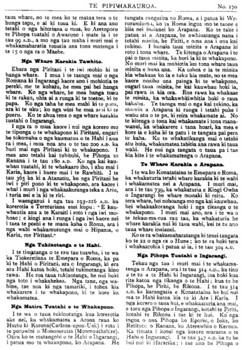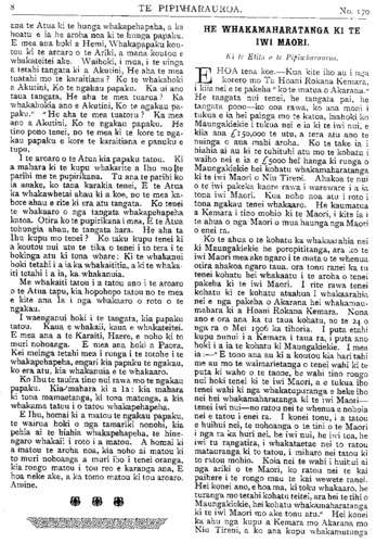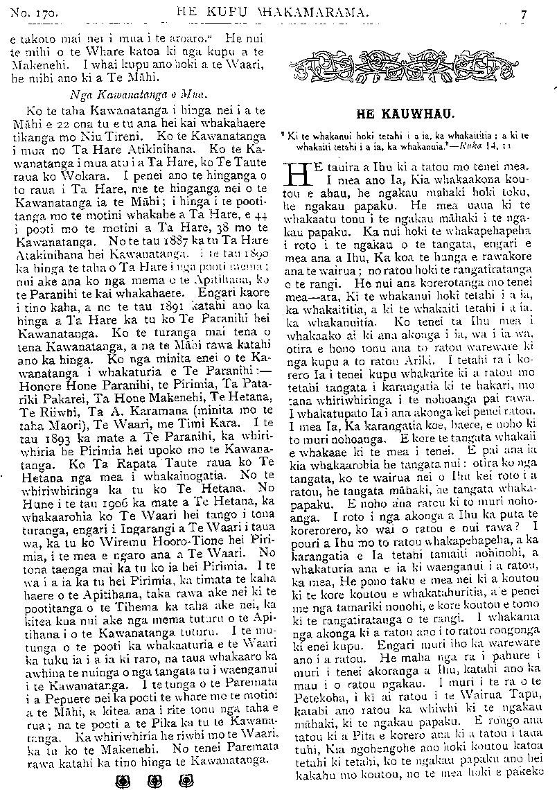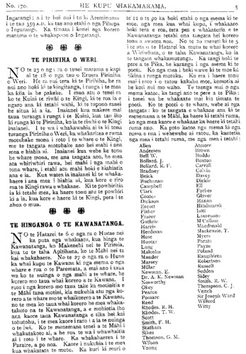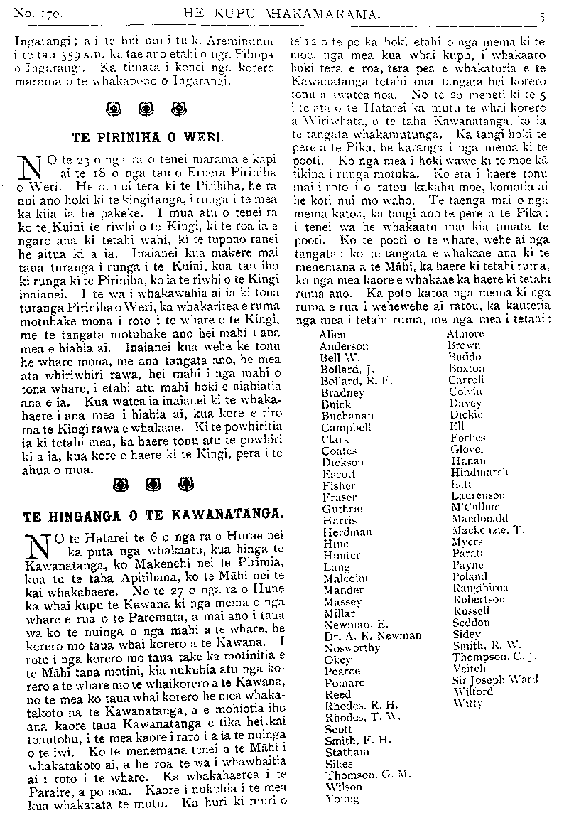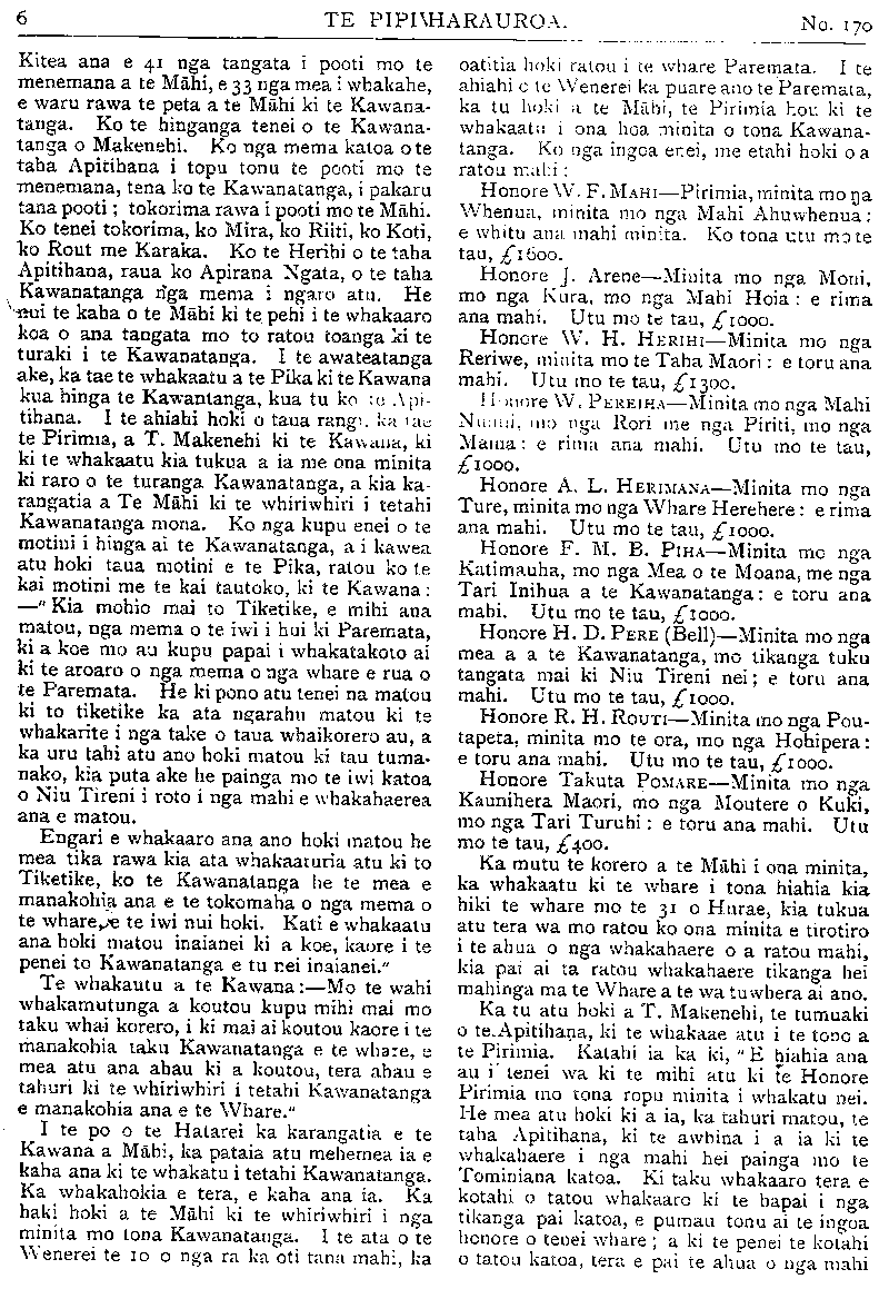 No. 170. HE KUPU WHAKAMARAMA. Ingarangi; a i te hui nui i te ki Areminumu i te tau 359 A.D., ka tae ano etahi o nga Pihopa o Ingarangi. Ka timata i konei nga korero marama o te whakapono o Ingarangi. TE PIRINIHA O WERI. NO te 23 o nga ra o tenei marama e kapi ai te 18 o nga tau o Eruera Piriniha o Weri. He ra nui tera ki te Pirihiha, he ra nui ano hoki ki te kingitanga, i runga te mea ka kiia ia he pakeke. I mua atu o tenei ra ko te. Kuini te riwhi o te Kingi, ki te roa ia e ngaro ana ki tetahi wahi, ki te tupono ranei he aitua ki a ia. Inaianei kua makere mai taua turanga i runga i te Kuini, kua tau iho ki runga ki te Piriniha, ko ia te riwhi o te Kingi inaianei. I te wa i whakawahia ai ia ki tona turanga Piriniha o Weri, ka whakaritea e ruma motuhake mona i roto i te whare o te Kingi, me te tangata motuhake ano hei mahi i ana mea e hiahia ai. Inaianei kua wehe ke tonu he whare mona, me ana tangata ano, he mea ata whiriwhiri rawa, hei mahi i nga mahi o tona whare, i etahi atu mahi hoki e hiahiatia ana e ia. Kua watea ia inaianei ki te whaka- haere i ana mea i hiahia ai, kua kore e riro ma te Kingi rawa e whakaae. Ki te powhiritia ia ki tetahi mea, ka haere tonu atu te powhiri ki a ia, kua kore e haere ki te Kingi, pera i te ahua o mua. TE HINGANGA O TE KAWANATANGA. NO te Hatarei, te 6 o nga ra o Hurae nei ka puta nga whakaatu, kua hinga te Kawanatanga, ko Makenehi nei te Pirimia, kua tu te taha Apitihana, ko te Mahi nei te kai whakahaere. No te 27 o nga ra o Hune ka whai kupu te Kawana ki nga mema o nga whare e rua o te Paremata, a mai ano i taua wa ko te nuinga o nga mahi a te whare, he korero mo taua whai korero a te Kawana. I roto i nga korero mo taua take ka motinitia e te Mahi tana motini, kia nukuhia atu nga ko- rero a te whare mo te whaikorero a te Kawana, no te mea ko taua whai korero he mea whaka- takoto na te Kawanatanga, a e mohiotia iho ana kaore taua Kawanatanga e tika hei. kai tohutohu, i te mea kaore i raro i a ia te nuinga o te iwi. Ko te menemana tenei a te Mahi i whakatakoto ai, a he roa te wa i whawhaitia ai i roto i te whare. Ka whakahaerea i te Paraire, a po noa. Kaore i nukuhia i te mea kua whakatata te mutu. Ka huri ki muri o te" 12 o te po ka hoki etahi o nga mema ki te moe, nga mea kua whai kupu, i whakaaro hoki tera e roa, tera pea e whakaturia e te Kawanatanga tetahi ona tangata hei korero tonu a awatea noa. No te 20 meneti ki te 5 i te at; o te Hatarei ka mutu te whai korero a Wiriwhata, u te taha Kawanatanga, ko ia tu tangata whakamutunga. Ka tangi hoki te pere a te Pika, he karanga i nga mema ki te pooti. Ko nga mea i hoki wawe ki te moe ka tikina i runga motuka. Ko era i haere tonu mai i roto i o ratou kakahu moe, komotia ai he koti nui mo waho. Te taenga mai o nga mema katoa, ka tangi ano te pere a te Pika: i tenei wa he whakaatu mai kia timata te pooti. Ko te pooti o te whare, wehe ai nga tangata: ko te tangata e whakaae ana ki te menemana a te Mahi, ka haere ki tetahi ruma, ko nga mea kaore e whakaae ka haere ki tetahi ruma ano. Ka poto katoa nga mema ki nga ruma e rua i wehewehe ai ratou, ka kautetia nga mea i tetahi ruma, me nga mea i tetahi: Alien Atmore Anderson Brown Bell W. Buddo Bollard, J. Buxton Bollard, R. F. Carroll Bradney Colvin Buick Davey Buchanan Dickie Cambell Ell Clark Forbes Coates Glover Dickson Hanan Escott Hindmarsh Fisher Isitt Eraser Laurenson Guthrie M'Culluin Harris Macdonald Herdman Mackenzie. T. Hine Myers Hunter Parata; Lang Payne Malcolm Poland Mander Rangihiroa Massey Robertson Millar Russell Newman, E. Seddon Dr. A. K. Newman Sidey Nosworthy Smith, R. W. Okey Thompson. C. . Pearce Veitch Pomare Sir Joseph Ward Reed Wilford Rhodes, R. H. Witty Rhodes, T. W. Scott Smith, F. H. Stathain Sikes Thomson, G. M. Wilson Young