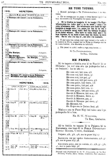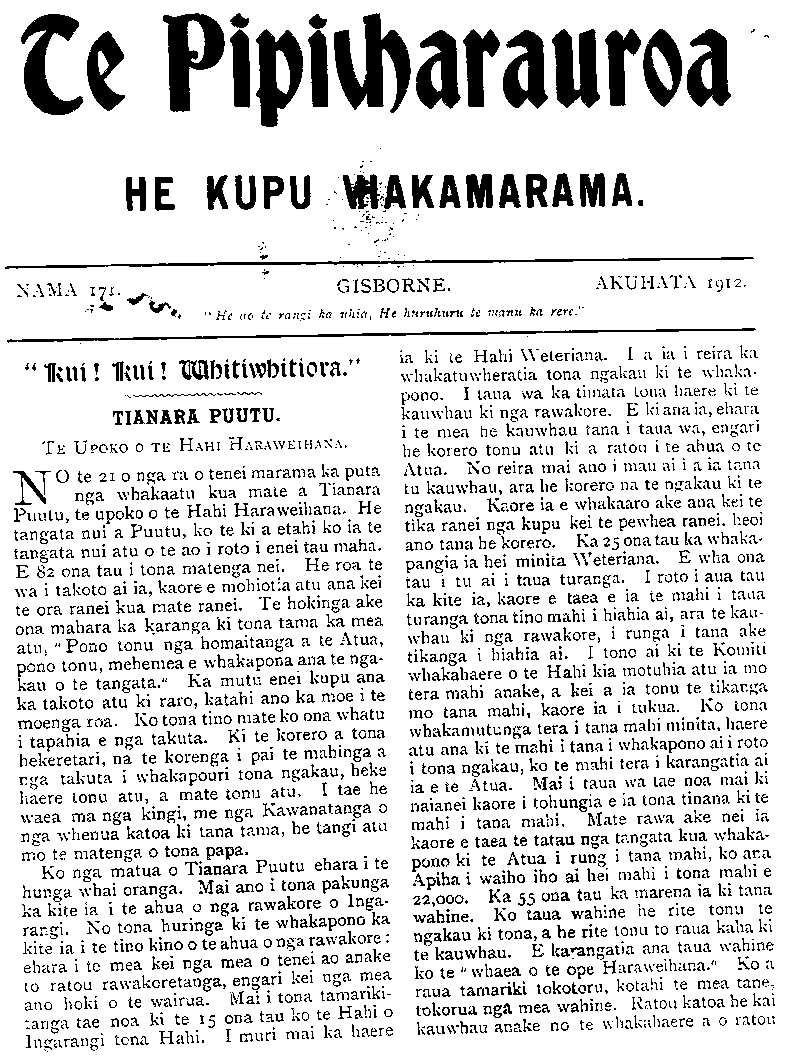 Te Pipiwharauroa HE KUPU WHAKAMARAMA. NAMA 171. GISBORNE. " He ao te rangi ka uhia He huruhuru te manu ka rere." AKUHATA 1912. Kui! Kui! Whitiwhitiora TIANARA PUUTU. TE UPOKO O TE HAHI HARAWEIHANA. NO te 21 o nga ra o tenei marama ka puta nga whakaatu kua mate a Tianara Puutu, te upoko o te Hahi Haraweihana. He tangata nui a Puutu, ko te ki a etahi ko ia te tangata nui atu o te ao i roto i enei tau maha. E 82 ona tau i tona matenga nei. He roa te wa i takoto ai ia, kaore e mohiotia atu ana kei te ora ranei kua mate ranei. Te hokinga ake ona mahara ka karanga ki tona tama ka mea atu, " Pono tonu nga homaitanga a te Atua, pono tonu, mehemea e whakapona ana te nga- kau o te tangata." Ka mutu enei kupu ana ka takoto atu ki raro, katahi ano ka moe i te moenga roa. Ko tona tino mate ko ona whatu i tapahia e nga takuta. Ki te korero a tona hekeretari, na te korenga i pai te mahinga a nga takuta i whakapouri tona ngakau, heke haere tonu atu, a mate tonu atu. I tae he waea ma nga kingi, me nga Kawanatanga o nga whenua katoa ki tana tama, he tangi atu mo te matenga o tona papa. Ko nga matua o Tianara Puutu ehara i te hunga whai oranga. Mai ano i tona pakunga ka kite ia i te ahua o nga rawakore o Inga- rangi. No tona huringa ki te whakapono ka kite ia i te tino kino o te ahua o nga rawakore: ehara i te mea kei nga mea o tenei ao anake to ratou rawakoretanga, engari kei nga mea ano hoki o te wairua. Mai i tona tamariki- tanga tae noa ki te 15 ona tau ko te Hahi o Ingarangi tona Hahi. I muri mai ka haere ia ki te Hahi Weteriana. I a ia i reira ka whakatuwheratia tona ngakau ki te whaka- pono. I taua wa ka timata tona haere ki te kauwhau ki nga rawakore. E ki ana ia, ehara i te mea he kauwhau tana i taua wa, engari he korero tonu atu ki a ratou i te ahua o te Atua. No reira mai ano i mau ai i a ia tana tu kauwhau, ara he korero na te ngakau ki te ngakau. Kaore ia e whakaaro ake ana kei te tika ranei nga kupu kei te pewhea ranei, heoi ano tana he korero. Ka 25 ona tau ka whaka- pangia ia hei minita Weteriana. E wha ona tau i tu ai i taua turanga. I roto i aua tau ka kite ia, kaore e taea e ia te mahi i tana turanga tona tino mahi i hiahia ai, ara te kau- whau ki nga rawakore, i runga i tana ake tikanga i hiahia ai. I tono ai ki te Komiti whakahaere o te Hahi kia motuhia atu ia mo tera mahi anake, a kei a ia tonu te tikanga mo tana mahi, kaore ia i tukua. Ko tona whakamutunga tera i tana mahi minita, haere atu ana ki te mahi i tana i whakapono ai i roto i tona ngakau, ko te mahi tera i karangatia ai ia e te Atua. Mai i taua wa tae noa mai ki naianei kaore i tohungia e ia tona tinana ki te mahi i tana mahi. Mate rawa ake nei ia kaore e taea te tatau nga tangata kua whaka- pono ki te Atua i rung i tana mahi, ko ana Apiha i waiho iho ai hei mahi i tona mahi e 22, 000. Ka 55 ona tau ka marena ia ki tana wahine. Ko taua wahine he rile tonu te ngakau ki tona, a he rite tonu to raua kaha ki te kauwhau. E karangatia ana taua wahine ko te " whaea o te ope Haraweihana." Ko a raua tamariki tokotoru, kotahi te mea tane, tokorua nga mea wahine. Ratou katoa he kai kauwhau anake no te whakahaere a o ratou