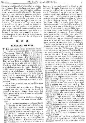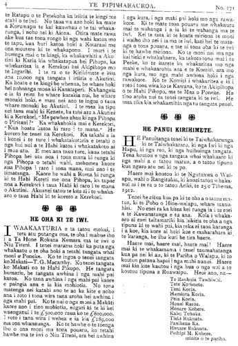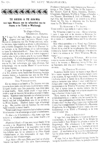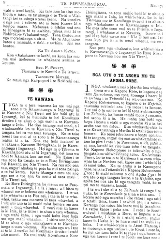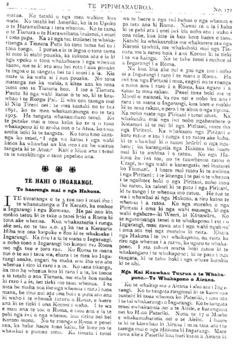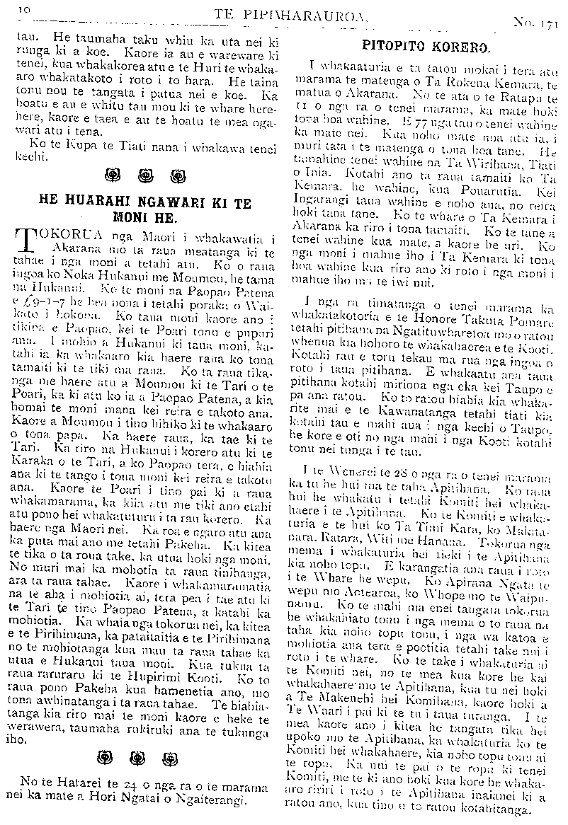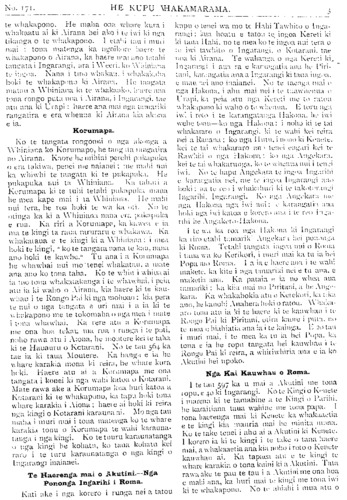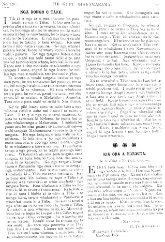No.171. HE KUPU WHAKAMARAMA. 11 NGA RONGO O TAKE. ITE 11 o nga ra o tera marama ka puta tetahi ru nui ki Take. E kiia ana ku te putake ake o taua ru i te moana, he awa whaiti nei, he hononga atu no te moana nui ki etahi moana iti kei te tuawhenua, ko te ingoa o taua wahi ko te Tatinere. E rua nga taone rarahi tonu kei te takutai o taua moana. Ko enei taone i tino mate i taua ru. Ko nga whare i pakaru katoa, kaore he whare kotahi i kore he wahi i pakaru. Ko nga tangata katoa o aua taone, o etahi atu hoki taone ririki e pa tata ana kei te noho kore whare, kore kai. kore wai. Kaore ano i tino mohiotia te tokomaha o nga tangata i mate, engari ki nga korero he nui. Ko nga mea e mohiotia ana inaianei e 3000. Te korero a tetahi tangata matau ki nga: mea pera, he wa tonu tenei hei putanga mo te ru, kei runga i te ahua o te tu a te marama raua ko te ra ki te whenua. Ki tona whakaaro tera e puta he ru nui, penei me tenei, nui; ake ranei, ki te takiwa o Mekehiko i Amerika Tera ano e puta etahi ru ririki ki Niu Tireni. Kei te piki haere tonu te noho kino a nga; whenua ririki e noho nei i raro i te mana o Take. I te 7 o nga ra o tenei marama. ka puta he raruraru ki Kokana, be taone kei te taha whakarunga o Makeronia. I makaia ne pomo ara he mea penei i te tainamaiti nei—e etahi tangata Mahometana ki roto ki te wahi tangata Ko nga tangata o tera wahi; he ka- raitiana. E kiia ana e 50 nga karaitiana i mate tona atu, e 200 nga mea i taotu, engari ki te whakaaro e kore e ora mai. I te pakaru- tanga o nga pomo, ka tu tetahi pakanga kino rawa. Whakatika atu ana tena tangata tena tangata ki tona hoa, ki tona hoa, me ana te ahua ki te kararehe. Ko nga tangata karai - tiana o Parakeria nga mea i nui te matenga i nga mahometana. Kei te nui rawa te riri o Parakeria ki a Take mo tenei raruraru. Kei te tonu mai kia hohoro te rapu o Take i te putake o te raruraru, te whiu ano hoki i nga tangata hara. Kua whakaatu a Take ka ho- horo ia ki te tirotiro i taua mea. Ki te kore e rite ki tana i hiahia ai te whui a Take i te hunga hara, tera e whakataka e Parakeria e whawhai mana ki a Take . Ko tatahi tenei o nga whenua ririki kei raro i te maua o Take Ko tetahi o aua whenua ririki, ko Monotini kore kei te hapai ke i te patu ki a Take. engari kaore ano i tino karangatia he whawhai ma te iwi katoa. Katahi tonu ka timata atu ta rua mahi. Ka toru ngu pourewa o te Take kua riro i a ratou. I haere atu tetahi ropu Take ki roto i taua whenua, a mate ana. Kei te whakamatauria kia houhia ta raua rongo engari ka nui te uaua. Kua karangatia ma nga mana o waho e whakariterite taua raru- raru. Ko nga tangata o Oropania he whenua ano kei raro i te mana o Take kei te noho kino. I tono ratou kia whakakorea atu te Kawanatanga o Take kia whakaturia he Ka- wanatanga hou. Ki te kore ka; ara he pakanga hou i a ratou. Kei te whakaaro a Take inai- anei ki te whakakore i tona kawanatanga. Kaore ano taua Kawanatanga i kore engari kei te noho riri tonu. Inaianei kua mate nga Oropania i te kai. Nga whakaatu mai e 50, 000 kei tu noho kai kore. Kaore e mohiotia te tukunga iho o tera ahua Ki le k;)'v r;il.r,l e whiwhi ki te kai. ter;i e tahu;'! ki n^-i ;n;i!n kino hei or;inga mo raton. Ko te whawhai ;i T;'iki.' i";l;ia ko Itari kri ie haere tonu, en;^ai"i k:ioi"e ,i;n' '111,' ron^'o ni;ii o tetahi parckura nui. I t^'i.;il;i riri iti uri i '^ S •o na;i ra ko nga Ar;ipi i in;iir i u,;;i It;in:n;i: e kii.i ana e 200 raw:l ;:^ i Ai";ipi i in;u.;.-. i lao','.i hoki. !\\<;i tr koi"eroli;i. in:',i;uu'i ki;i!inn- hi;'. k- ron,u'o. kati nga rciiL;;) w !iakaiiuiHin:,';i. nei, kua n.^;iw;u"i h;ieri; ra;i 'i,i';Ki ^ nui ki ir lio!iou i te ron-;'o. Eiii^.u'i lit.' wli;iw';iai r:i'ni ;ino ta ran;i i enei ra ta!;i ka t;il'i;i ;i';vi-' :":t,'i. Kot;ihi te tino ra i wli;iwii;ii ai. Hui k;r.o:i na;i [tari;ina i m;ite tokixviio. ngei IUL-;I I I lulu ri ;S ). Kaore i molnoli;i ;ilu o \\i^:\\ .\\i,ipi, t.'n,^;iri ki -na;i kiirei"o i nui. ko i\\ito'.i IM'|<] i !;i.!h;i i ta'ii;i wlia\\vliiii. ^ ^ ^ KIA ORA A HOROUTA. !\\i ii- Etittt 11 T: /';/;..'.';i(;'.(;.;-i'.;. EHOA tena koe. 1C liii;i. kua kile ciu i na;i korero o te hui " lloi-outa K.iiiin iic;-a i te l^p: nama 170. l\\a nui t;ikii wii;ik;i- ji;ii ki tenei taonga nui o Horout;i. kua wlum;iii nei liei l;iin;iiti tnatalii in:ri;i na;i Inia o i\\)to^o t.ana winiwini ki te turaki i te w;iipiro. Kia oi\\i taku wlMn;uin^a a I',i!;itc;ic N,-;';it;i, na- in;i;Ki o iloroula, ine na.i !ii'-";n i k-ito;i. l\\;iti e ho;i ina kua hiahia ;ui !<i iv t.'.maiti a H )fo'.!l;i e ki nei te loooo. Kati i i.e ine:i ku;i ki cn'.-i, k'i iie'Kel;i;i atu ;i:io te nui o ;ih,i liea. l\\i ie rilc ki tenei, tcK;iu He;i in;iki;. inc';n-'in-Ja k.i p;u lu KoiiiiLi o 1 !• ;ro,.i:a, i-;i i'- ko; e, e p;u ;i:h;i. Kia .;r;i. a lloi'onta. N•1 i,.) ;io.i, ; I. Ti. 1\\\\II \\1<A;1.\\. M;U;l.;lK It,;i ll.t!";l'.<rk^, Ceil)';'ake l-^iy.