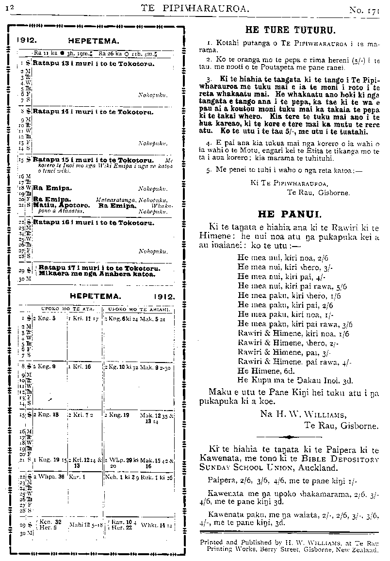 TE PIPIWHARAUROA. HE TURE TUTURU. 1. Kotahi putanga o TE PIPIWHARAUROA i te ma- rama. 2. Ko te oranga mo te pepa e rima hereni (5/-) i te tau, me nooti o te Poutapeta me pane ranei, auaka i te tiaki he pane kingi hepene nga pane e tino hiahiatia ana. 3. Ki te pau nga hereni a tetahi tangata i tuku mai ai ka tukua atu he kaute. Ki te tae atu te kaute kia hohoro te tuku mai i te moni, na te moni hoki i puta atu ai te pepa ehara i te mea tupu noa. 4. E pai ana kia tukua mai nga korero o ia wahi o ia wahi o te Motu, engari kei te Etita te tikanga mo te ta i aua korero : kia marama te tuhituhi. 5. Me penei te tuhi i waho o nga reta katoa: — Ki TE PIPIWHARAUROA, Te Rau, Gisborne. HE PANUI Ki te tangata e hiahia ana ki te Rawiri ki te Himene : he nui noa atu nga pukapuka kei a au inaianei : ko te utu : — He mea nui, kin noa ... 2/6 He mea nui, kiri wher ... 3/- He mea nui, kiri pai ... 4/— He mea nui kiri pai rawa ... 5/6 H e mea paku, kiri whero ... 1/6 H e mea paku, kiri pai . . . 2/6 He mea paku, kiri noa ... 1/- He mea paku, kiri pai rawa 3/6 Rawiri & Himene, kiri noa 1/6 Rawiri & Himene, whero ... 2/- Rawiri & Himene, pai ... 3/- Rawiri & Himene, pai rawa 4/- He Himene ... ... -/6 Maku e utu te Pane Kingi hei tuku atu i nga pukapuka ki a koe. Na H. W. WILLIAMS, Te Rau, Gisborne. Ki te hiahia te tangata ki te Paipera ki te, Kawenata, me tono ki te BIBLE DEPOSITORY SUNDAY SCHOOL UNION, Auckland. Paipera, 2/6, 3/6, 4/6, me te pane kingi //- Kawenata me nga upoko whakamarama 2/6 3/- 4/6, me te pane kingi 3d. Kawenata paku, me nga waiata 2/-, 2/6, 3/-, 3/6, 4/-, me te pane kingi, 3d. Printed and Published by H. W. WILLIAMS, at Te Rau Printing Works, Berry Street, Gisborne, New Zealand.