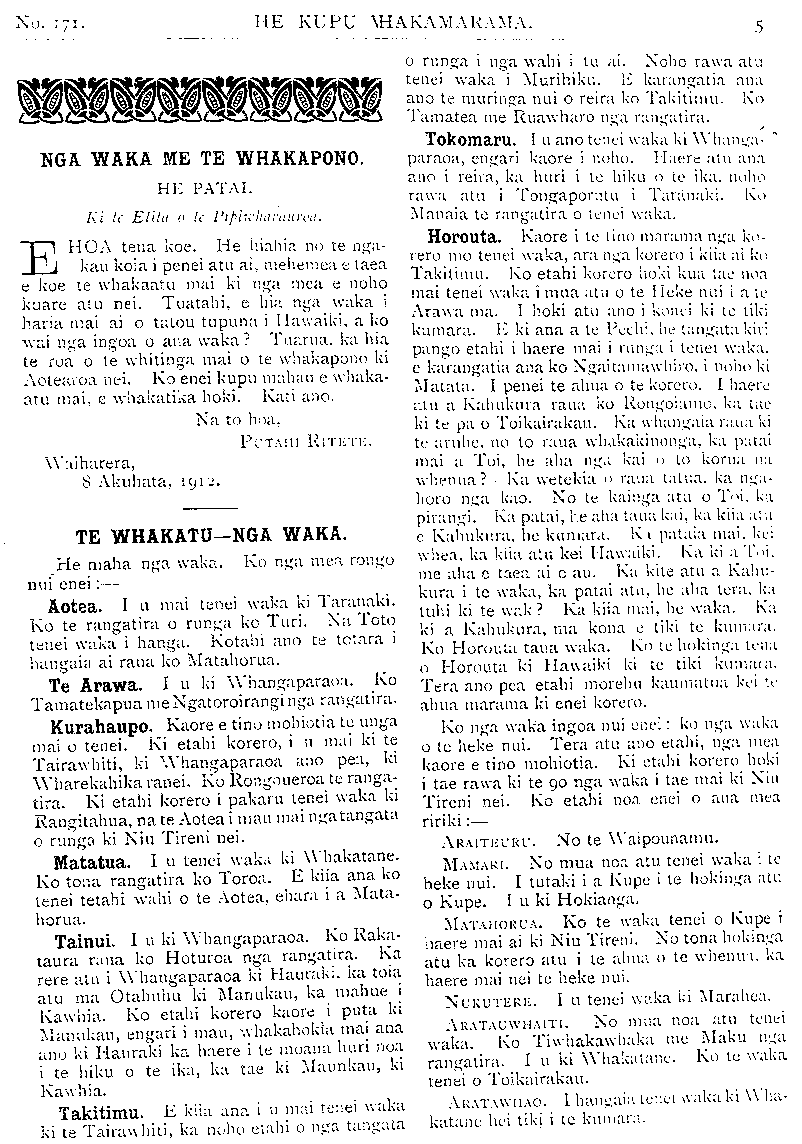 No. 171. HE KUPU WHAKAMARAMA. NGA WAKA ME TE WHAKAPONO. HE PATAI. Ki te Etita o te Pipiwharauroa EHOA tena koe. He hiahia no te nga- kau koia i penei atu ai, mehemea e taea e koe te whakaatu mai ki nga mea e noho kuare atu nei. Tuatahi, e hia nga waka i haria mai ai o tatou tupuna i Hawaiki, a ko wai nga ingoa o aua waka? Tuarua, ka hia te rua o te whitinga mai o te whakapono ki Aotearoa nei. Ko enei kupu mahau e whaka- atu mai, e whakatika hoki. Kati ano. Na to hoa, POTAHI RITERITE Waiharera, 8 Akuhata, 1912 TE WHAKATU—NGA WAKA. i He. maha nga waka. Ko nga mea rongo nui enei:— Aotea. I u mai tenei waka ki Taranaki. Ko te rangatira o runga ko Turi. Na Toto tenei waka i hanga. Kotahi ano te totara i hangaia ai raua ko Matahorua. Te Arawa. I u ki Whangaparaoa. Ko Tamatekapua me Ngatoroirangi nga rangatira. Kurahaupo. Kaore e tino mohiotia te unga mai o tenei. Ki etahi korero, i u mai ki te Tairawhiti, ki Whangaparaoa ano pea, ki Wharekahika ranei. Ko Rongoueroa te ranga- tira. Ki etahi korero i pakaru tenei waka ki Rangitahua, na te Aotea i mau mai nga tangata o runga ki Niu Tireni nei. Matatua. I u tenei waka ki Whakatane. Ko tona rangatira ko Toroa. E kiia ana ko tenei tetahi wahi o te Aotea, ehara i a Mata-horua. Tainui. I u ki Whangaparaoa. Ko Raka- taura raua ko Hoturoa nga rangatira. Ka rere atu i Whangaparaoa ki Hauraki, ka toia atu ma Otahnhu ki Manukau, ka mahue i Kawhia. Ko etahi korero kaore i puta ki Manukau, engari i mau, whakahokia mai ana ano ki Hauraki ka haere i te moana huri noa i te hiku o te ika, ka tae ki Maunkau, ki Kawhia. Takitimu. E kiia ana i u mai tenei waka ki te Tairawhiti, ka noho etahi o nga tangata o runga i nga wahi i tu ai. Noho rawa atu tenei waka i Murihiku. E karanga ana ano te muringa nui o reira ko Takitimu. Ko Tamatea me Ruawharo nga rangatira. Tokomaru. I u ano tenei waka ki Whanga- paraoa, engari kaore i noho. Haere atu ana ano i reira, ka huri i te hiku o te ika, noho rawa atu i Tongaporutu i Taranaki. Ko Manaia te rangatira o tenei waka. Horouta. Kaore i te tino marama nga ko- rero mo tenei waka, ara nga korero i kiia ai ko Takitimu. Ko etahi korero hoki kua tae noa mai tenei waka i mua atu o te Heke nui i a te Arawa ma. I hoki atu ano i konei ki te tiki kumara. E ki ana a te Peehi, he tangata kirl pango etahi i haere mai i runga i tenei waka. e karangatia ana ko Ngaitamawhiro, i noho ki Matata. I penei te ahua o te korero. I haere atu a Kahukura raua ko Rongoiamo ka tae ki te pa o Toikairakau. Ka whangaia raua ki te; aruhe no to raua whakakinonga ka patai mai a Toi, he aha nga kai o Io korua na whenua? Ka wetekia o raua tatua, ka nga horo nga kao. No te kainga; atu o Toi ka pirangi. Ka patai, he aha taua kai ka kiia; atu e Kahukura, he kumara. Ka pataia mai. kei whea, ka kiia atu kei Hawaiki. Ka ki a Toi. me aha e taea ai e au. Ka kite atu a Kahu- kura i te waka, ka patai atu, he aha tera, ka tuhi ki te waka? Ka kiia mai he waka. Ka ki a Kahukura, ma kona e tiki te kumara. Ko Horouta taua waka. Ko te hokinga tena o Horouta ki Hawaiki ki te tiki kumara Tera ano pea etahi morehu kaumatua kei te ahua marama ki enei korero. Ko nga waka ingoa nui enei: ko nga waka o te heke nui. Tera atu ano etahi, nga mea kaore e tino mohiotia. Ki etahi korero hoki i tae rawa ki te 90 nga waka i tae mai ki Niu Tireni nei. Ko etahi noa enei o aua mea ririki:— ARAITEURU. No te Waipounamu. MAMARI. No mua noa atu tenei waka i te heke nui. I tutaki i a Kupe i te hokinga atu o Kupe. I u ki Hokianga. MATAHORUA. Ko te vvaka tenei o Kupe i haere mai ai ki Niu Tireni. No tona hokinga atu ka korero atu i te ahua o te whenua ka haere mai nei te heke nui. NUKUTERE. I u tenei waka ki Marahea ARATAUWHAITI. No mua noa atu tenei waka. Ko Tiwhakawhaka me Maku nga rangatira. I u ki Whakatane. Ko te waka tenei o Toikairakau. ARATAWHAO. I hangaia tenei waka ki Wha- katane hei tiki i te kumara.