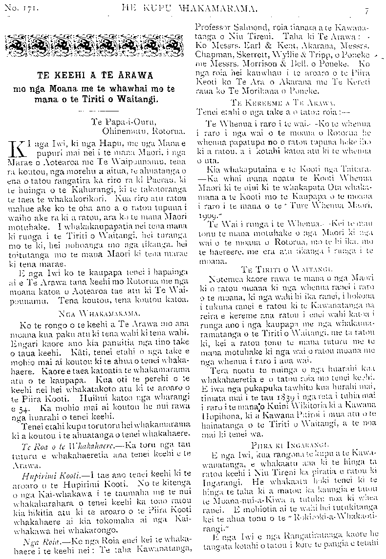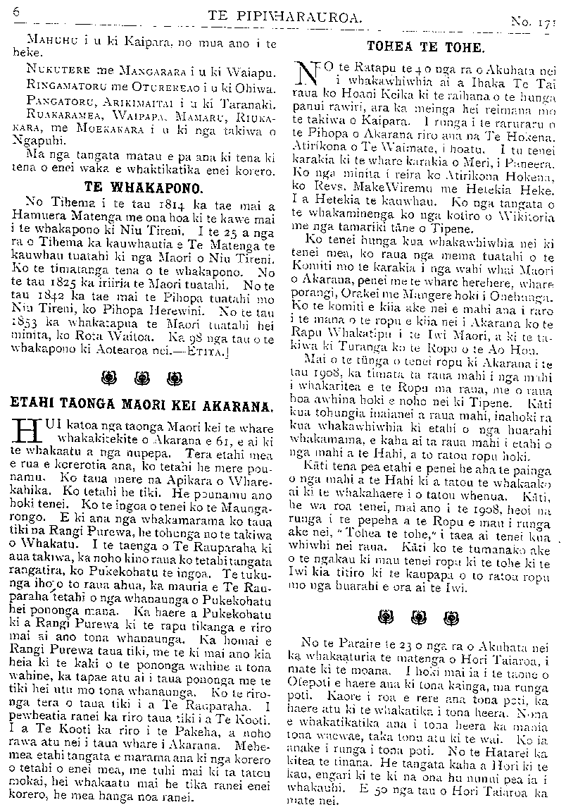 TE PIPIWHARAUROA. No.171 wahi o tenei keehi. Ka tahi ano ka tino mo- hiotia e tatou te tatutanga o te Tiriti o Wai- tangi kei te otinga o tenei keehi. Na konei ra e nga iwi i tukuna atu ai tenei Karere ki o koutou marae. Mehemea e hihiko mai ana te hinengaro ki te awhina, tukua mai ki te Rokiroki-a-Whakaotirangi. Tena koutou, me nga morehutanga a aitua. Ma te Atua tatou katoa e manaaki, e tiaki, e awhina. Kia ora koutou. Na TE ARAWA KATOA. Kua whakahaere te keehi, na kona kia ma- ma mai mehemea he whakaaro awhina to koutou. Rev. P. PENETI, Tiamana o te Komiti o Te Arawa. TAIPORUTU MITERE, Ko maua nga Kai-pupuri i te Rokiroki nei. TE KAWANA. INGA ra o tera marama ka tae mai nga tono a te Kawanatanga o Ingarangi ki te Kawana o Niu Tireni nei kia hoki atu ki Igarangi, kei te hiahiatia ia hei Komihana tirotiro i te ahua o nga mahi a te Kawana- tanga o Inia. Me tino turanga nui tenei, a i whakaarohia ko te Kawana o Niu Tireni te tangata hei tu mo taua turanga. Ko te take tenei i tae mai ai te tono a te Kawanatanga matua ki a ia. Kua tae hoki inaianei te whakaae a Kawana Ihiringitana ki te Kawa- natanga i Ingarangi. Hei nga ra o Tihema te Kawana hoki atu ai ki Ingarangi, hei taua wa hoki te Kawana hou tae mai. No Hune i te tau 1910 ka timata te tu o Rore Ihiringitana hei Kawana mo Niu Tireni. Ka rua ano ona tau, engari ahakoa te poto ka nui tona painga e te iwi katoa. Ko te tikanga e toru atu ano nga tau e toe ana ka mutu ai tana mahi i Niu Tireni nei. Ko Rore Ihiringitana he mema no te Pare- mata o Ingarangi, i a ia i reira; a i kitea te whanui me te hohonu ona whakaaro. I te wa o te whawhai a te Poa nei, i tae ia ki te wha- whai, tekau ona marama ki taua whawhai, a i whiwhi ano ia ki tetahi tohu honore mo ana mahi i taua whawhai. I muri mai ka haere ia ki Inia, ki te titiro i te ahua o tera whenua, i nga wahi kaha, i nga wahi kaha kore hoki mo nga mahi whawhai. I titiro ano hoki ia ki te ahua o nga whakahaere a te Kawana- tanga o taua whenua. He maha nga wa i tae ai ia ki Amerika hei Komihana tirotiro i etahi take nunui. Na enei mahi Komihana a Kore Ihiringitana, na tona mohio hoki ki te alma o nga mahi o Inia, ka whiriwhiria, ko ia hei Tiamana mo te Komihana uwiuwi i te ahua o nga whakahaere a te Kawanatanga o Inia. He mea tohe tonu mai na te Pirimia o Inga- rangi, i whakaae ai te Kawana. Kaore ia i pai ki te hoki wawe atu i Niu Tireni nei, i te mea kua pai ki a ia tenei whenua me ona tangata. Kua puta nga whakaatu, kua whiriwhiria e te Kawanatanga o Ingarangi ko Kore Riwa- puru te Kawana hou mo Niu Tireni. NGA UTU O TE AROHA ME TE AROHA-KORE. INGA whakaatu mai o Merika kua whaka- korea atu a Kapene Rore, te kapene o te tima K.arewhonia mo tona korenga i haere ki te awhina i te Taitaniki i te wa o te aitua. Ko Kapene Rohotorono, te kapene o te Kapeitia. taumaha rukiruki ana i te moni i te honore. I te nui o te mihi o te iwi ki tona awhinatanga i te Taitaniki ka hoatu tetahi moni £1oo, ooo. hei aroha ki a ia. He maha ano hoki nga kapu i hoatu e etahi o nga morehu ki a ia hei aroha ano ma ratou. Kua whakawhiwhia ia e te Kawanatanga o Merika ki tetahi tino tohu honore. Ko tenei tohu kaore e hoatu noa ana ki te tangata, engari me matua whakatakoto ra ano he pire i roto i te Paremata, a kia pahitia ra ano, katahi ka riro taua tohu i te tangata. Ko Kapene Rohotorono te tokowhitu o nga tangata kua whiwhi ki tenei tohu. Ko Atimara Tiuwi, ko te toa o te Marikena i ta raua wha- whai ko te Paniora nei, kaore ano i whiwhi ki ki tenei tohu. Ko te aroha a te Kamupene nana nei a te Taitaniki ki a Kapene Rohotorono £1oo; ki etahi tokorua o ona Apiha £50: ki era atu o nga tangata katoa o te Kapeitia, nga apiha tae noa atu ki nga tangata mahi, ko te pei mo te marama kotahi. I te wa i eke ai a te Taitaniki ki runga i te huka, ko te Karewhonia te tima e tata ana. I korero ano nga morehu i kite ratou i nga rahi o tetahi tima, kaore i tawhiti atu i a ratou. Karanga noa ratou kia haere mai ki te awhina i a ratou kaore i peka atu. I roto i te Kooti uwiuwi i whakaae a Rore, te kapene o te Karewhonia, i kite ia i etahi rakete, engari kaore ia i kaha ki te haere mai i te wehi i te huka. I te whai-korero a te Atoni-Tianara, i te mutunga o nga uwiuwi a te Kooti, i mea ia, he nui atu tona kaha ki te rapu i nga korero a nga kai korero i roto i te Kooti me kore noa e