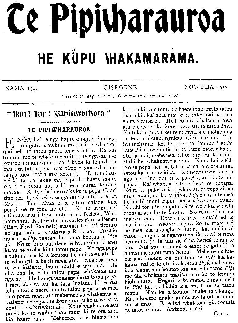 Te Pipiwharauroa HE KOPU WHAKAMARAMA. NAMA 174 GISBORNE. "He ao te rangi ka uhia, He huruhuru manu ka rere." NOWEMA 1912 . "Kui! Kui! Whitiwhitiora." TE PIPIWHARAUROA. ENGA Iwi, e nga hapu, e nga huihuinga tangata a awhina mai nei, e whangai mai nei i ta tatou manu tena koutou. Ka nui te mihi me te whakamoemiti o te ngakau mo koutou i manawanui mai i kaha ki te awhina mai i ta tatou pepa mai rano o tona whanau- tanga taea noatia mai tenei ra. Ka tata inai- nei ki te rua tekau tau e paoho haere ana te reo o ta tatou manu ki tena marae, ki tena marae. Ki te whakaaro ake ko te pepa Maori tino roa, tenei kei waenganui i a tatou i te iwi Maori. Tona ahua ki a tatou inaianei kua penei me te mea he oha. Ko te manu nei i timata mai i tera motu ara i Nelson, Wai pounamu. Ko te etita tuatahi ko Perere Peneti (Rev. Fred. Bennett) inaianei hei kai tirotiro no nga mahi o te takiwa o Rotorua. Tirohia iana nga Pipi tuatahi hei kona koutou te kite ai. Ko te tino putake e te iwi i tuhia ai enei kupu he aroha ki ta tatou pepa. Ko nga pepa e tukuna atu ki a koutou he nui rawa atu ko te whangai ia he iti rawa atu. Kua roa rawa te wa inaianei, kaore etahi e utu ana. He aha nga he o ta tatou pepa, whakama mai nga he, He hanga whakaaroha ta tatou pepa. I mea ake ra au ka tata inaianei ki te rua tekau tau e haere ana ta tatou pepa a he mea tino pouri rawa atu mehemea ka whakamutua inaianei i runga i te kore oranga ko te whea ta koutou e whiriwhiri ai. Ko te whakakore atu ranei, ko te waiho tonu ranei ki te ora ana, kia haere ana. Mehemea ra e hiahia ana koutou kia ora tonu kia haere tonu ana ta tatou manu kia kakama mai ki te tuku mai he mea e ora tonu ai ia. He tino mea whakaaro rawa atu mehemea ka kore rawa atu ta tatou Pipi. Ko toku ngakau kei te mamae, a e mohio ana au tera atu etahi ngakau kei te mamae. E te iwi mehemea kei te kite mai koutou i etahi huarahi e awhinatia ai ta tatou pepa whaka- aturia mai, mehemea kei te kite mai koutou i etahi he whakaaturia mai. Kaua hei wehi. Ko te pepa nei na tatou katoa, a e ora ai ma tatou katoa e awhina. Ko tetahi tonu tenei o nga mea tino nui ki te pakeha, ara ko te nu- pepa. Ka whaotia e te pakeha te nupepa. Ko ta te pakeha ia i whakatu nupepa ai hei mahi moni, na ko ta tatou Pipi ehara i te mea hei mahi moni engari hei whakaako ta tatau. Kotahi tonu te tangata kei te whai kia whiwhi moni ia ara ko te kai-ta. No reira e hoa ma mahara mai. Ehara i te mea te mahi nei he mahi moni. Kaore; engari ko te mahi nei he mea kia akongia ai tatou, kia mohio ai tatou i runga i te ngawari noaiho ara i te rima hereni (5/-) i te tau he rima hereni tonu i te tau. Nui atu te puhoi o etahi tangata ki te homai i a ratou rima hereni. Mehemea e hia- hia ana koutou kia ora tonu te Pipi kia ka- kama mai ki te utu i a koutou Pipi, mehemea ia e hiahia ana koutou kia mate ta tatou Pipi me ata whakaatu marika mai ko to koutou hiahia tera. Engari i? ko matou e mahi nei i te Pipi kei te hiahia kia ora tonu ta tatou manu. Kati kei a koutou anake te tikanga. Kei a koutou anake te ora mo ta tatou manu me te mate. E te iwi whakaorangia tonutia ta tatou manu. Awhinatia mai. ETITA.