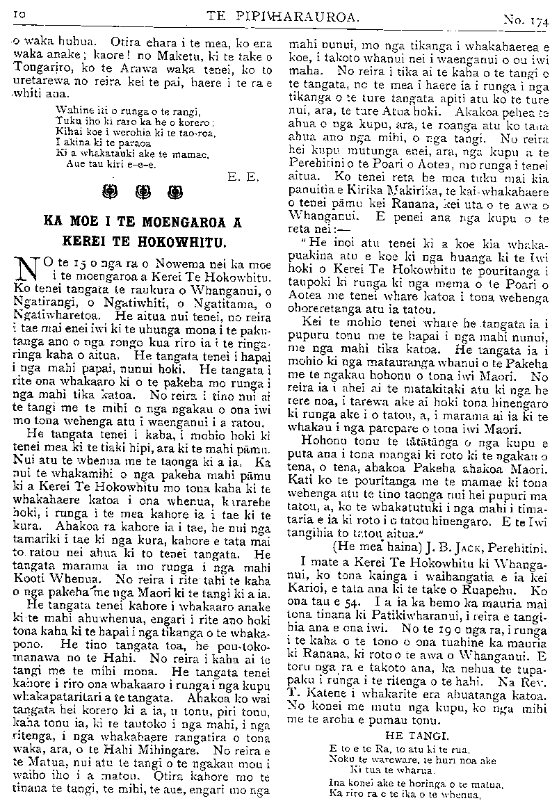 10 TE PIPIWHARAUROA. No. 174 o waka huhua. Otira ehara i te mea, ko ena waka anake; kaore! no Maketu, ki te take o Tongariro, ko te Arawa waka tenei, ko to uretarewa no reira kei te pai, haere i te ra e whiti ana. Wahine iti o runga o te rangi, Tuku iho ki raro ka he o korero; Kihai koe i werohia ki te tao-roa, I akina ki te paraoa Ki a whakatauki ake te mamae, Aue tau kiri e-e-e. E. E. KA MOE I TE MOENGAROA A KEREI TE HOKOWHITU. NO te 15 o nga ra o Nowema nei ka moe i te moengaroa a Kerei Te Hokowhitu. Ko tenei tangata te raukura o Whanganui, o Ngatirangi, o Ngatiwhiti, o Ngatitama, o Ngatiwharetoa. He aitua nui tenei, no reira i tae mai enei iwi ki te uhunga mona i te paku- tanga ano o nga rongo kua riro ia i te ringa- ringa kaha o aitua. He tangata tenei i hapai i nga mahi papai, nunui hoki. He tangata i rite ona whakaaro ki o te pakeha mo runga i nga mahi tika katoa. No reira i tino nui ai te tangi me te mihi o nga ngakau o ona iwi mo tona wehenga atu i waenganui i a ratou. He tangata tenei i kaha, i mohio hoki ki tenei mea ki te tiaki hipi, ara ki te mahi pamu. Nui atu te whenua me te taonga ki a ia. Ka nui te whakamihi o nga pakeha mahi pamu ki a Kerei Te Hokowhitu mo tona kaha ki te whakahaere katoa i ona whenua, kurarehe hoki, i runga i te mea kahore ia i tae ki te kura. Ahakoa ra kahore ia i tae, he nui nga tamariki i tae ki nga kura, kahore e tata mai to. ratou nei ahua ki to tenei tangata. He tangata marama ia mo runga i nga mahi Kooti Whenua. No reira i rite tahi te kaha o nga pakeha me nga Maori ki te tangi ki a ia. He tangata tenei kahore i whakaaro anake ki te mahi ahuwhenua, engari i rite ano hoki tona kaha ki te hapai i nga tikanga o te whaka- pono. He tino tangata toa, he poutoko- manawa no te Hahi. No reira i kaha ai te tangi me te mihi mona. He tangata tenei kahore i riro ona whakaaro i runga i nga kupu whakapataritari a te tangata. Ahakoa ko wai tangata hei korero ki a ia, u tonu, piri tonu, kaha tonu ia, ki te tautoko i nga mahi, i nga ritenga, i nga whakahaere rangatira o tona waka, ara, o te Hahi Mihingare. No reira e te Matua, nui atu te tangi o te ngakau mou i waiho iho i a matou. Otira kahore mo te tinana te tangi, te mihi, te aue, engari mo nga mahi nunui, mo nga tikanga i whakahaerea e koe, i takoto whanui nei i waenganui o ou iwi maha. No reira i tika ai te kaha o te tangi o te tangata, no te mea i haere ia i runga i nga tikanga o te ture tangata apiti atu ko te ture nui, ara, te ture Atua hoki. Akakoa pehea te ahua o nga kupu, ara, te roanga atu ko taua ahua ano nga mihi, o nga tangi. No reira hei kupu mutunga enei, ara, nga kupu a te Perehitini o te Poari o Aotea, mo runga i tenei aitua. Ko tenei reta he mea tuku mai kia panuitia e Kirika Makirika, te kai-whakahaere o tenei pamu kei Ranana, kei uta o te awa o Whanganui. E penei ana nga kupu o te reta nei:— " He inoi atu tenei ki a koe kia whaka- puakina atu e koe ki nga huanga ki te Iwi hoki o Kerei Te Hokowhitu te pouritanga i taupoki ki runga ki nga mema o te Poari o Aotea me tenei whare katoa i tona wehenga ohoreretanga atu ia tatou. Kei te mohio tenei whare he tangata ia i pupuru tonu me te hapai i nga mahi nunui, me nga mahi tika katoa. He tangata ia i mohio ki nga matauranga whanui o te Pakeha me te ngakau hohonu o tona iwi Maori. No reira ia i ahei ai te matakitaki atu ki nga he rere noa, i tarewa ake ai hoki tona hinengaro ki runga ake i o tatou, a, i marama ai ia ki te whakau i nga parepare o tona iwi Maori. Hohonu tonu te tatatanga o nga kupu e puta ana i tona mangai ki roto ki te ngakau o tena, o tena, ahakoa Pakeha ahakoa Maori. Kati ko te pouritanga me te mamae ki tona wehenga atu te tino taonga nui hei pupuri ma tatou, a, ko te whakatutuki i nga mahi i tima- taria e ia ki roto i o tatou hinengaro. E te Iwi tangihia to tatou aitua." (He mea haina) J. B. JACK, Perehitini. I mate a Kerei Te Hokowhitu ki Whanga- nui, ko tona kainga i waihangatia e ia kei Karioi e tata ana ki te take o Ruapehu. Ko ona tau e 54 I a ia ka hemo ka mauria mai tona tinana ki Patikiwharanui, i reira e tangi- hia ana e ona iwi. No te 190 nga ra, i runga i te kaha o te tono o ona tuahine ka mauria ki Ranana, ki roto o te awa o Whanganui. E toru nga ra e takoto ana, ka nehua te tupa- paku i runga i te ritenga o te hahi. Na Rev. T. Katene i whakarite era ahuatanga katoa. No konei me mutu nga kupu, ko nga mihi me te aroha e pumau tonu. HE TANGI. E to e te Ra, to atu ki te rua, Noku te wareware, te huri noa ake Ki tua te wharua. Ina konei ake te horinga o te matua, Ka riro ra e te ika o te whenua,