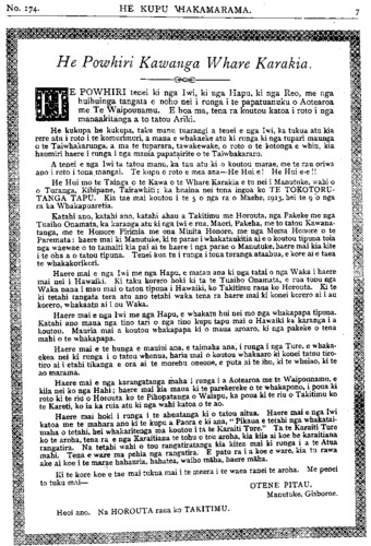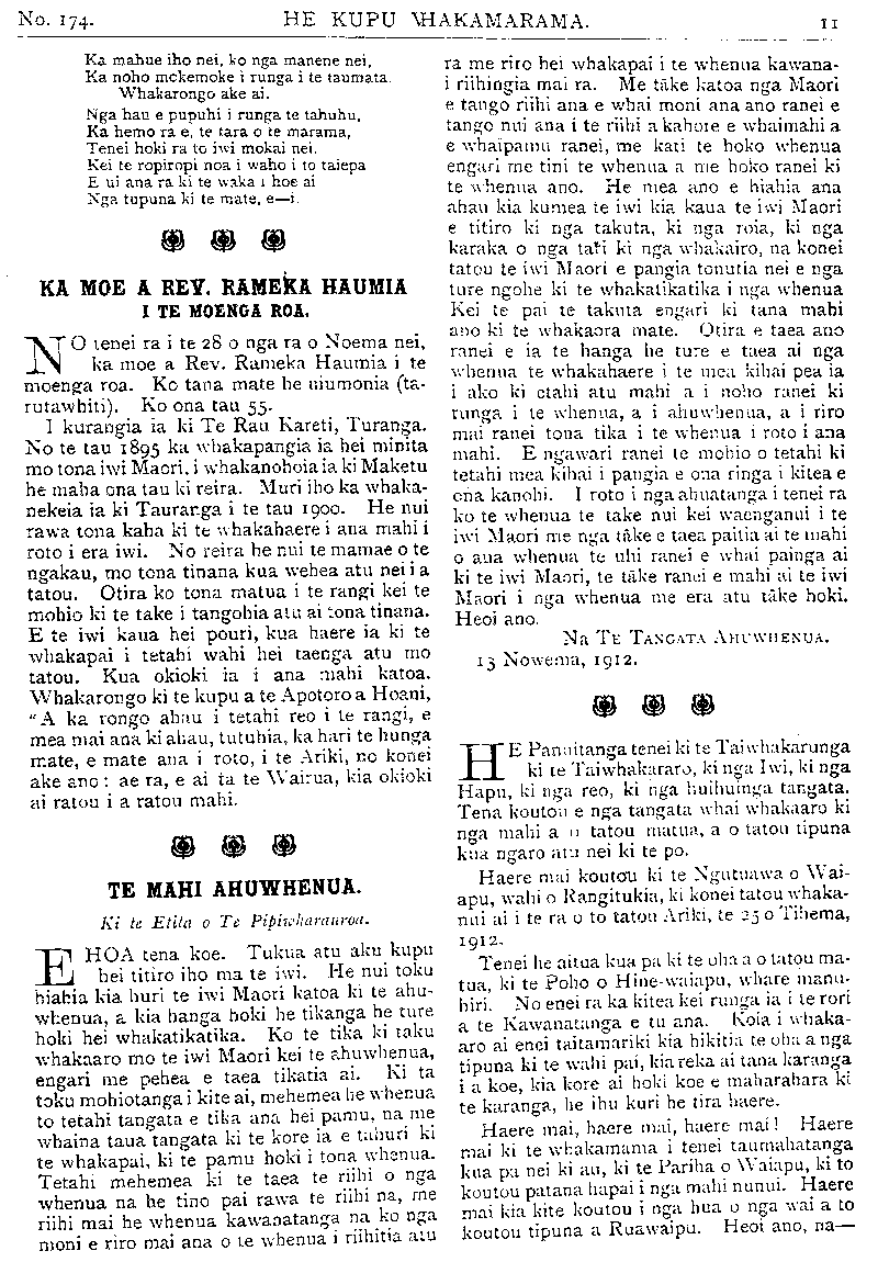 No.174. HE KUPU WHAKAMARAMA. 11 Ka mahue iho nei, ko nga manene nei, Ka noho mokemoke i runga i te taumata. Whakarongo ake ai. Nga hau e pupuhi i runga te tahuhu, Ka hemo ra e, te tara o te marama, Tenei hoki ra to iwi mokai nei, Kei te ropiropi noa i waho i to taiepa E ui ana ra ki te waka i hoe ai Nga tupuna ki te mate, e—i. KA MOE A REV. RAMEKA HAUMIA I TE MOENGA ROA. NO tenei ra i te 28 o nga ra o Noema nei, ka moe a Rev. Rameka Haumia i te moenga roa. Ko tana mate he niumonia (ta- rutawhiti). Ko ona tau 55 I kurangia ia ki Te Rau Kareti, Turanga. No te tau 1895 ka whakapangia ia hei minita mo tona iwi Maori, i whakanohoia ia ki Maketu he maha ona tau ki reira. Muri iho ka whaka- nekeia ia ki Tauranga i te tau 1900. He nui rawa tona kaha ki te whakahaere i ana mahi i roto i era iwi. No reira he nui te mamae o te ngakau, mo tona tinana kua wehea atu nei i a tatou. Otira ko tona matua i te rangi kei te mohio ki te take i tangohia atu ai tona tinana. E te iwi kaua hei pouri, kua haere ia ki te whakapai i tetahi wahi hei taenga atu mo tatou. Kua okioki ia i ana mahi katoa. Whakarongo ki te kupu a te Apotoro a Hoani, "A ka rongo ahau i tetahi reo i te rangi, e mea mai ana ki ahau, tutuhia, ka hari te hunga mate, e mate ana i roto, i te Ariki, no konei ake ano: ae ra, e ai ta te Wairua, kia okioki ai ratou i a ratou mahi. TE MAHI AHUWHENUA. Ki te Etita o Te Pipiwharauroa EHOA tena koe. Tukua atu aku kupu hei titiro iho ma te iwi. He nui toku hiahia kia huri te iwi Maori katoa ki te ahu- whenua, a kia hanga hoki he tikanga he ture hoki hei whakatikatika. Ko te tika ki taku whakaaro mo te iwi Maori kei te ahuwhenua, engari me pehea e taea tikatia ai. Ki ta toku mohiotanga i kite ai, mehemea he whenua to tetahi tangata e tika ana hei pamu, na me whaina taua tangata ki te kore ia e tahuri ki te whakapai, ki te pamu hoki i tona whenua. Tetahi mehemea ki te taea te nihi o nga whenua na he tino pai rawa te riihi na, me nihi mai he whenua kawanatanga na ko nga moni e riro mai ana o te whenua i riihitia atu ra me riro hei whakapai i te whenua kawana- i riihingia mai ra. Me take katoa nga Maori e tango nihi ana e whai moni ana ano ranei e tango nui ana i te nihi a kahore e whaimahi a e whaipamu ranei, me kati te hoko whenua engari me tini te whenua a me hoko ranei ki te whenua ano. He mea ano e hiahia ana ahau kia kumea te iwi kia kaua te iwi Maori e titiro ki nga takuta, ki nga roia, ki nga karaka o nga tahi ki nga whakairo, na konei tatou te iwi Maori e pangia tonutia nei e nga ture ngohe ki te whakatikatika i nga whenua Kei te pai te takuta engari ki tana mahi ano ki te whakaora mate. Otira e taea ano ranei e ia te hanga be ture e taea ai nga whenua te whakahaere i te mea kihai pea ia i ako ki etahi atu mahi a i noho ranei ki runga i te whenua, a i ahuwhenua, a i riro mai ranei tona tika i te whenua i roto i ana mahi. E ngawari ranei te mohio o tetahi ki tetahi mea kihai i pangia e ona ringa i kitea e ona kanohi. I roto i nga ahuatanga i tenei ra ko te whenua te take nui kei waenganui i te iwi Maori me nga take e taea paitia ai te mahi o aua whenua te uhi ranei e whai painga ai ki te iwi Maori, te take ranei e mahi ai te iwi Maori i nga whenua me era atu take hoki. Heoi ano. Na TE TANGATA AHUWHENUA. 13 Nowema, 1912. HE Panuitanga tenei ki te Tai whakarunga ki te Taiwhakararo, ki nga Iwi, ki nga Hapu, ki nga reo, ki nga huihuinga tangata. Tena koutou e nga tangata whai whakaaro ki nga mahi a ) tatou matua, a o tatou tipuna kua ngaro atu nei ki te po. Haere mai koutou ki te Ngutuawa o Wai- apu, wahi o Rangitukia, ki konei tatou whaka- nui ai i te ra o to tatou Ariki, te 25 o Tihema, 1912. Tenei he aitua kua pa ki te oha a o tatou ma- tua, ki te Poho o Hine-waiapu, whare manu- hiri. No enei ra ka kitea kei runga ia i te rori a te Kawanatanga e tu ana. Koia i whaka- aro ai enei taitamariki kia hikitia te uha a nga tipuna ki te wahi pai, kia reka ai tana karanga i a koe, kia kore ai hoki koe e maharahara ki te karanga, he ihu kuri he tira haere. Haere mai, haere mai, haere mai! Haere mai ki te whakamama i tenei taumahatanga kua pa nei ki au, ki te Pariha o Waiapu, ki to koutou patana hapai i nga mahi nunui. Haere mai kia kite koutou i nga hua u nga wai a to koutou tipuna a Ruawaipu. Heoi ano, na—