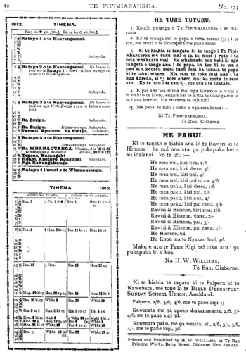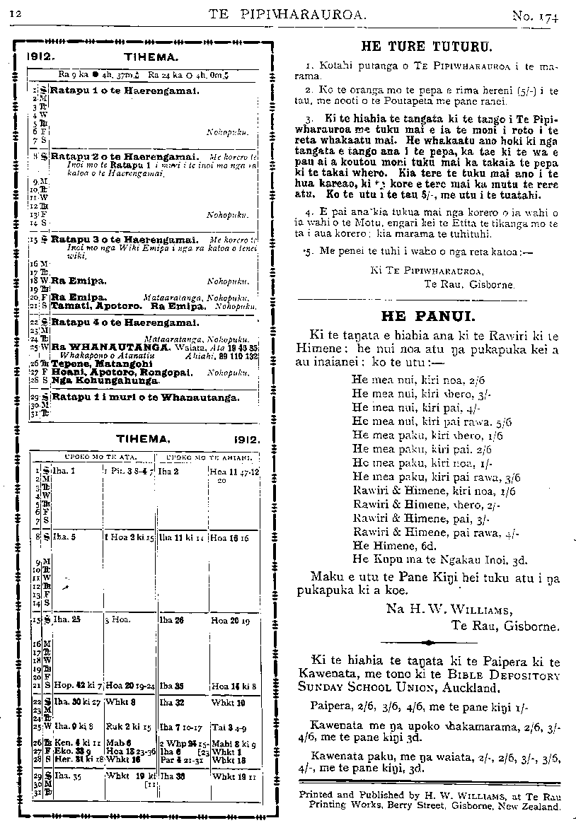 TE PIPIWHARAUROA. HE TURE TUTURU. 1. Kotahi putanga o TE PIPIWHARAUROA i te ma- rama. 2. Ko te oranga mo te pepa e rima hereni (5/-) i te tau, me nooti o te Poutapeta me pane ranei, auaka i te tiaki he pane kingi hepene nga pane e tino hiahiatia ana. 3. Ki te pau nga hereni a tetahi tangata i tuku mai ai ka tukua atu he kaute. Ki te tae atu te kaute kia hohoro te tuku mai i te moni, na te moni hoki i puta atu ai te pepa ehara i te mea tupu noa. 4. E pai ana kia tukua mai nga korero o ia wahi o ia wahi o te Motu, engari kei te Etita te tikanga mo te ta i aua korero : kia marama te tuhituhi. 5. Me penei te tuhi i waho o nga reta katoa: — Ki TE PIPIWHARAUROA, Te Rau, Gisborne. HE PANUI Ki te tangata e hiahia ana ki te Rawiri ki te Himene : he nui noa atu nga pukapuka kei a au inaianei : ko te utu : — He mea nui, kin noa ... 2/6 He mea nui, kiri wher ... 3/- He mea nui, kiri pai ... 4/— He mea nui kiri pai rawa ... 5/6 H e mea paku, kiri whero ... 1/6 H e mea paku, kiri pai . . . 2/6 He mea paku, kiri noa ... 1/- He mea paku, kiri pai rawa 3/6 Rawiri & Himene, kiri noa 1/6 Rawiri & Himene, whero ... 2/- Rawiri & Himene, pai ... 3/- Rawiri & Himene, pai rawa 4/- He Himene ... ... -/6 Maku e utu te Pane Kingi hei tuku atu i nga pukapuka ki a koe. Na H. W. WILLIAMS, Te Rau, Gisborne. Ki te hiahia te tangata ki te Paipera ki te, Kawenata, me tono ki te BIBLE DEPOSITORY SUNDAY SCHOOL UNION, Auckland. Paipera, 2/6, 3/6, 4/6, me te pane kingi //- Kawenata me nga upoko whakamarama 2/6 3/- 4/6, me te pane kingi 3d. Kawenata paku, me nga waiata 2/-, 2/6, 3/-, 3/6, 4/-, me te pane kingi, 3d. Printed and Published by H. W. WILLIAMS, at Te Rau Printing Works, Berry Street, Gisborne, New Zealand.