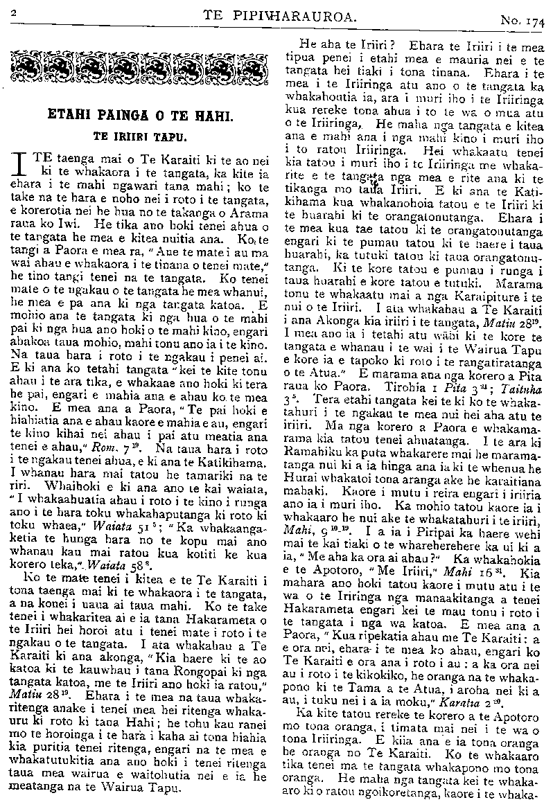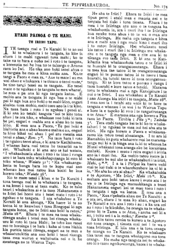 TE PIPIWHARAUROA. No.174 ETAHI PAINGA O TE HAHI. TE IRIIRI TAPU. ITE taenga mai o Te Karaiti ki te ao nei ki te whakaora i te tangata, ka kite ia ehara i te mahi ngawari tana mahi; ko te take na te hara e noho nei i roto i te tangata, e korerotia nei he hua no te takanga o Arama raua ko Iwi. He tika ano hoki tenei ahua o te tangata he mea e kitea nuitia ana. Ko, te tangi a Paora e mea ra, " Aue te mate i au ma wai ahau e whakaora i te tinana o tenei mate," he tino tangi tenei na te tangata. Ko tenei mate o te ngakau o te tangata he mea whanui, he mea e pa ana ki nga tangata katoa. E mohio ana te tangata ki nga hua o te mahi pai ki nga hua ano hoki o te mahi kino, engari ahakoa taua mohio, mahi tonu ano ia i te kino. Na taua hara i roto i te ngakau i penei ai. E ki ana ko tetahi tangata "kei te kite tonu ahau i te ara tika, e whakaae ano hoki ki tera he pai, engari e mahia ana e ahau ko te mea kino. E mea ana a Paora, " Te pai hoki e hiahiatia ana e ahau kaore e mahia e au, engari te kino kihai nei ahau i pai atu meatia ana tenei e ahau," Rom. 7 19 Na taua hara i roto i te ngakau tenei ahua, e ki ana te Katikihama. I whanau hara mai tatou he tamariki na te riri. Whaihoki e ki ana ano te kai waiata, " I whakaahuatia ahau i roto i te kino i runga ano i te hara toku whakahaputanga ki roto ki toku whaea," Waiata 51; "Ka whakaanga- ketia te hunga hara no te kopu mai ano whanau kau mai ratou kua kotiti ke kua korero teka,"-. Waiata 58 9 Ko te mate tenei i kitea e te Te Karaiti i tona taenga mai ki te whakaora i te tangata, a na konei i uaua ai taua mahi. Ko te take tenei i whakaritea ai e ia tana Hakarameta o te Iriiri hei horoi atu i tenei mate i roto i te ngakau o te tangata. I ata whakahau a Te Karaiti ki ana akonga, " Kia haere ki te ao katoa ki te kauwhau i tana Rongopai ki nga tangata katoa, me te Iriiri ano hoki ia ratou," Matiu 28 19 Ehara i te mea na taua whaka- ritenga anake i tenei mea hei ritenga whaka- uru ki roto ki tana Hahi; he tohu kau ranei mo te horoinga i te hara i kaha ai tona hiahia kia puritia tenei ritenga, engari na te mea e whakatutukitia ana ano hoki i tenei ritenga taua mea wairua e waitohutia nei e ia he meatanga na te Wairua Tapu. He aha te Iriiri? Ehara te Iriiri i te mea tipua penei i etahi mea e mauria nei e te tangata hei tiaki i tona tinana. Ehara i te mea i te Iriiringa atu ano o te tangata ka whakahoutia ia, ara i muri iho i te Iriiringa kua rereke tona ahua i to te wa o mua atu o te Iriiringa He maha nga tangata e kitea ana e mahi ana i nga mahi kino i muri iho i to ratou Iriiringa. Hei whakaatu tenei kia tatou i muri iho i te Iriiringa me whaka- ri te e te tangata nga mea e rite ana ki te tikanga mo taua Iriiri. E ki ana te Kati- kihama kua whakanohoia tatou e te Iriiri ki te huarahi ki te orangatonutanga. Ehara i te mea kua tae tatou ki te orangatonutanga engari ki te pumau tatou ki te haere i taua huarahi, ka tutuki tatou ki taua orangatonu- tanga. Ki te kore tatou e pumau i runga i taua huarahi e kore tatou e tutuki. Marama tonu te whakaatu mai a nga Karaipiture i te nui o te Iriiri. I ata whakahau a Te Karaiti i ana Akonga kia iriiri i te tangata, Matiu 28 19 I mea ano ia i tetahi atu wahi ki te kore te tangata e whanau i te wai i te Wairua Tapu e kore ia e tapoko ki roto i te rangatiratanga o te Atua." E marama ana nga korero a Pita raua ko Paora. Tirohia 1 Pita 3 21 Taituha 3 5. Tera etahi tangata kei te ki ko te whaka- tahuri i te ngakau te mea nui hei aha atu te iriiri. Ma nga korero a Paora e whakama- rama kia tatou tenei ahuatanga. I te ara ki Ramahiku ka puta whakarere mai he marama- tanga nui ki a ia hinga ana ia ki te whenua he Hurai whakatoi tona aranga ake he karaitiana mahaki. Kaore i mutu i reira engari i iriiria ano ia i muri iho. Ka mohio tatou kaore ia i whakaaro he nui ake te whakatahuri i te iriiri, Mahi, 9 10 19 I a ia i Piripai ka haere wehi mai te kai tiaki o te whareherehere ka ui ki a ia, " Me aha ka ora ai ahau?" Ka whakahokia e te Apotoro, "Me Iriiri," Mahi 16 31 Kia mahara ano hoki tatou kaore i mutu atu i te wa o te Iriringa nga manaakitanga a tenei Hakarameta engari kei te mau tonu i roto i te tangata i nga wa katoa. E mea ana a Paora, " Kua ripekatia ahau me Te Karaiti: a e ora nei, ehara i te mea ko ahau, engari ko Te Karaiti e ora ana i roto i au a ka ora nei au i roto i te kikokiko, he oranga na te whaka- pono ki te Tama a te Atua, i aroha nei ki a au, i tuku nei i a ia moku," Karatia 2 20 Ka kite tatou rereke te korero a te Apotoro mo tona oranga, i timata mai nei i te wa o tona Iriiringa. E kiia ana e ia tona oranga he oranga no Te Karaiti. Ko te whakaaro tika tenei ma te tangata whakapono mo tona oranga. He maha nga tangata kei te whaka- aro ki o ratou ngoikoretanga, kaore i te whaka-
