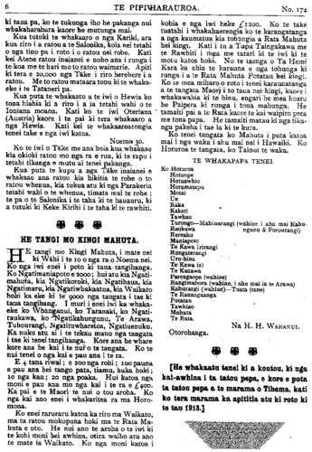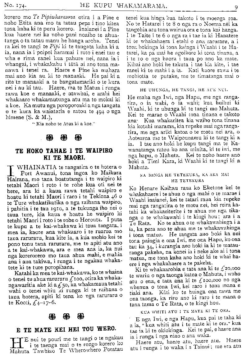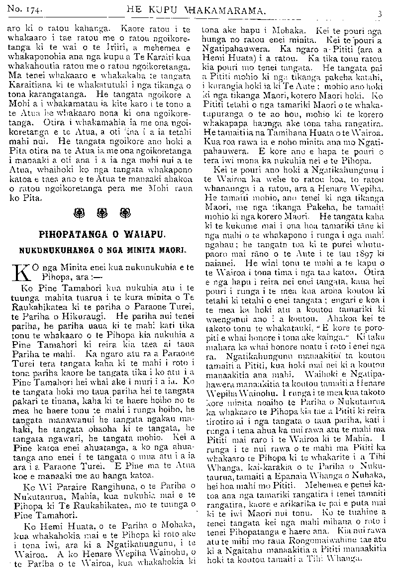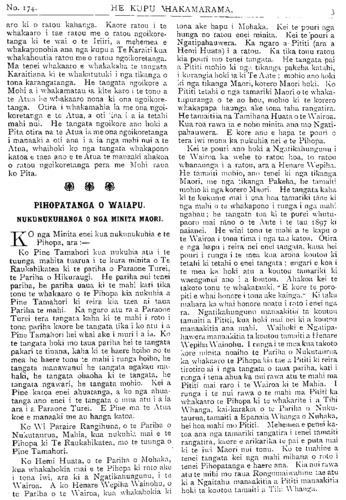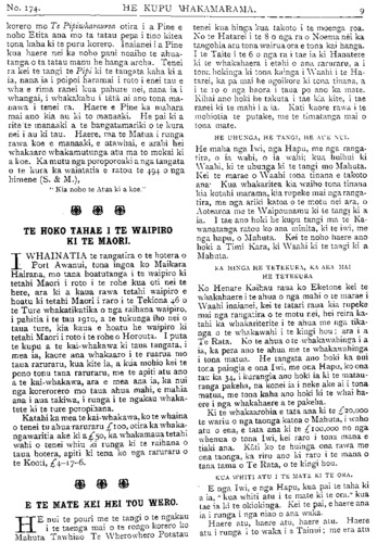 No.174. HE KUPU WHAKAMARAMA. 9 korero mo Te Pipiwharauroa otira i a Pine e noho Etita ana mo ta tatau pepa i tino kitea tona kaha ki te puru korero. Inaianei i a Pine kua haere nei ka noho pani noaiho te ahua- tanga o ta tatau manu he hanga aroha. Tenei ra kei te tangi te Pipi ki te tangata kaha ki a ia, nana ia i poipoi haramai i roto i enei tau e wha e rima ranei kua pahure nei, nana ia i whangai, i whakakahu i tata ai ano tona ma- nawa i tenei ra. Haere e Pine ka mahara mai ano kia au ki to manaaki. He pai ki a rite te manaaki a te hangatamariki o te kura nei i au ki tau. Haere, ma te Matua i runga rawa koe e manaaki, e atawhai, e arahi hei whakaaro whakamutunga atu ma to mokai ki a koe. Ka mutu nga poroporoaki a nga tangata o te kura ka waiatatia e ratou te 494 o nga himene (S. & M.), " Kia noho te Atua ki a koe." TE HOKO TAHAE I TE WAIPIRO KI TE MAORI. I WHAINATIA te rangatira o te hotera o Port Awanui, tona ingoa ko Maikara Hairana, mo tana hoatutanga i te waipiro ki tetahi Maori i roto i te rohe kua oti nei te here, ara ki a kaua rawa tetahi waipiro e hoatu ki tetahi Maori i raro i te Tekiona 46 o te Ture whakatikatika o nga raihana waipiro, i pahitia i te tau 1910, a te tukunga iho nei o taua ture, kia kaua e hoatu he waipiro ki tetahi Maori i roto i te rohe o Horouta. I puta te kupu a te kai -whakawa ki taua tangata, i mea ia, kaore ana whakaaro i te ruarua mo taua raruraru, kua kite ia, a kua mohio kei te pono tonu tana raruraru, me te apiti atu ano a te kai -whakawa, ara e mea ana ia, ka nui nga korerorero mo taua ahua mahi, e mahia ana i aua takiwa, i runga i te ngakau whaka- tete ki te ture poropihana. Katahi ka mea te kai-whakawa, ko te whaina o tenei tu ahua raruraru £100, otira ka whaka ngawaritia ake ki a £50, ka whakamaua tetahi wahi o tenei whiu ki runga ki te raihana o taua hotera, apiti ki tena ko nga raruraru o te Kooti, £4-17-6. E TE MATE KEI HEI TOU WERO. HE nui te pouri me te tangi o te ngakau i te taenga mai o te rongo korero ko Mahuta Tawhiao Te Wherowhero Potatau tenei kua hinga kua takoto i te moenga roa. No te Hatarei i te 8 o nga ra o Noema nei ka tangohia atu tona wairua ora e tona kai hanga. I te Taite i te 6 o nga ra i tae ia ki Hanatere ki te whakahaera i etahi o ana raruraru, a i tona hokinga ki tona kainga i Waahi i te Ha- tarei, ka pa mai he ngoikore ki tona tinana, a i te 10 o nga haora i taua po ano ka mate. Kihai ano hoki be takuta i tae kia kite, i tae ranei ki te mahi i a ia. Kati kaore rawa i te mohiotia te putake, me te timatanga mai o tona mate. HE UHUNGA, HE TANGI, HE AUE NUI. He maha nga Iwi, nga Hapu, me nga ranga- tira, o ia wahi, o ia wahi; kua huihui ki Waahi, ki te uhunga ki te tangi mo Mahuta. Kei te marae o Waahi tona tinana e takoto ana Kua whakaritea kia waiho tona tinana kia kotahi marama, kia rupeke mai nga ranga- tira, me nga ariki katoa o te motu nei ara, o Aotearoa me te Waipounamu ki te tangi ki a ia. I tae ano hoki he kupu tangi ma te Ka- wanatanga ratou ko ana minita, ki te iwi, me nga hapu, o Mahuta. Kei te noho haere ano hoki a Timi Kara, ki Waahi ki te tangi ki a Mahuta. KA HINGA HE TETEKURA, KA AKA MAI HE TETEKURA Ko Henare Kaihau raua ko Eketone kei te whakahaere i te ahua o nga mahi o te marae i Waahi inaianei, kei te tatari raua kia rupeke mai nga rangatira o te motu nei, hei reira ka- tahi ka whakariterite i te ahua me nga tika- nga o te whakawahi i te kingi hou; ara i a Te Rata. Ko te ahua o te whakawahinga i a ia, ka pera ano te ahua me te whakawahinga i tona matua. He tangata ano hoki ka nui tona paingia e ona Iwi, me ona Hapu, ko ona tau ka 34 kurangia ano hoki ia ki te matau- ranga pakeha, na konei ia i neke ake ai i tona matua, me tona kaha ano hoki ki te whai ha- ere i nga whakahaere a te pakeha. Ki te whakaarohia e tata ana ki te £20, 000 te wariu o nga taonga katoa o Mahuta, i waho atu o ena, e tata ana ki te £100,000 no nga whenua o tona Iwi, kei raro i tona mana e tiaki ana. Kati ko te huinga ona rawa me ona taonga, ka riro ano ki raro i te mana o tana tama o Te Rata, o te kingi hou. KUA WHITI ATU I TE MATE KI TE ORA. E nga Iwi, e nga Hapu, kua pai te taha ki a ia, " kua whiti atu i te mate ki te ora," kua tae ia ki te okiokinga. Kei te pai, e haere ana ia i runga i nga niao o ana waka. Haere atu, haere atu, haere atu. Haere atu i runga i to waka i a Tainui; me era atu