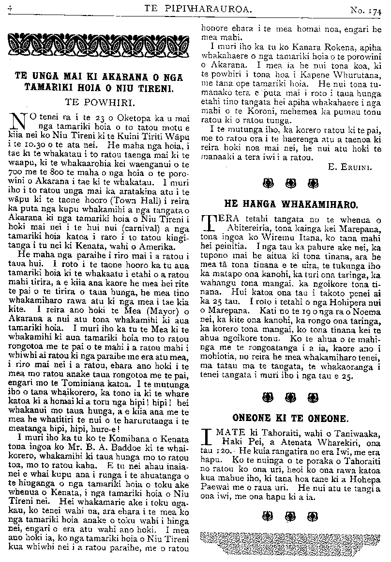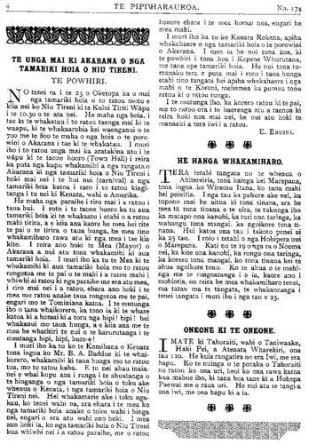 4 TE PIPIWHARAUROA. No.174 TE UNGA MAI KI AKARANA O NGA TAMARIKI HOIA O NIU TIRENI. TE POWHIRI. NO tenei ra i te 23 o Oketopa ka u mai nga tamariki hoia o to tatou motu e kiia nei ko Niu Tireni ki te Kuini Tiriti Wapu i te 10.30 o te ata nei. He maha nga hoia, i tae ki te whakatau i to ratou taenga mai ki te waapu, ki te whakaarohia kei waenganui o te 700 me te 800 te maha o nga hoia o te poro- wini o Akarana i tae ki te whakatau. I muri iho i to ratou unga mai ka aratakina atu i te wapu ki te taone hooro (Town Hall) i reira ka puta nga kupu whakamihi a nga tangata o Akarana ki nga tamariki hoia o Niu Tireni i hoki mai nei i te hui nui (carnival) a nga tamariki hoia katoa i raro i to tatou kingi- tanga i tu nei ki Kenata, wahi o Amerika. He maha nga paraihe i riro mai i a ratou i taua hui. I roto i te taone hooro ka tu aua tamariki hoia ki te whakaatu i etahi o a ratou mahi tirira, a e kiia ana kaore he mea hei rite te pai o te tirira o taua hunga, he mea tino whakamiharo rawa atu ki nga mea i tae kia kite. I reira ano hoki te Mea (Mayor) o Akarana a nui atu tona whakamihi ki aua tamariki hoia. I muri iho ka tu te Mea ki te whakamihi ki aua tamariki hoia mo to ratou rongotoa me te pai o te mahi i a ratou mahi i whiwhi ai ratou ki nga paraihe me era atu mea, i riro mai nei i a ratou, ehara ano hoki i te mea mo ratou anake taua rongotoa me te pai, engari mo te Tominiana katoa. I te mutunga iho o tana whaikorero, ka tono ia ki te whare katoa ki a homai ki a toru nga hipi! i hipi! hei whakanui mo taua hunga, a e kiia ana me te mea he whatitiri te nui o te harurutanga i te meatanga hipi, hipi, hure-e! I muri iho ka tu ko te Komihana o Kenata tona ingoa ko Mr. B. A. Baddoe ki te whai- korero, whakamihi ki taua hunga mo to ratou toa, mo to ratou kaha. E tu nei ahau inaia- nei e whai kupu ana i runga i te ahuatanga o te hinganga o nga tamariki hoia o toku ake whenua o Kenata, i nga tamariki hoia o Niu Tireni nei. Hei whakamarie ake i toku nga- kau, ko tenei wahi na, ara ehara i te mea ko nga tamariki hoia anake o toku wahi i hinga nei, engari o era atu wahi ano hoki. I mea ano hoki ia, ko nga tamariki hoia o Niu Tireni kua whiwhi nei i a ratou paraihe, me o ratou honore ehara i te mea homai noa, engari he mea mahi. I muri iho ka tu ko Kanara Rokena, apiha whakahaere o nga tamariki hoia o te porowini o Akarana. I mea ia he nui tona koa, ki te powhiri i tona hoa i Kapene Whurutana, me tana ope tamariki hoia. He nui tona tu- manako tera e puta mai i roto i taua hunga etahi tino tangata hei apiha whakahaere i nga mahi o te Koroni, mehemea ka pumau tonu ratou ki o ratou tunga. I te mutunga iho, ka korero ratou ki te pai, me to ratou ora i te haerenga atu a taenoa ki reira hoki noa mai nei, he nui atu hoki te manaaki a tera iwi i a ratou. E. ERUINI. HE HANGA WHAKAMIHARO. TERA tetahi tangata no te whenua o i Ahitereiria, tona kainga kei Marepana, tona ingoa ko Wiremu Itana, ko tana mahi hei peinitia. I nga tau ka pahure ake nei, ka tupono mai he aitua ki tona tinana, ara he mea ta tona tinana e te uira, te tukunga iho ka matapo ona kanohi, ka turi ona taringa, ka wahangu tona mangai ka ngoikore tona ti- nana. Hui katoa ona tau i takoto penei ai ka 25 tau. I roto i tetahi o nga Hohipera nui o Marepana. Kati no te 19 o nga ra o Noema nei, ka kite ona kanohi, ka rongo ona taringa, ka korero tona mangai, ko tona tinana kei te ahua ngoikore tonu. Ko te ahua o te mahi- nga me te rongoatanga i a ia, kaore ano i mohiotia, no reira he mea whakamiharo tenei, ma tatau ma te tangata, te whakaoranga i tenei tangata i muri iho i nga tau e 25. ONEONE KI TE ONEONE. I MATE ki Tahoraiti, wahi o Taniwaaka, Haki Pei, a Atenata Wharekiri, ona tau 120. - He kuia rangatira no era Iwi, me era hapu. Ko te nuinga o te poraka o Tahoraiti no ratou ko ona uri, heoi ko ona rawa katoa kua mahue iho, ki tana hoa tane ki a Hohepa Paewai me o raua uri. He nui atu te tangi a ona iwi, me ona hapu ki a ia.