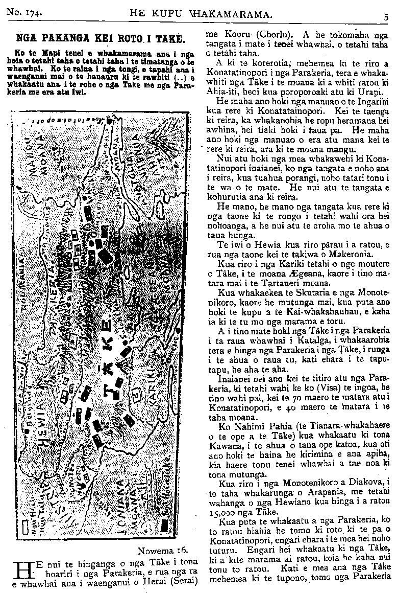 No. 174. HE KUPU WHAKAMARAMA. NGA PAKANGA KEI ROTO I TAKE. Ko te Mapi tenei e whakamarama ana i nga hoia o tetahi taha o tetahi taha i te timatanga o te whawhai. Ko te raina i nga tongi, e tapahi ana i waenganui mai o te hauauru ki te rawhiti (..) e whakaatu ana i te rohe o nga Take me nga Para- keria me era atu Iwi. Nowema 16. HE nui te hinganga o nga Take i tona hoariri i nga Parakeria, e rua nga ra e whawhai ana i waenganui o Herai (Serai) me Kooru (Chorlu). A he tokomaha nga tangata i mate i tenei whawhai, o tetahi taha o tetahi taha. A ki te korerotia, mehemea ki te riro a Konatatinopori i nga Parakeria, tera e whaka- whiti nga Take i te moana ki a whiti ratou ki Ahia-iti, heoi kua poroporoaki atu ki Urapi. He maha ano hoki nga manuao o te Ingarihi kua rere ki Konatatainopori. Kei te taenga ki reira, ka whakanohia he ropu heramana hei awhina, hei tiaki hoki i taua pa. He maha ano hoki nga manuao o era atu mana kei te rere ki reira, ara ki te moana mangu. Nui atu hoki nga mea whakawehi ki Kona- tatinopori inaianei, ko nga tangata e noho ana i reira, kua tuahua porangi, noho tatari tonu i te wa o te mate. He nui atu te tangata e kohurutia ana ki reira. He mano, he mano nga tangata kua rere ki nga taone ki te rongo i tetahi wahi ora hei nohoanga, a he nui atu te aroha mo te ahua o taua hunga. Te iwi o Hewia kua riro parau i a ratou, e rua nga taone kei te takiwa o Makeronia. Kua riro i nga Kariki tetahi o nge moutere o Take, i te moana Egeana, kaore i tino ma- tara mai i te Tartaneri moana. Kua whakaekea te Skutaria e nga Monote- nikoro, kaore he mutunga mai, kua puta ano hoki te kupu a te Kaiwhakahauhau, e kaha ia ki te tu mo nga marama e toru. A i tino mate hoki nga Take i nga Parakeria i ta raua whawhai i Katalga, i whakaarohia tera e hinga nga Parakeria i nga Take, i runga i te ahua o raua tu, kati ehara i te tapu- tapu, he aha te aha. Inaianei nei ano kei te titiro atu nga Para- keria, ki tetahi wahi ke ko (Visa) te ingoa, he tino wahi pai, kei te 70 maero te matara atu i Konatatinopori, e 40 maero te matara i te taha moana. Ko Nahimi Pahia (te Tianara- whakahaere o te ope a te Take) kua whakaatu ki tona Kawana, i te ahua o tana ope katoa, kua oti ano hoki te haina he kirimina e ana apiha, kia haere tonu tenei whawhai a tae noa ki tona mutunga. Kua riro i nga Monotenikoro a Diakova, i te taha whakarunga o Arapania, me tetahi wahanga o nga Hewiana kua hinga i a ratou 15, 000 nga Take. Kua puta te whakaatu a nga Parakeria, ko to ratou hiahia he tomo ki roto ki te pa o Konatatinopori, engari ehara i te mea hei noho tuturu. Engari hei whakaatu ki nga Take, ki a kite marama ai ratou, koia he kaha nui tonu to ratou. Kati e mea ana nga Take mehemea ki te tupono, tomo nga Parakeria