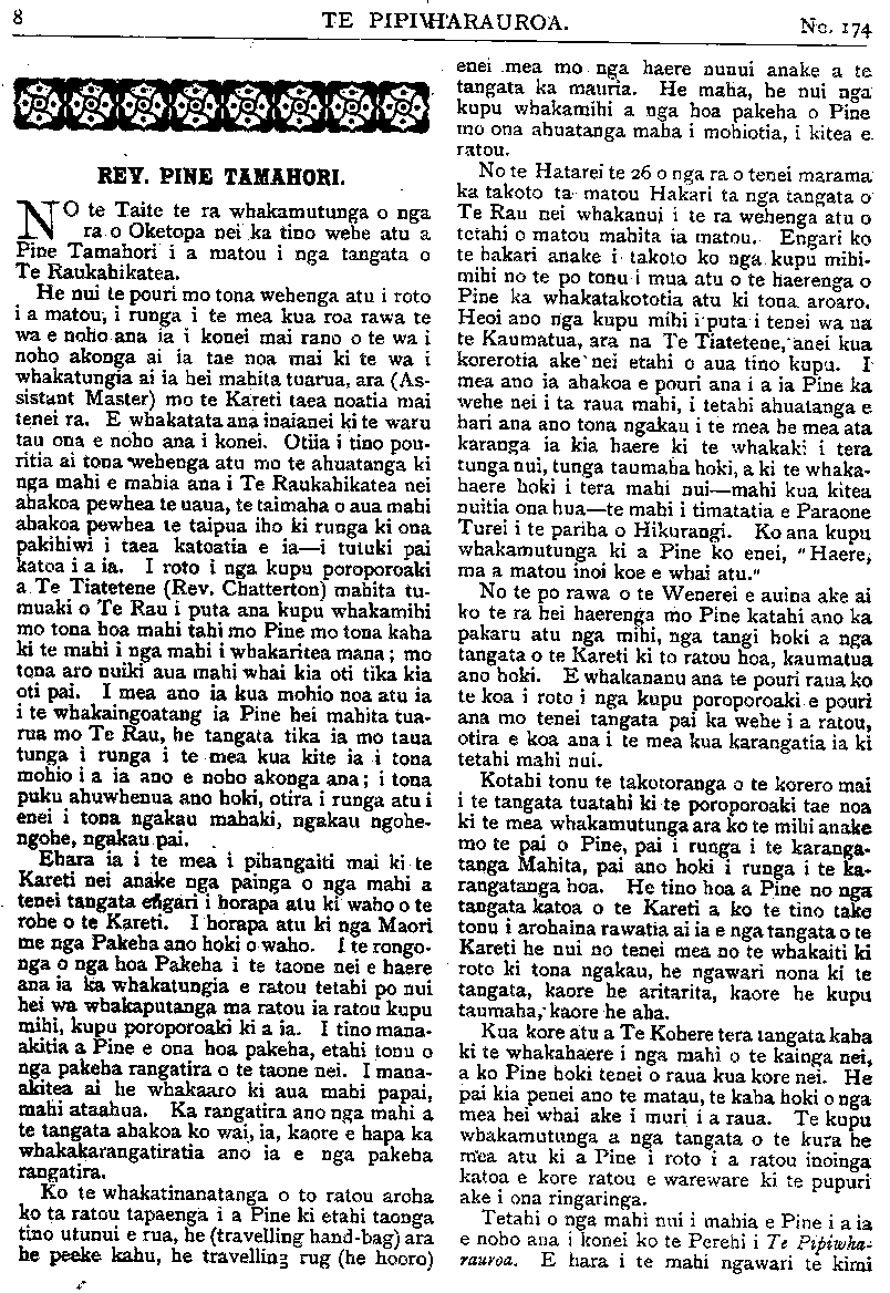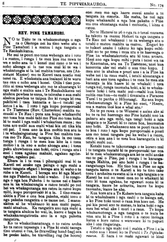 8 TE PIPIWHARAUROA. No. 174 REV. PINE TAMAHORI. NO te Taite te ra whakamutunga o nga ra o Oketopa nei ka tino wehe atu a Pine Tamahori i a matou i nga tangata o Te Raukahikatea. He nui te pouri mo tona wehenga atu i roto i a matou, i runga i te mea kua roa rawa te wa e noho ana ia i konei mai rano o te wa i noho akonga ai ia tae noa mai ki te wa i whakatungia ai ia hei mahita tuarua, ara (As- sistant Master) mo te Kareti taea noatia mai tenei ra. E whakatata ana inaianei ki te waru tau ona e noho ana i konei. Otiia i tino pou- ritia ai tona wehenga atu mo te ahuatanga ki nga mahi e mahia ana i Te Raukahikatea nei ahakoa pewhea te uaua, te taimaha o aua mahi ahakoa pewhea te taipua iho ki runga ki ona pakihiwi i taea katoatia e ia—i tutuki pai katoa i a ia. I roto i nga kupu poroporoaki a Te Tiatetene (Rev. Chatterton) mahita tu- muaki o Te Rau i puta ana kupu whakamihi mo tona hoa mahi tahi mo Pine mo tona kaha ki te mahi i nga mahi i whakaritea mana; mo tona aro nuiki aua mahi whai kia oti tika kia oti pai. I mea ano ia kua mohio noa atu ia i te whakaingoatanga ia Pine hei mahita tua- rua mo Te Rau, he tangata tika ia mo taua tunga i runga i te mea kua kite ia i tona mohio i a ia ano e noho akonga ana; i tona puku ahuwhenua ano hoki, otira i runga atu i enei i tona ngakau mahaki, ngakau ngohe- ngohe, ngakau pai. Ehara ia i te mea i pihangaiti mai ki te Kareti nei anake nga painga o nga mahi a tenei tangata engari i horapa atu ki waho o te rohe o te Kareti. I horapa atu ki nga Maori me nga Pakeha ano hoki o waho. I te rongo- nga o nga hoa Pakeha i te taone nei e haere ana ia ka whakatungia e ratou tetahi po nui hei wa whakaputanga ma ratou ia ratou kupu mihi, kupu poroporoaki ki a ia. I tino mana- akitia a Pine e ona hoa pakeha, etahi tonu o nga pakeha rangatira o te taone nei. I mana- akitea ai he whakaaro ki aua mahi papai, mahi ataahua. Ka rangatira ano nga mahi a te tangata ahakoa ko wai, ia, kaore e hapa ka whakakarangatiratia ano ia e nga pakeha rangatira. Ko te whakatinanatanga o to ratou aroha ko ta ratou tapaenga i a Pine ki etahi taonga tino utunui e rua, he (travelling hand-bag) ara he peeke kahu, he travelling rug (he hooro) enei mea mo nga haere nunui anake a te tangata ka mauria. He maha, he nui nga kupu whakamihi a nga hoa pakeha o Pine mo ona ahuatanga maha i mohiotia, i kitea e ratou. No te Hatarei te 26 o nga ra o tenei marama ka takoto ta matou Hakari ta nga tangata o Te Rau nei whakanui i te ra wehenga atu o tetahi o matou mahita ia matou. Engari ko te hakari anake i takoto ko nga kupu mihi- mihi no te po tonu i mua atu o te haerenga o Pine ka whakatakototia atu ki tona aroaro. Heoi ano nga kupu mihi i puta i tenei wa na te Kaumatua, ara na Te Tiatetene anei kua korerotia ake nei etahi o aua tino kupu. I mea ano ia ahakoa e pouri ana i a ia Pine ka wehe nei i ta raua mahi, i tetahi ahuatanga e hari ana ano tona ngakau i te mea he mea ata karanga ia kia haere ki te whakaki i tera tunga nui, tunga taumaha hoki, a ki te whaka- haere hoki i tera mahi nui—mahi kua kitea nuitia ona hua—te mahi i timatatia e Paraone Turei i te pariha o Hikurangi. Ko ana kupu whakamutunga ki a Pine ko enei, "Haere, ma a matou inoi koe e whai atu." No te po rawa o te Wenerei e auina ake ai ko te ra hei haerenga mo Pine katahi ano ka pakaru atu nga mihi, nga tangi hoki a nga tangata o te Kareti ki to ratou hoa, kaumatua ano hoki. E whakananu ana te pouri raua ko te koa i roto i nga kupu poroporoaki e pouri ana mo tenei tangata pai ka wehe i a ratou, otira e koa ana i te mea kua karangatia ia ki tetahi mahi nui. Kotahi tonu te takotoranga o te korero mai i te tangata tuatahi ki te poroporoaki tae noa ki te mea whakamutunga ara ko te mihi anake mo te pai o Pine, pai i runga i te karanga- tanga Mahita, pai ano hoki i runga i te ka rangatanga hoa. He tino hoa a Pine no nga tangata katoa o te Kareti a ko te tino take tonu i arohaina rawatia ai ia e nga tangata o te Kareti he nui no tenei mea no te whakaiti ki roto ki tona ngakau, he ngawari nona ki te tangata, kaore he aritarita, kaore he kupu taumaha kaore he aha. Kua kore atu a Te Kohere tera tangata kaha ki te whakahaere i nga mahi o te kainga nei, a ko Pine hoki tenei o raua kua kore nei. He pai kia penei ano te matau, te kaha hoki o nga mea hei whai ake i muri i a raua. Te kupu whakamutunga a nga tangata o te kura he mea atu ki a Pine i roto i a ratou inoinga katoa e kore ratou e wareware ki te pupuri ake i ona ringaringa. Tetahi o nga mahi nui i mahia e Pine i a ia e noho ana i konei ko te Perehi i Te Pipiwha- rauroa. E hara i te mahi ngawari te kimi