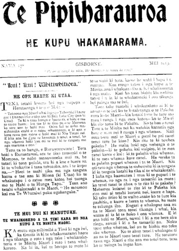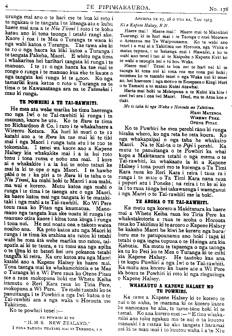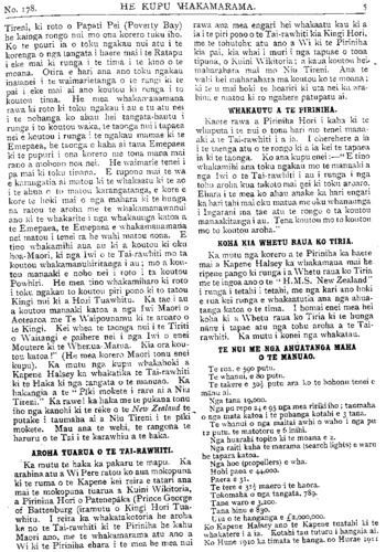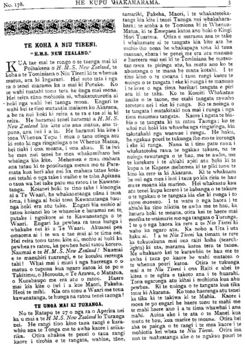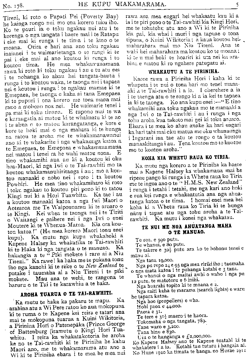 No.178. HE KUPU WHAKAMARAMA. TE KOHA A NIU TIRENI. H.M.S. NEW ZEALAND." KUA tae mai te rongo o te taenga mai ki Poihakena o H.M.S. New Zealand, te koha a te Tominiana o Niu Tireni ki te whenua matua, ara ki Ingarani. Hei roto tata i nga ra o tenei marama ka u mai ki Poneke. Ko te wahi tuatahi tonu tera he unga mai mona; Hei reira rano mohiotia ai, whakatuturutia ai hoki nga wahi hei taenga mona. Engari te wahi kei te tino matautia inaianei ko Akarana, a he ra nui hoki ki reira a te ra e tae ai ia ki reira. He haramai tenei haramai a H. M. S. New Zealand kia kite atu ana matua, ana ti- puna, ana iwi i a ia. He haramai kia kite i tona Whenua Tupu i mua o tana otinga atu ki roto ki nga ringaringa o te Whenua Matua, hei tiaki i ona moana, i ona akau. E te iwi he mea nui tenei he mea whakamiharo hei whainga kia kite. Mehemea e mau mahara ana tatau ki te pootitanga mema mo te Pare- mata kua hori ake nei ka mahara tatau koia- nei tetahi o nga take i waiho e te taha Apitana o taua wa hei take patu ma ratou i te Kawana- tanga. Koianei hoki te tino take i kinongia ai a Te Waari, he whakaaetanga na na i taua tima, i hinga ai hoki tona Kawanatanga hau- nga hoki era atu take. Engari kia mohio ai tatou koianei ko te whanoke e haramai nei te. putake i ngoi kore ai te Kawanatanga o te Waari. Engari ka pewhea ra taua hunga i whakahe nei ki a Te Waari. Akuanei pea omaoma ai i te wa e tae mai ai te tima nei. Hei reira tonu tatou kite ai, mohio ai hoki ka pewhea ra ratou, ka pewhea hoki ratou korero. Naumai e te H.M.S. New Zealand ! Naumai e te manuhiri tuarangi, e te kotuku rerenga tahi! Whai mai i muri i nga haerenga o o matua o tupuna kua ngaro katoa ki te po o Takitimu, o Horouta, o Te Arawa, o Matatua, o Kurahaupo me era atu o ratou. Haere mai kia kite o iwi i a koe Maori, Pakeha. Heoi te mihi. Kia ora tonu a Waari me tona kawanatanga, te hunga na ratou tenei taonga! TE UNGA MAI KI TURANGA. No te Ratapu te 27 o nga ra o Aperira nei ka u mai a te H.M.S. New Zealand ki Turanga nei. He rangi tino kino taua rangi e kara- whiu ana te Tonga me te awha kaore i arika- rika. Otira ahakoa te penei o taua rangi kaore i tirohia e te tangata, wahine, tane, tamariki, Pakeha, Maori, i te whakateteka- tanga kia kite i tenei Taonga nui whakahara- hara; te aroha a te Tomiona ki te Whenua- Matua, ki te Emepaea katoa ano hoki o Kingi Hori Tuarima. Otira e marama ana te take i whakamate ai te tangata kia kite ara he mohio iho nona he whakapapa tona ki taua manuao, ehara i te penei me era atu manuao e haereere mai nei ki te Tominiana he matao- tao rawa te piringa atu, ka mutu ano ko te ahuatanga o te mana he mana kotahi. I te tino kino o te moana i taua rangi kaore te nuinga o te tangata i eke ki runga i te manuao i te kore o nga tima harihari tangata e piri atu ki te taha. Ko te Komiti Whakatau anake o te taone, me etahi tangata rawaho torutoru nei i eke ki runga. Ko te nuinga o te tangata i matakitaki noa mai i runga i nga tima maumau tangata. Kaore i ngata te hia- hia o te tangata ki ta ratou Taonga ko te whai nui hoki kia whawha nga ringaringa, kia takatakahi nga waewae i runga. He haku, he ngakau pouri te tukunga iho mo te korenga i eke ki runga. Nana ia i tino patu rawa i whakatotohu rawa te ngakau takare, na te nuinga rawatanga o te hau, me te awha, me te karekare i te ahiahi apiti atu hoki ki te kupu a te Kapene mehemea ki te piki tonu te kino ka rere ia ki Akarana. Ki te whakaaro he nui nga mea i inoi i taua po kia riria te hau me te moana kia marino. Hei whakaatu kau atu tenei kupu korero i te kahanga o te takare o te ngakau o te tangata kia eke ki runga i to ratou manuao. I te waru o nga haora i te ahiahi ka tino hikitia te awha me te hau, ka haruru hoki te moana, otira kei te haere mai marika te waimarie mo nga tangata o Turanga. I te 9 o nga haora ka rere a te Niu Tireni ki waho ka ngaro atu. Ka noho a Uta i uta haku ai. I a te Niu Tireni ka timata te rere ka tukutukuria mai ona raiti kaha (search- lights) ki uta, marama katoa tera te taone. Me whakaaro kei te karawhiu te hau me te awha i taua po kaore he wahi matatea o te whenua pouri katoa. Otira te tukunga mai a te Niu Tireni i ona Raiti e ahei te kitea o te ngira e takoto ana i te huarahi. Tona ngaronga atu kihai i mohiotia kua ahu pewhea. Ki te nuinga o te tangata kua tika tonu ki Akarana. Ko tona haerenga atu tenei ka tika ki te takiwa ki te Mahia. Kaore i moea te po engari he haere tonu te mahi me te mahi haere ano i a te tima whawhai i ana mahi. Auina ake i te ata o te Manei kua mutu te hau, kua marire te moana. Otira hei aha te painga o te rangi i te mea kaore i te mohiotia kei whea te Niu Tireni. O tira ina noa te maneatanga ake o te ngakau pouri te