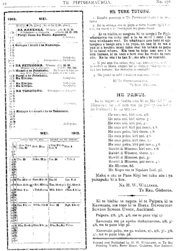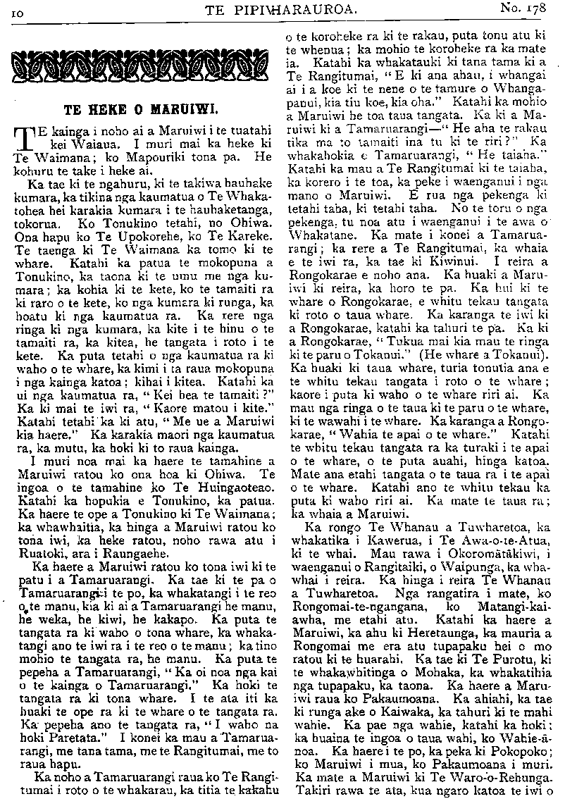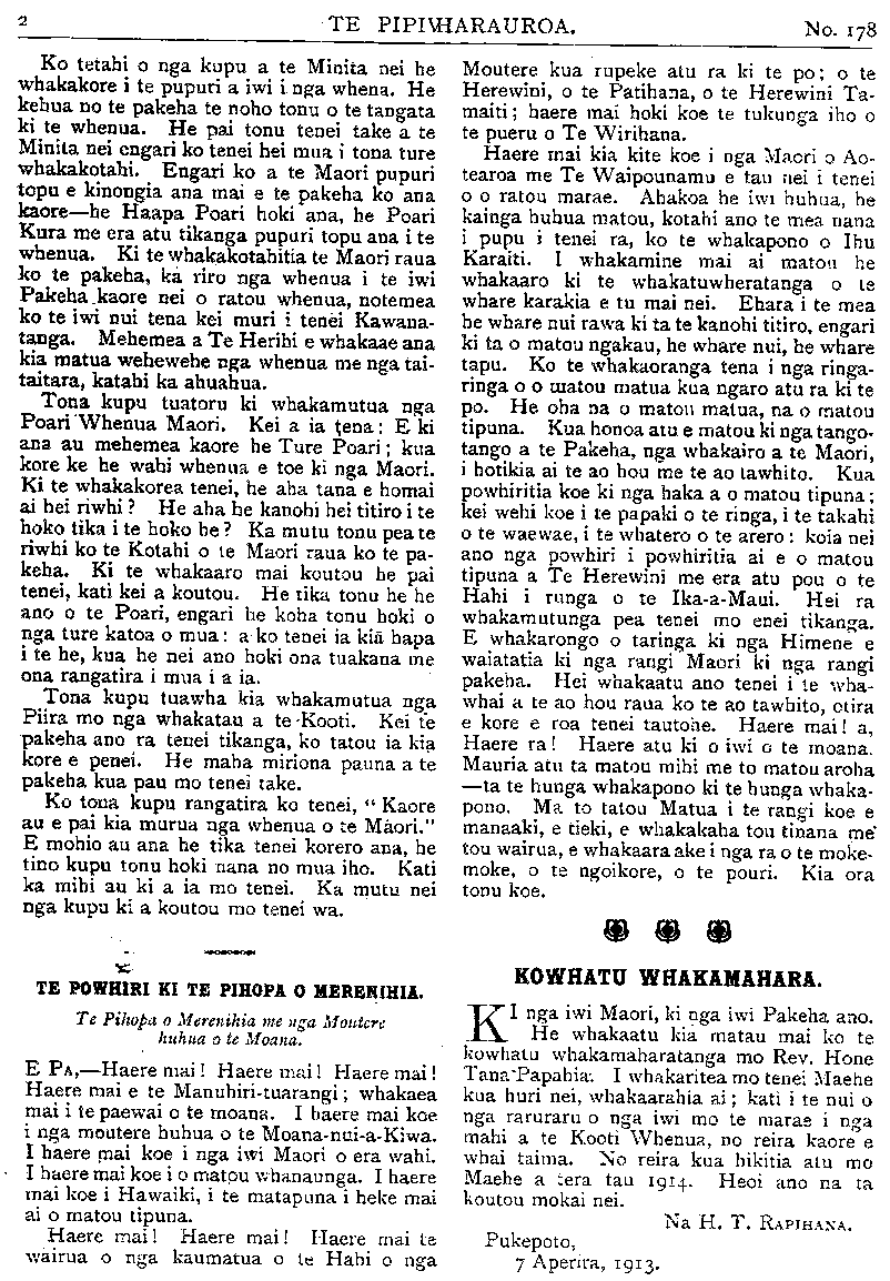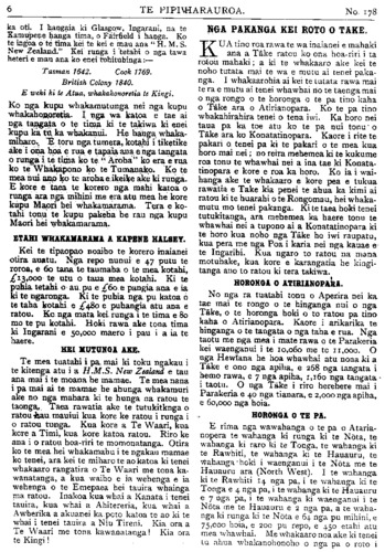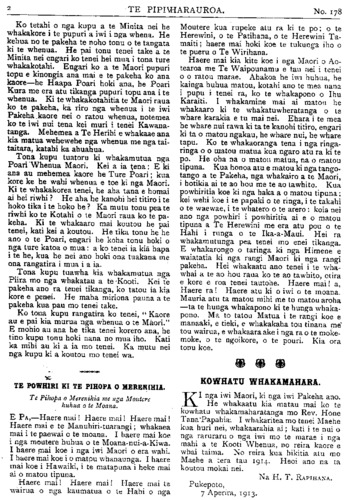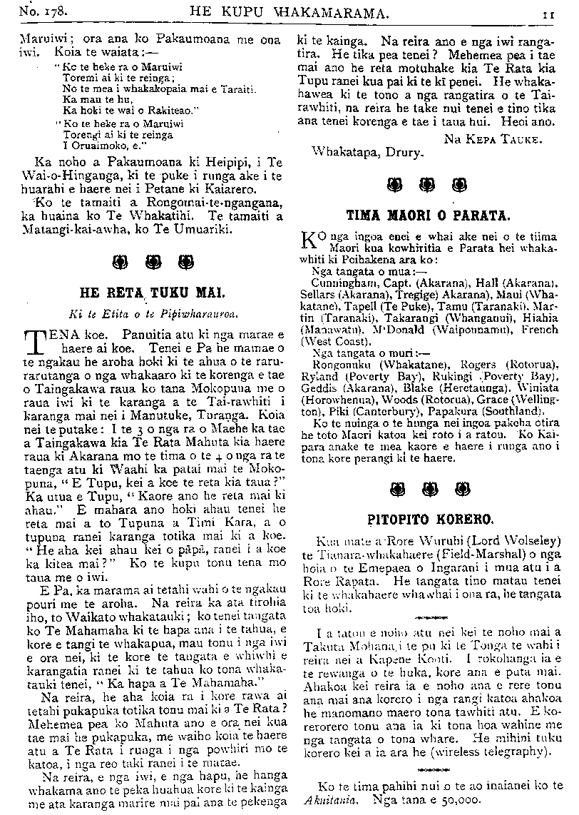 No.178. HE KUPU WHAKAMARAMA. Maruiwi; ora ana ko Pakaumoana me ona iwi. Koia te waiata— " Ko te heke ra o Maruiwi Toremi ai ki te reinga; No te mea i whakakopaia mai e Taraiti. Ka mau te hu, Ka hoki te wai o Rakiteao." " Ko te heke ra o Maruiwi Torengi ai ki te reinga I Oruaimoko, e." Ka noho a Pakaumoana ki Heipipi, i Te Wai-o-Hinganga, ki te puke i runga ake i te huarahi e haere nei i Petane ki Kaiarero. Ko te tamaiti a Rongomai-te-ngangana, ka huaina ko Te Whakatihi. Te tamaiti a Matangi-kai-awha, ko Te Umuariki. HE RETA TUKU MAI. Ki te Etita o te Pipiwharauroa TENA koe. Panuitia atu ki nga marae e haere ai koe. Tenei e Pa he mamae o te ngakau he aroha hoki ki te ahua o te raru- rarutanga o nga whakaaro ki te korenga e tae o Taingakawa raua ko tana Mokopuna me o raua iwi ki te karanga a te Tai-rawhiti i karanga mai nei i Manutuke, Turanga. Koia nei te putake I te 3 o nga ra o Maehe ka tae a Taingakawa kia Te Rata Mahuta kia haere raua ki Akarana mo te tima o te 4 o nga ra te taenga atu ki Waahi ka patai mai te Moko- puna, " E Tupu, kei a koe te reta kia taua?" Ka utua e Tupu, " Kaore ano he reta mai ki ahau." E mahara ano hoki ahau tenei he reta mai a to Tupuna a Timi Kara, a o tupuna ranei karanga totika mai ki a koe. " He aha kei ahau kei o papa, ranei i a koe ka kitea mai?" Ko te kupu tonu tena mo taua me o iwi. E Pa, ka marama ai tetahi wahi o te ngakau pouri me te aroha. Na reira ka ata tirohia iho, to Waikato whakatauki ko tenei tangata ko Te Manamana ki te hapa ana i te tahua, e kore e tangi te whakapua, mau tonu i nga iwi e ora nei, ki te kore te tangata e whiwhi e karangatia ranei ki te tahua ko tona whaka- tauki tenei, " Ka hapa a Te Mahamaha." Na reira, he aha koia ra i kore rawa ai tetahi pukapuka totika tonu mai ki a Te Rata? Mehemea pea ko Mahuta ano e ora nei kua tae mai he pukapuka, me waiho koia te haere atu a Te Rata i runga i nga powhiri mo te katoa, i nga reo taki ranei i te marae. Na reira, e nga iwi, e nga hapu, he hanga whakama ano te peka huahua kore ki te kainga me ata karanga marire mai pai ana te pekenga ki te kainga. Na reira ano e nga iwi ranga- tira. He tika pea tenei? Mehemea pea i tae mai ano he reta motuhake kia Te Rata kia Tupu ranei kua pai ki te ki penei. He whaka- hawea ki te tono a nga rangatira o te Tai- rawhiti, na reira he take nui tenei e tino tika ana tenei korenga e tae i taua hui. Heoi ano. Na KEPA TAUKE. Whakatapa, Drury. TIMA MAORI O PARATA. Ko nga ingoa enei e whai ake nei o te tiima Maori kua kowhiritia e Parata hei whaka- whiti ki Poihakena ara ko Nga tangata o mua:— Cunninghain, Capt. (Akarana), Hall (Akarana), Sellars (Akarana), Tregige) Akarana), Maui (Wha- katane), Tapell (Te Puke), Tamu (Taranaki). Mar- tin (Taranaki), Takarangi (Whanganui), Hiahia (Manawatu ) M'Donald (Waipounamu), French (West Coast). Nga tangata o muri— Rongonuku (Whakatane), Rogers (Rotorua), Ryland (Poverty Bay), Rukingi Poverty Bay), Geddis (Akarana), Blake (Heretaunga). Winiata (Horowhenua), Woods (Rotorua), Grace (Welling- ton), Piki (Canterbury), Papakura (Southland). Ko te nuinga o te hunga nei ingoa pakeha otira he toto Maori katoa kei roto i a ratou. Ko Kai- para anake te mea kaore e haere i runga ano i tona kore perangi ki te haere. PITOPITO KORERO. Kua mate a •Rore Wuruhi (Lord Wolseley) te Tianara-whakahaere (Field-Marshal) o nga hoia o te Emepaea o Ingarani i mua atu i a Rore Rapata. He tangata tino matau tenei ki te whakahaere whawhai i ona ra, he tangata toa hoki. I a tatou e noho atu nei kei te noho mai a Takuta Mohana i te pu ki te Tonga te wahi i reira nei a Kapene Kooti. I rokohanga ia e te rewanga o te huka, kore ana e puta mai. Ahakoa kei reira ia e noho ana e rere tonu ana mai ana korero i nga rangi katoa ahakoa he manomano maero tona tawhiti atu. E ko- rerorero tonu ana ia ki tona hoa wahine me nga tangata o tona whare. He mihini tuku korero kei a ia ara he (wireless telegraphy). Ko te tima pahihi nui o te ao inaianei ko te Akuitania. Nga tana e 50, 000.