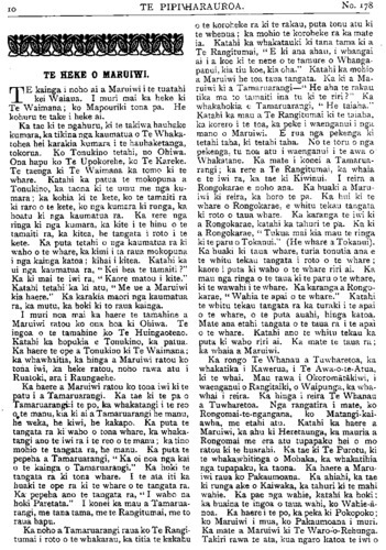 10 TE PIPIWHARAUROA. No.178 TE HEKE O MARUIWI. TE kainga i noho ai a Marui wi i te tuatahi kei Waiaua. I muri mai ka heke ki Te Waimana; ko Mapouriki tona pa. He kohuru te take i heke ai. Ka tae ki te ngahuru, ki te takiwa hauhake kumara, ka tikina nga kaumatua o Te Whaka- tohea hei karakia kumara i te hauhaketanga, tokorua. Ko Tonukino tetahi, no Ohiwa. Ona hapu ko Te Upokorehe, ko Te Kareke. Te taenga ki Te Waimana ka tomo ki te whare. Katahi ka patua te mokopuna a Tonukino, ka taona ki te umu me nga ku- mara; ka kohia ki te kete, ko te tamaiti ra ki raro o te kete, ko nga kumara ki runga, ka hoatu ki nga kaumatua ra. Ka rere nga ringa ki nga kumara, ka kite i te hinu o te tamaiti ra, ka kitea, he tangata i roto i te kete. Ka puta tetahi o nga kaumatua ra ki waho o te whare, ka kimi i ta raua mokopuna i nga kainga katoa kihai i kitea. Katahi ka ui nga kaumatua ra, " Kei hea te tamaiti?" Ka ki mai te iwi ra, " Kaore matou i kite." Katahi tetahi ka ki atu, "Me ue a Maruiwi kia haere." Ka karakia maori nga kaumatua ra, ka mutu, ka hoki ki to raua kainga. I muri noa mai ka haere te tamahine a Maruiwi ratou ko ona hoa ki Ohiwa. Te ingoa o te tamahine ko Te Huingaoteao. Katahi ka hopukia e Tonukino, ka patua. Ka haere te ope a Tonukino ki Te Waimana; ka whawhaitia, ka hinga a Maruiwi ratou ko tona iwi, ka heke ratou, noho rawa atu i Ruatoki, ara i Raungaehe. Ka haere a Maruiwi ratou ko tona iwi ki te patu i a Tamaruarangi. Ka tae ki te pa o Tamaruarangi te po, ka whakatangi i te reo o te manu, kia ki ai a Tamaruarangi he manu, he weka, he kiwi, he kakapo. Ka puta te tangata ra ki waho o tona whare, ka whaka- tangi ano te iwi ra i te reo o te manu ka tino mohio te tangata ra, he manu. Ka puta te pepeha a Tamaruarangi, " Ka oi noa nga kai o te kainga o Tamaruarangi." Ka hoki te tangata ra ki tona whare. I te ata iti ka huaki te ope ra ki te whare o te tangata ra. Ka pepeha ano te tangata ra, "I waho na hoki Paretata." I konei ka mau a Tamarua- rangi, me tana tama, me te Rangitumai, me to raua hapu. Ka noho a Tamaruarangi raua ko Te Rangi- tumai i roto o te whakarau, ka titia te. kakahu o te koroheke ra ki te rakau, puta tonu atu ki te whenua ka mohio te koroheke ra ka mate ia. Katahi ka whakatauki ki tana tama ki a Te Rangitumai, " E ki ana ahau, i whangai ai i a koe ki te nene o te tamure o Whanga- panui, kia tiu koe, kia oha." Katahi ka mohio a Maruiwi he toa taua tangata. Ka ki a Ma- ruiwi ki a Tamaruarangi—" He aha te rakau tika ma to tamaiti ina tu ki te riri?" Ka whakahokia e Tamaruarangi, " He taiaha." Katahi ka mau a Te Rangitumai ki te taiaha, ka korero i te toa, ka peke i waenganui i nga mano o Maruiwi. E rua nga pekenga ki tetahi taha, ki tetahi taha. No te toru o nga pekenga, tu noa atu i waenganui i te awa o Whakatane. Ka mate i konei a Tamarua- rangi; ka rere a Te Rangitumai, ka whaia e te iwi ra, ka tae ki Kiwinui. I reira a Rongokarae e noho ana. Ka huaki a Maru- iwi ki reira, ka horo te pa. Ka hui ki te whare o Rongokarae, e whitu tekau tangata ki roto o taua whare. Ka karanga te iwi ki a Rongokarae, katahi ka tahuri te pa. Ka ki a Rongokarae, " Tukua mai kia mau te ringa ki te paru o Tokanui." (He whare a Tokanui). Ka huaki ki taua whare, turia tonutia ana e te whitu tekau tangata i roto o te whare kaore i puta ki waho o te whare riri ai. Ka mau nga ringa o te taua ki te paru o te whare, ki te wawahi i te whare. Ka karanga a Rongo- karae, " Wahia te apai o te whare." Katahi te whitu tekau tangata ra ka turaki i te apai o te whare, o te puta auahi, hinga katoa. Mate ana etahi tangata o te taua ra i te apai o te whare. Katahi ano te whitu tekau ka puta ki waho riri ai. Ka mate te taua ra; ka whaia a Maruiwi. Ka rongo Te Whanau a Tuwharetoa, ka whakatika i Kawerua, i Te Awa-o-te-Atua, ki te whai. Mau rawa i Okoromatakiwi, i waenganui o Rangitaiki, o Waipunga, ka wha- whai i reira. Ka hinga i reira Te Whanau a Tuwharetoa. Nga rangatira i mate, ko Rongomai-te-ngangana, ko Matangi-kai- awha, me etahi atu. Katahi ka haere a Maruiwi, ka ahu ki Heretaunga, ka mauria a Rongomai me era atu tupapaku hei o mo ratou ki te huarahi. Ka tae ki Te Purotu, ki te whakawhitinga o Mohaka, ka whakatihia nga tupapaku, ka taona. Ka haere a Maru- iwi raua ko Pakaumoana. Ka ahiahi, ka tae ki runga ake o Kaiwaka, ka tahuri ki te mahi wahie. Ka pae nga wahie, katahi ka hoki ka huaina te ingoa o taua wahi, ko Wahie-a- noa. Ka haere i te po, ka peka ki Pokopoko ko Maruiwi i mua, ko Pakaumoana i muri. Ka mate a Maruiwi ki Te Waro-'o-Rehunga. Takiri rawa te ata, kua ngaro katoa te iwi o