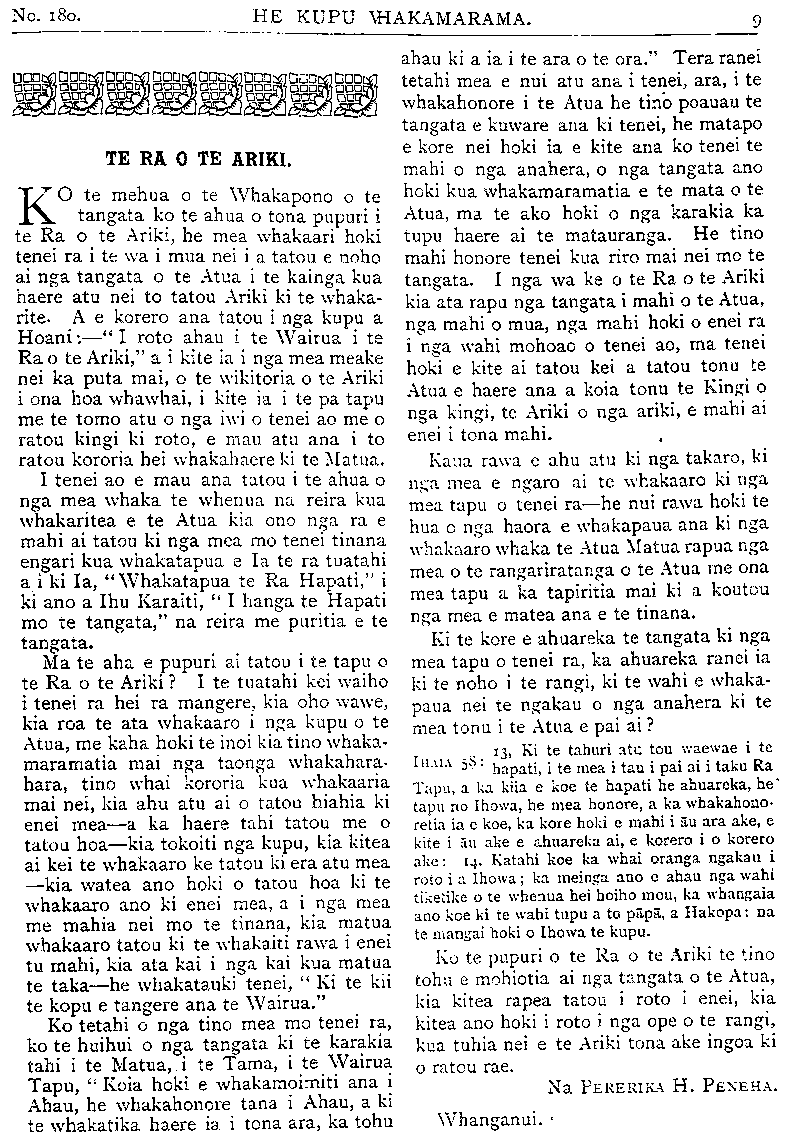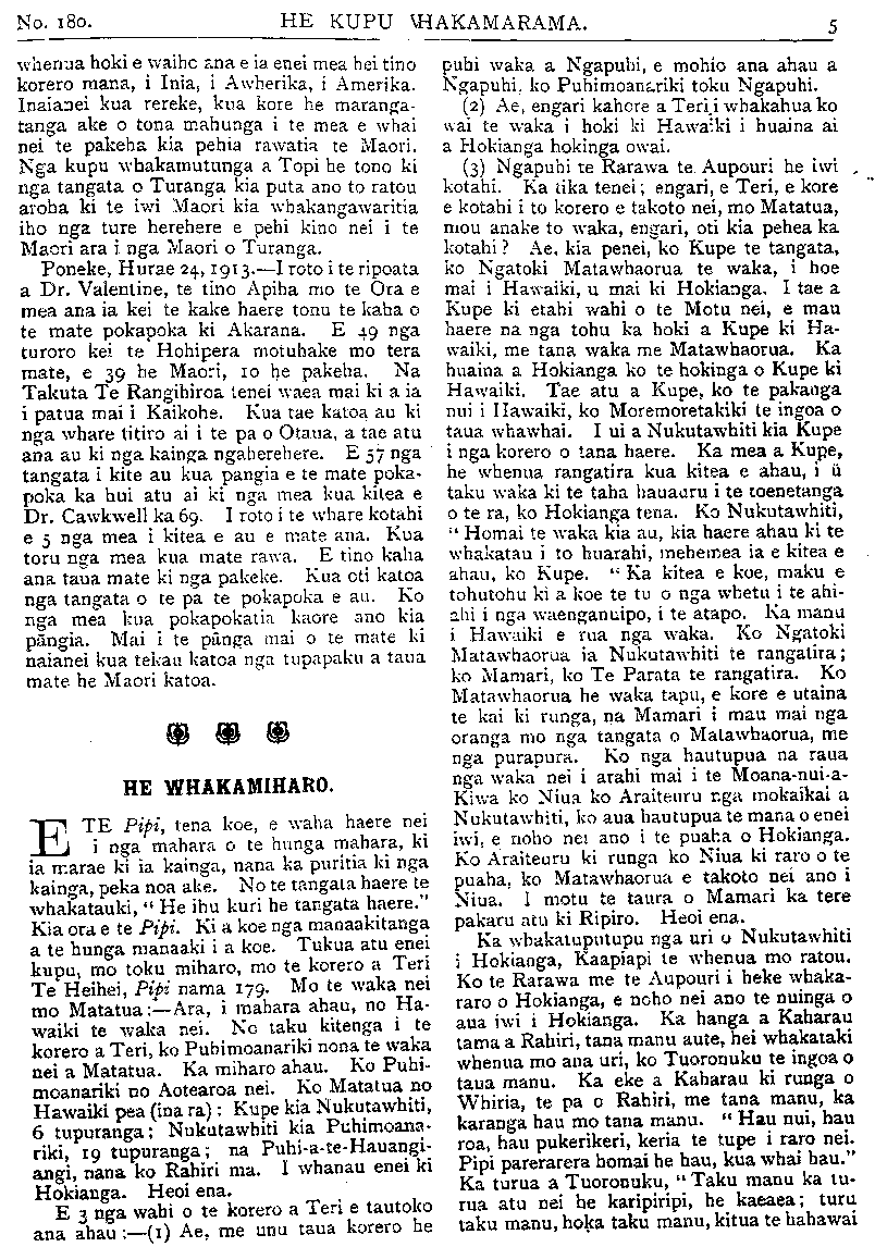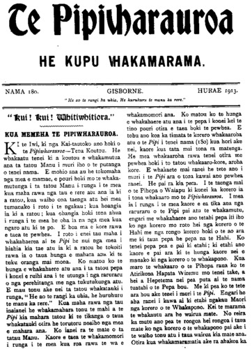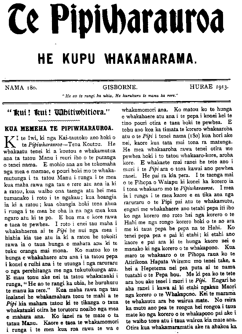Te Pipiwharauroa HE KUPU WHAKAMARAMA. NAMA 180. GISBORNE. " He ao te rangi ka uhia, He huruhuru te manu ka rere." HURAE 1913 "Kui! Kui! Whitiwhitiora." KUA MEMEHA TE PIPIWHARAUROA. KI te Iwi, ki nga Kai-tautoko ano hoki o te Pipiwharauroa Tena Koutou. He whakaatu tenei ki a koutou e whakamutua ana ta tatou Manu i muri iho o te putanga o tenei nama. E mohio ana au he tokomaha nga mea e mamae, e pouri hoki mo te whaka- mutunga i ta tatou Manu i- runga i te mea kua maha rawa nga tau e rere atu ana ia ki a ratou, kua waiho ona taenga atu hei mea tumanako i roto i te ngakau; kua hoangia a ia ki a ratou; kua ohangia hoki tona ahua i runga i te mea he oha ia na nga mea kua ngaro atu ki te po. E hoa ma e kore rawa e taea te pewhea. I roto i enei tau maha i whakahaerea ai te Pipi he nui nga mea i hiahia kia tae atu ia ki a ratou he tokoiti rawa ia o taua hunga e mahara ana ki te tuku oranga mai mona. Ko matou ko te hunga e whakahaere atu ana i ta tatou pepa i konei e ruihi ana i te utunga i nga raruraru o nga perehitanga me nga tukutukunga atu. E mau tonu ake nei ta tatou whakatauki i runga, " He ao te rangi ka uhia, he huruhuru te manu ka rere." Kua maha rawa nga tau inaianei he whakamahara tonu te mahi a te Pipi kia mahara tatou ki te tikanga o taua whakatauki otira he torutoru noaiho nga mea e mahara ana. Ko ianei ra te mate o ta tatau Manu. Kaore e taea te whakamomori i runga i te mea kua roa rawa te wa e whakamomori ana. Ko matou ko te hunga e whakahaere atu ana i te pepa i konei kei te tino pouri otira e taea hoki te pewhea. E tohu ano koa ka timata te korero whakaaroha atu o te Pipi i tenei nama (180) kua hori ake nei, kaore kua tata mai tona ra matenga. He mea whakaaroha rawa tenei otira me pewhea hoki i to tatou whakaaro-kore, aroha kore. E whakaete mai ranei he tete ano i muri i te Pipi ara o tona kawai ano pewhea ranei. He pai ra kia pera. I te taenga mai o te Pihopa o Waiapu ki konei ka korero ia i tona whakaaro mo te Pipiwharauroa. I mea ia i runga i te mea kaore e ea tika ana nga raruraru o te Pipi pai atu te whakamutu, engari me whakahaere ano tetahi pepa iti iho ko nga korero mo roto hei nga korero o te Hahi me nga rongo korero hoki o te ao ara me ki taua pepa he pepa na te Hahi. Ko tenei pepa pea e pai ki etahi ki etahi ano kaore e pai ara ki te hunga kaore nei e manako ki nga korero o te whakapono. Kua maro te whakaaro o te Pihopa raua ko te Atirikona Hapata VViremu mo tenei take, a hei a Hepetema nei pea puta ai te nama tuatahi o te Pepa hou. Me ki pea ko te tete ara hou ake tenei i muri i te Pipi. Engari he aha ranei i kawa ai ki etahi ngakau Maori nga korero o te Whakapono. Kei te marama te whakautu ara he wairua mate. No reira ka mutu ano pea te rongoa hei rongoa i taua mate ko nga korero o te whakapono pai ake i te waiho tonu atu i taua wairua kia mate ana. Otira kua whakamaramatia ake ra ahakoa ka