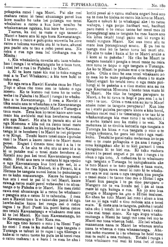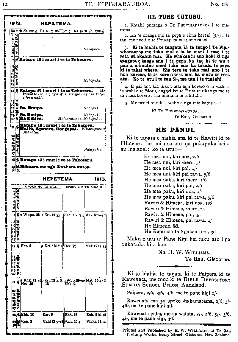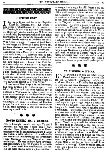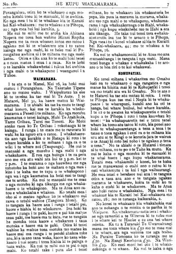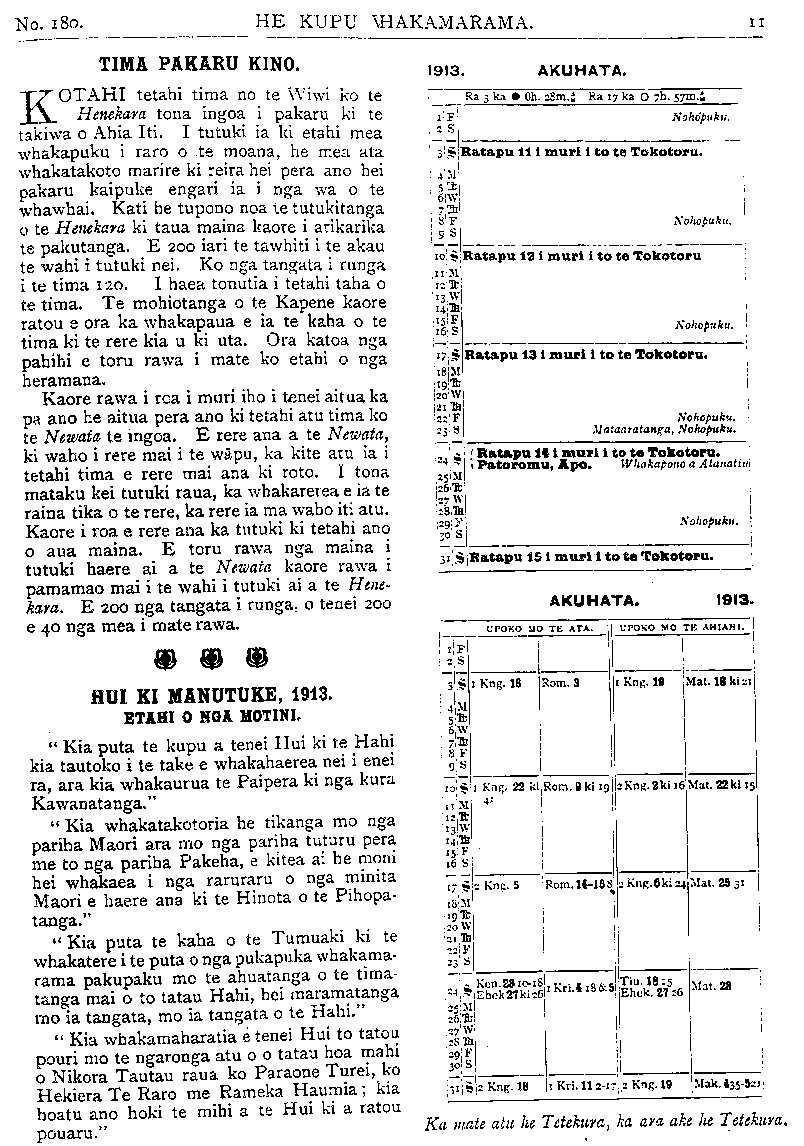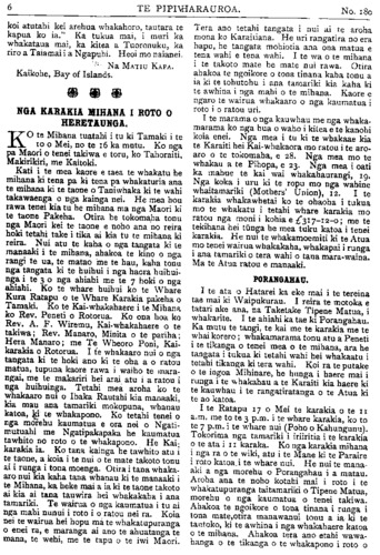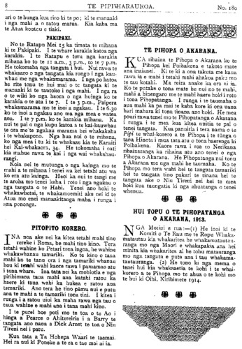 HE KUPU WHAKAMARAMA. TIMA PAKARU KINO. KOTAHI tetahi tima no te Wiwi ko te Henekara tona ingoa i pakaru ki te takiwa o Ahia Iti. I tutuki ia ki etahi mea whakapuku i raro o te moana, he mea ata whakatakoto marire ki reira hei pera ano hei pakaru kaipuke engari ia i nga wa o te whawhai. Kati he tupono noa te tutukitanga o te Henekara ki taua maina kaore i arikarika te pakutanga. E 200 iari te tawhiti i te akau te wahi i tutuki nei. Ko nga tangata i runga i te tima 120. I haea tonutia i tetahi taha o : te tima. Te mohiotanga o te Kapene kaore ratou e ora ka whakapaua e ia te kaha o te tima ki te rere kia u ki uta. Ora katoa nga pahihi e toru rawa i mate ko etahi o nga heramana. Kaore rawa i roa i muri iho i tenei aitua ka pa ano he aitua pera ano ki tetahi atu tima ko te Newata te ingoa. E rere ana a te Newata, ki waho i rere mai i te wapu, ka kite atu ia i tetahi tima e rere mai ana ki roto. I tona mataku kei tutuki raua, ka whakarerea e ia te raina tika o te rere, ka rere ia ma waho iti atu. Kaore i roa e rere ana ka tutuki ki tetahi ano o aua maina. E toru rawa nga maina i tutuki haere ai a te Newata kaore rawa i pamamao mai i te wahi i tutuki ai a te Hene- kara,. E 200 nga tangata i runga, o tenei 200 e 40 nga mea i mate rawa. HUI KI MANUTUKE, 1913. ETAHI O NGA MOTINI. " Kia puta te kupu a tenei Hui ki te Hahi kia tautoko i te take e whakahaerea nei i enei ra, ara kia whakaurua te Paipera ki nga kura Kawanatanga." " Kia whakatakotoria he tikanga mo nga pariha Maori ara mo nga pariha tuturu pera me to nga pariha Pakeha, e kitea ai he moni hei whakaea i nga raruraru o nga minita Maori e haere ana ki te Hinota o te Pihopa- tanga." "Kia puta te kaha o te Tumuaki ki te whakatere i te puta o nga pukapuka whakama- rama pakupaku mo te ahuatanga o te tima- tanga mai o to tatau Hahi, hei maramatanga mo ia tangata, mo ia tangata o te Hahi." ''' Kia whakamaharatia e tenei Hui to tatou pouri mo te ngaronga atu o o tatau hoa mahi o Nikora Tautau raua ko Paraone Turei, ko Hekiera Te Raro me Rameka Haumia kia hoatu ano hoki te mihi a te Hui ki a ratou pouaru."